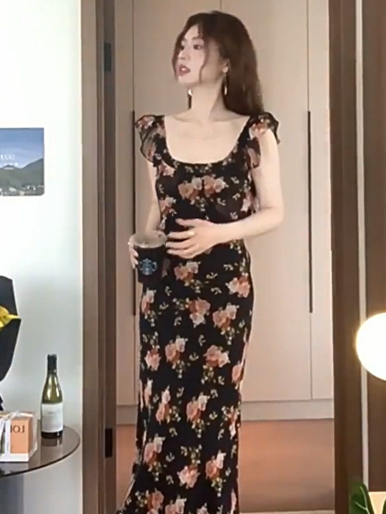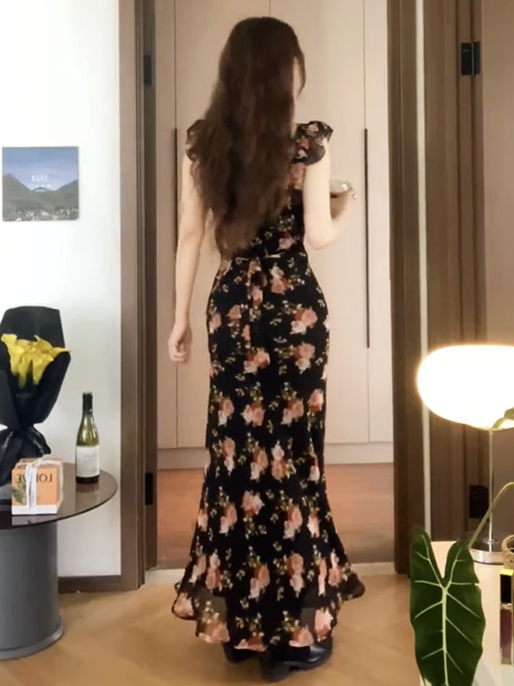 Черное летнее платье, длинная юбка, цветочный принт, подходит для подростков, французский стиль