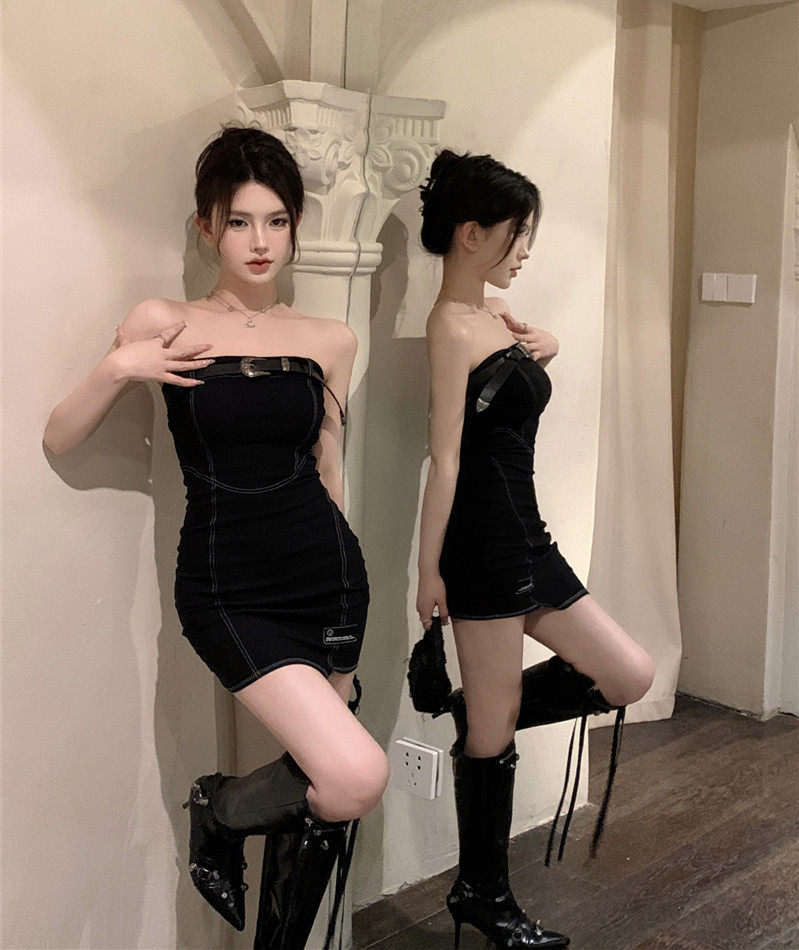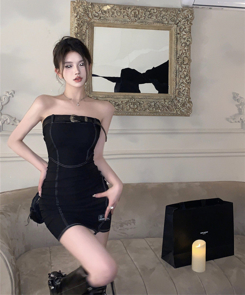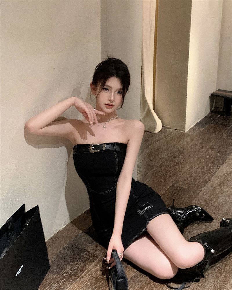 Сексуальный черный бюстгальтер-топ, короткая юбка, корсет, поясная сумка, мини-юбка, открытые плечи, с акцентом на бедрах