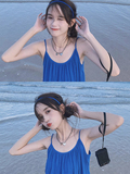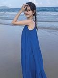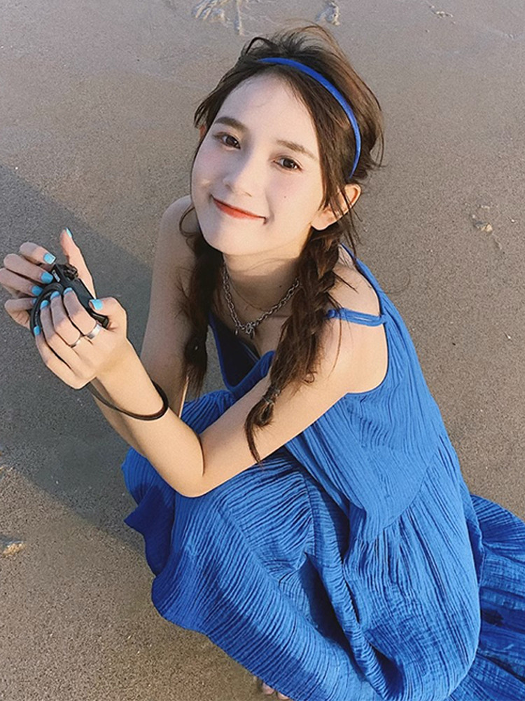 Синее летнее небольшое дизайнерское платье, пляжная длинная юбка, французский стиль, тренд сезона, подходит для подростков