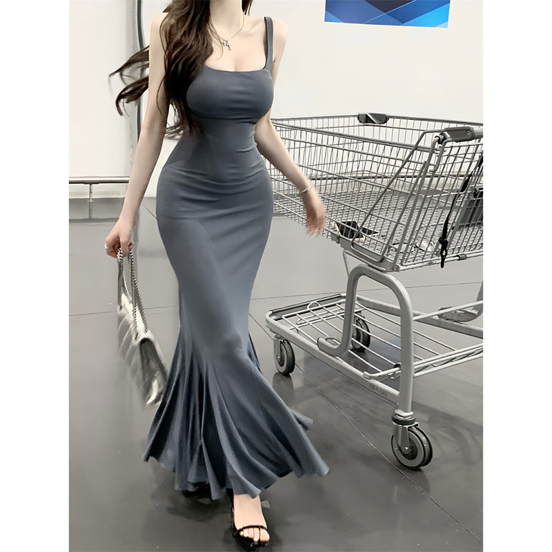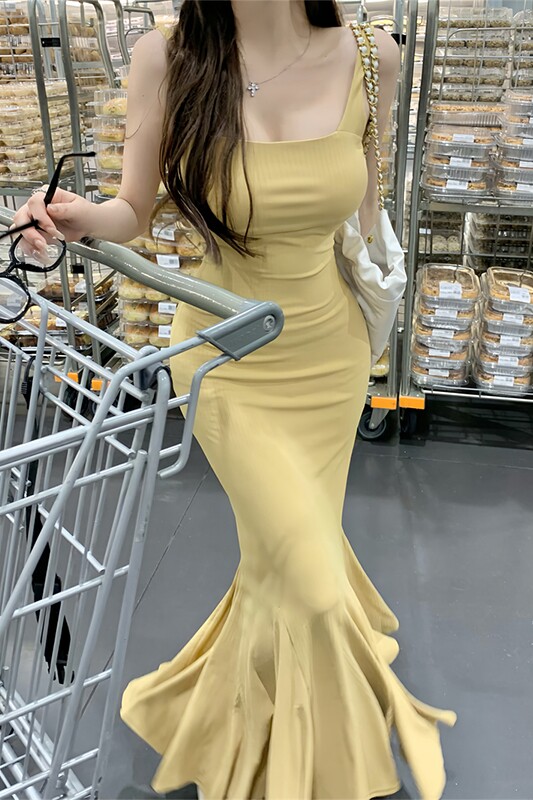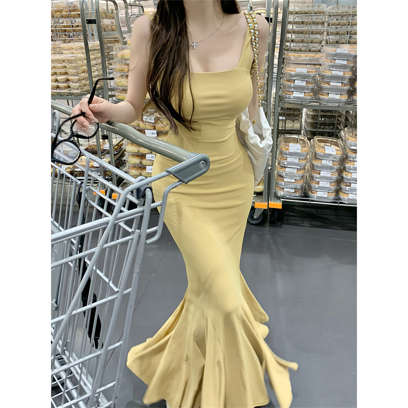 Летнее платье, приталенная длинная юбка, французский стиль, квадратный вырез, с открытой спиной, крой «рыбий хвост»