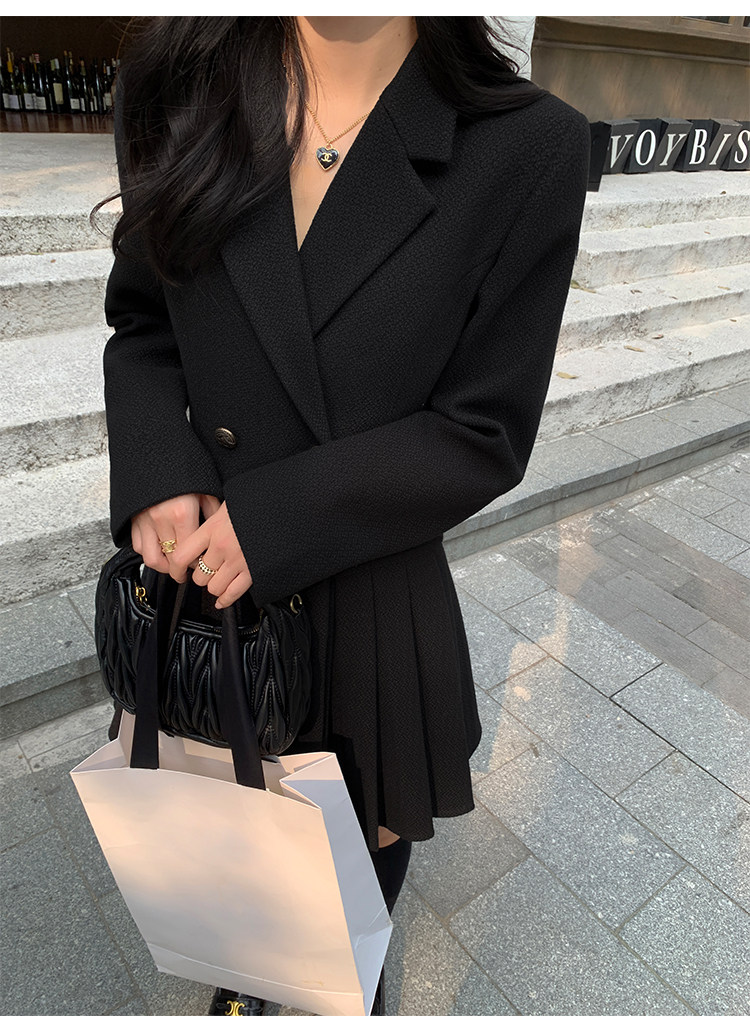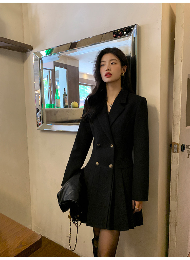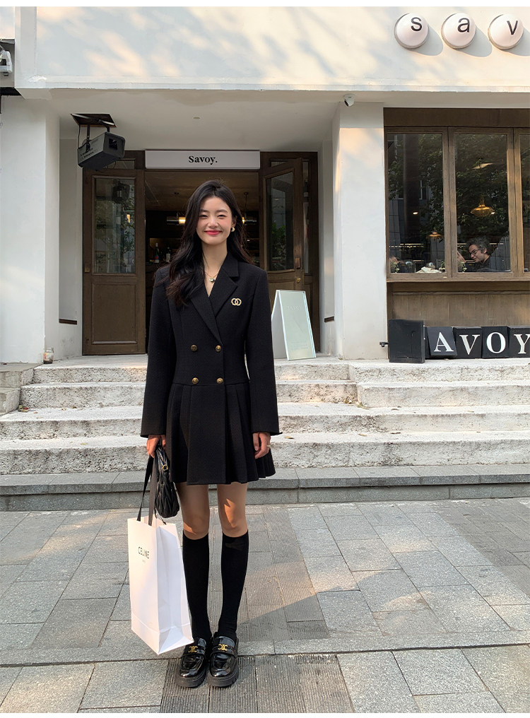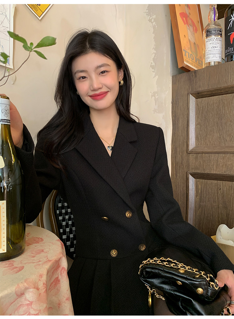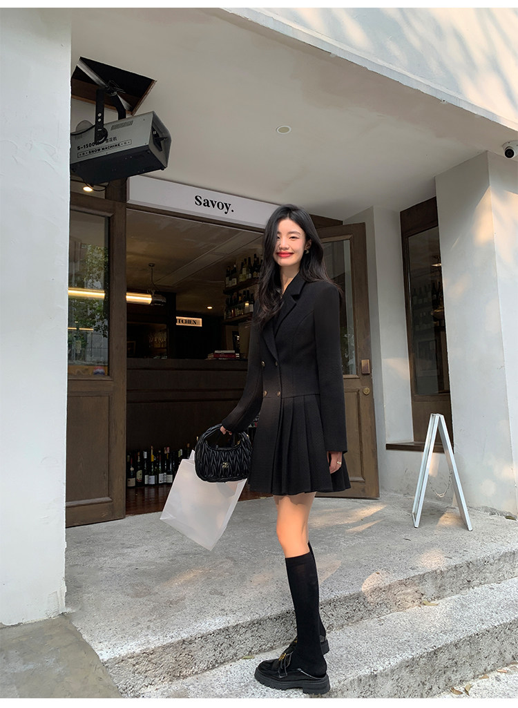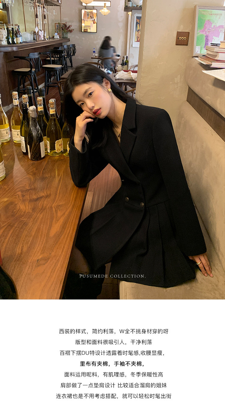 pusumede Черный шерстяной костюм, платье, приталенный корсет, юбка в складку, изысканный стиль, А-силуэт