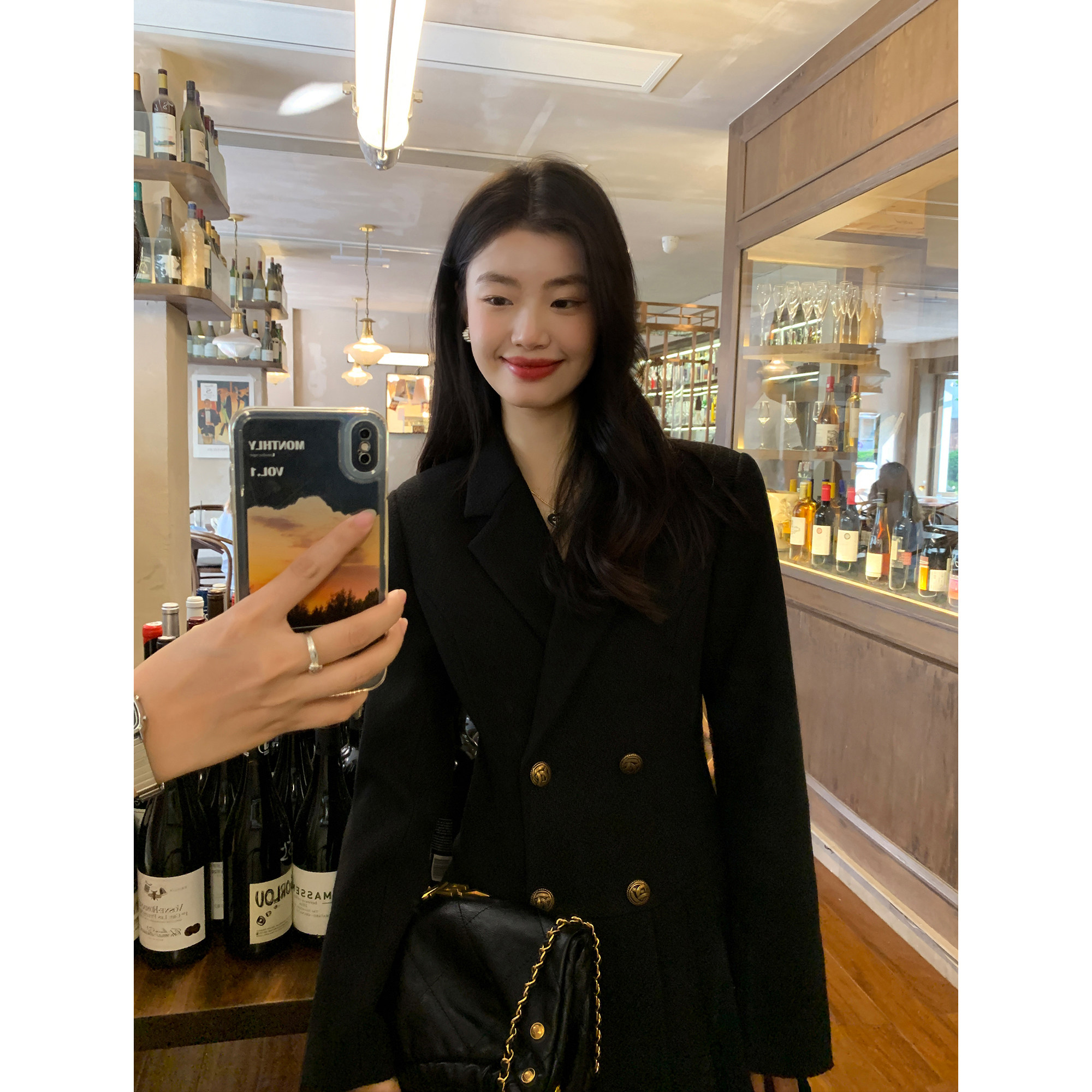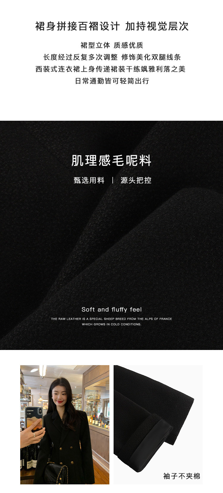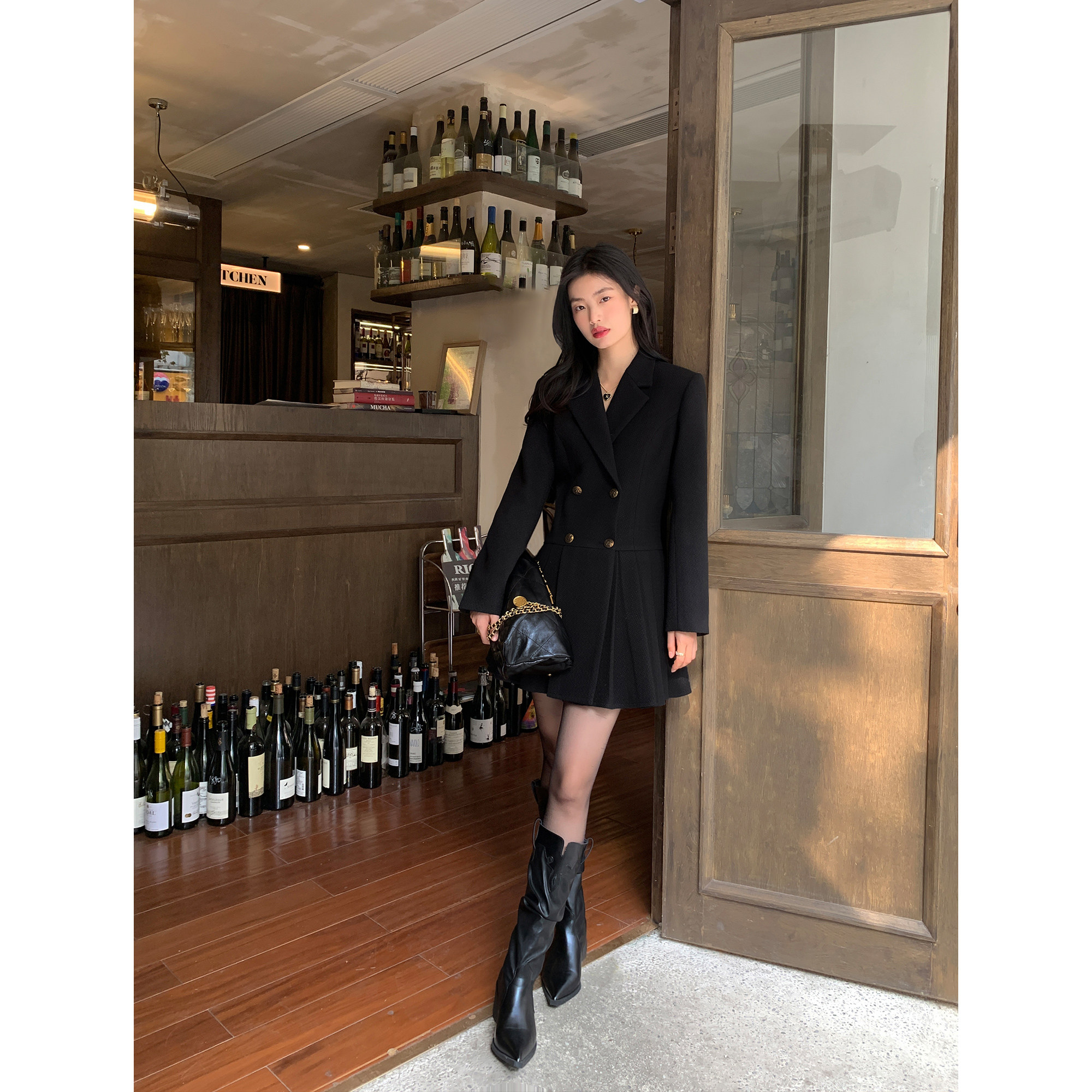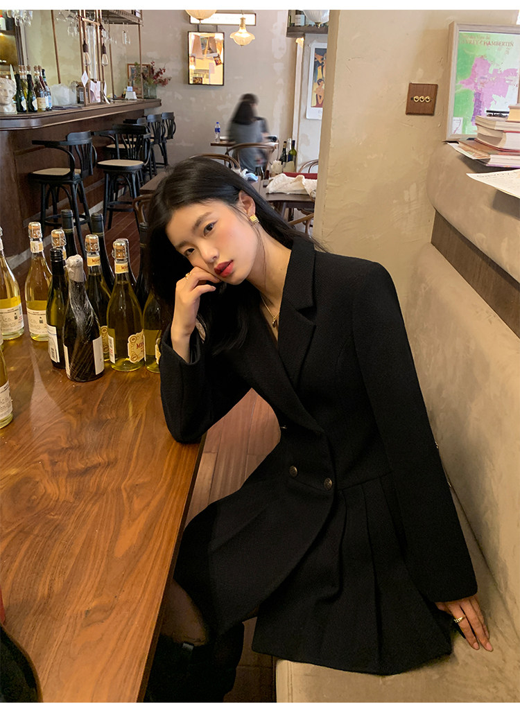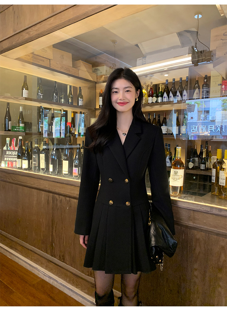 pusumede Черный шерстяной костюм, платье, приталенный корсет, юбка в складку, изысканный стиль, А-силуэт