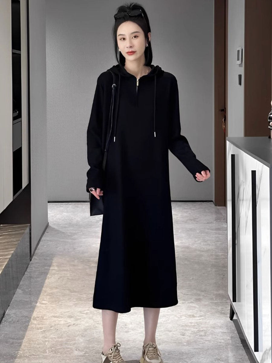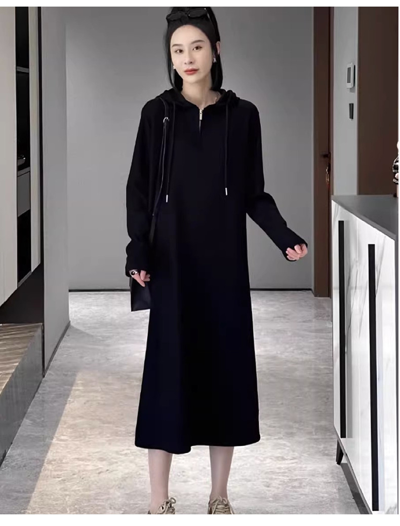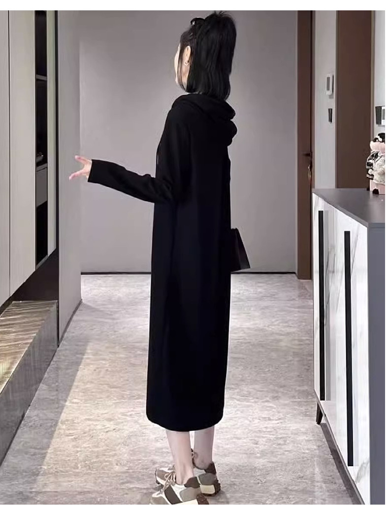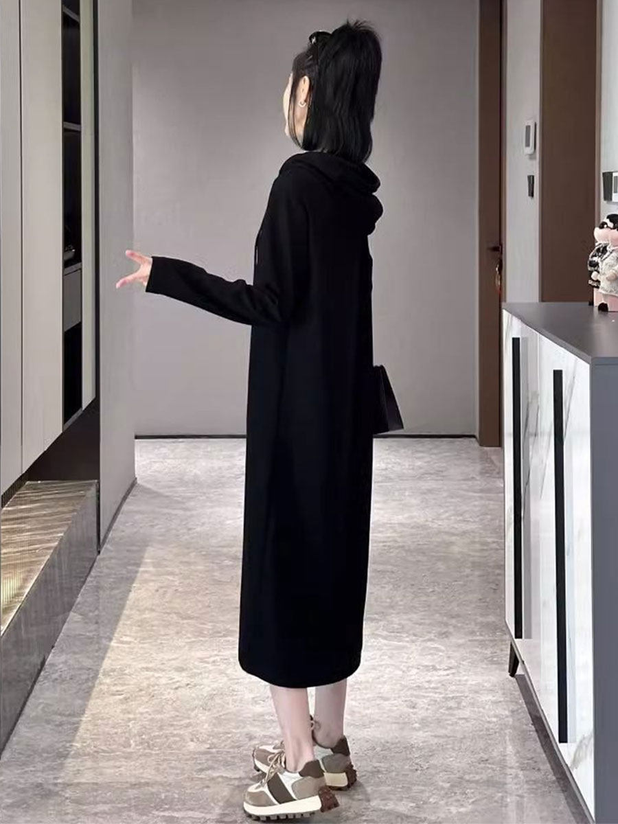 Черное осеннее трикотажное платье для отдыха с капюшоном, базовая толстовка, длинная юбка, оверсайз, коллекция 2023, по фигуре