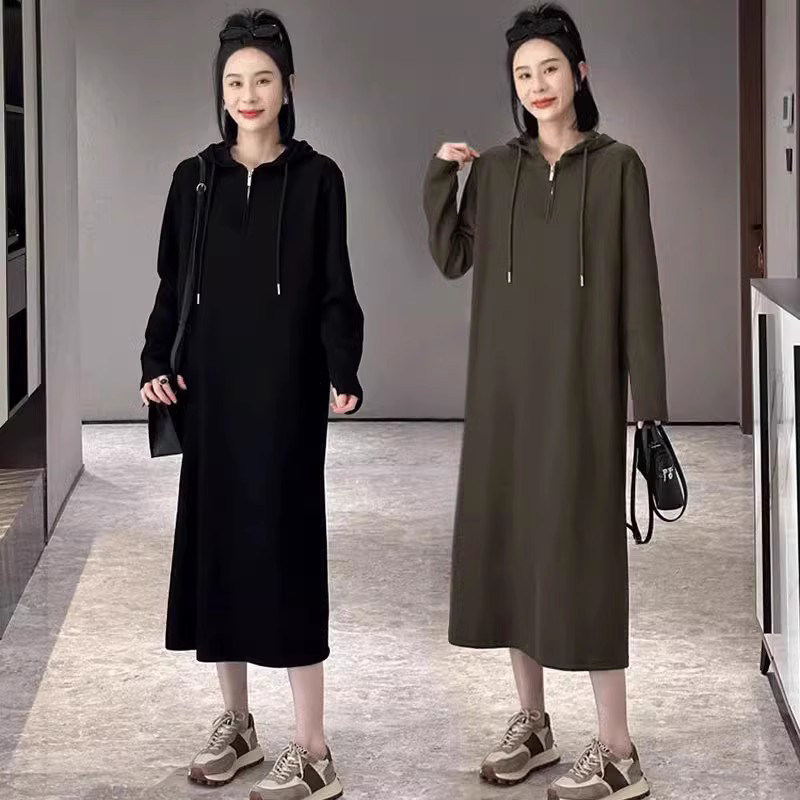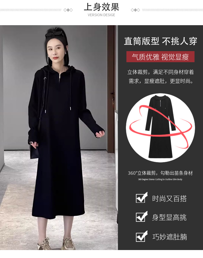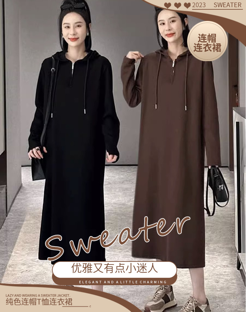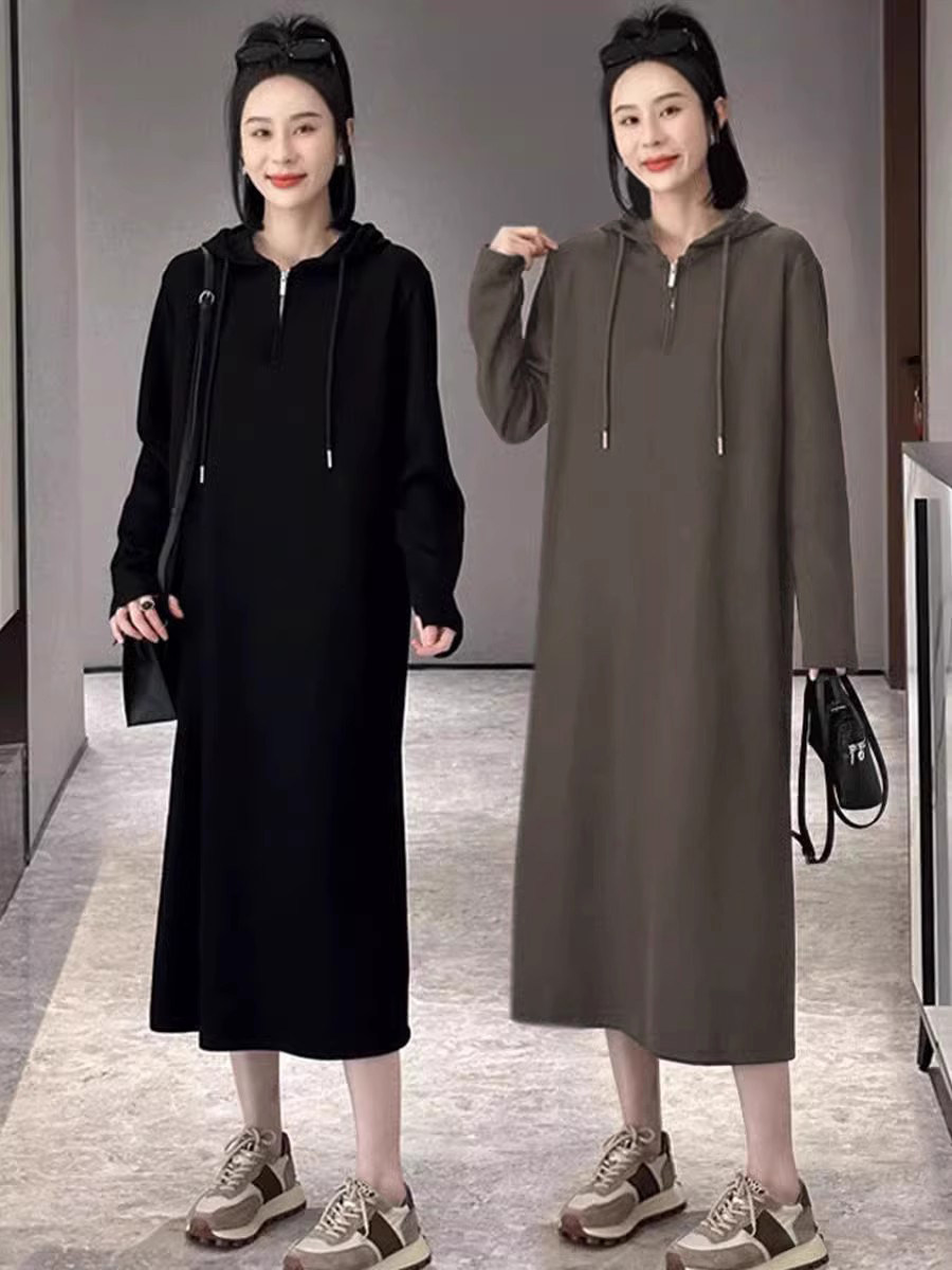 Черное осеннее трикотажное платье для отдыха с капюшоном, базовая толстовка, длинная юбка, оверсайз, коллекция 2023, по фигуре