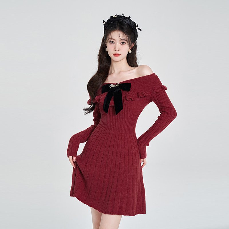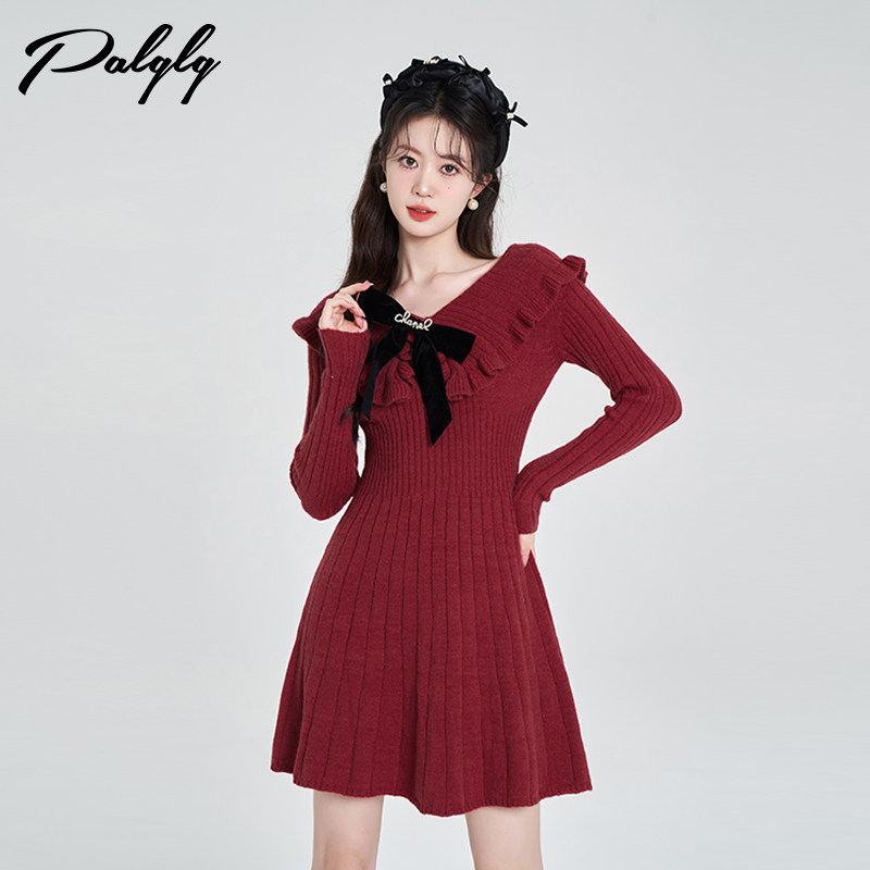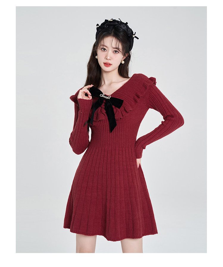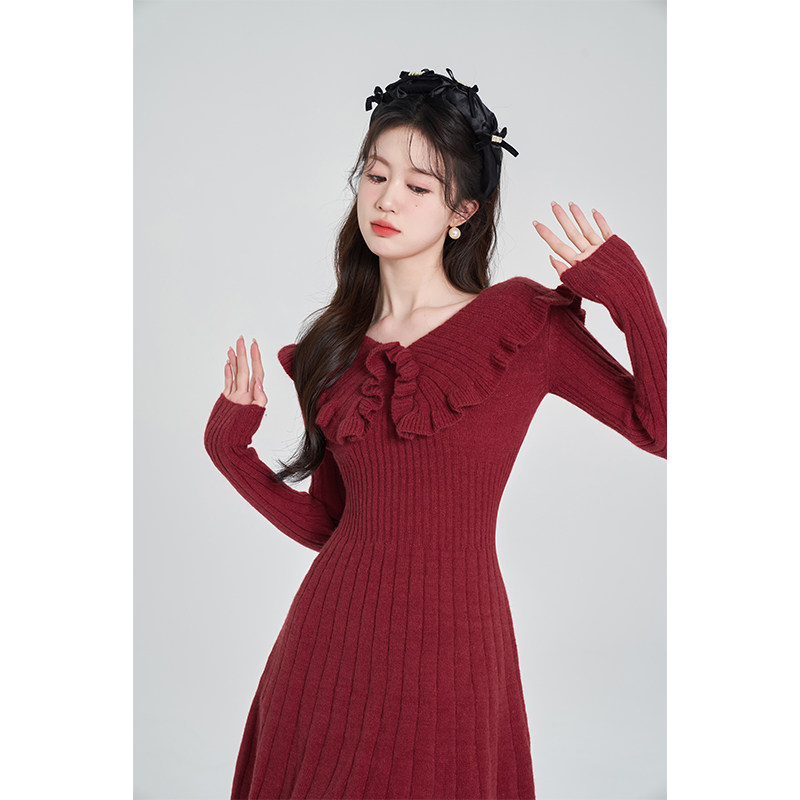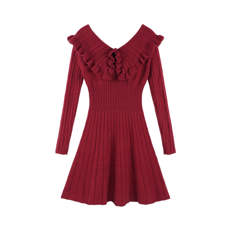 Красный трикотажный свитер, платье, V-образный вырез, французский стиль