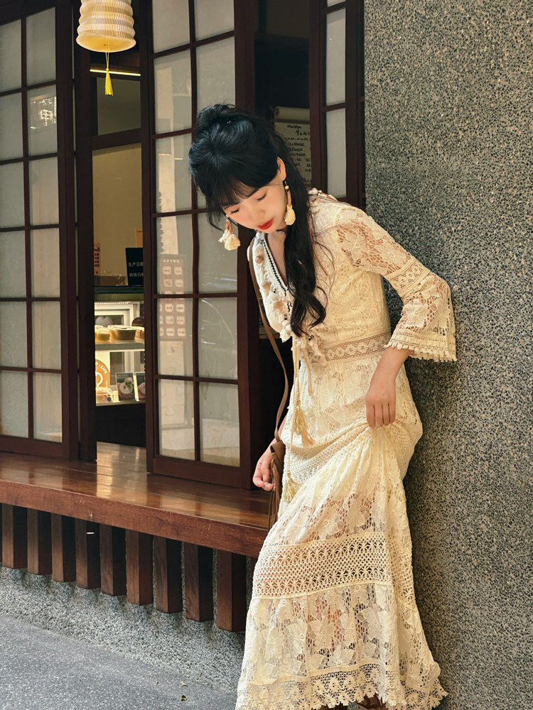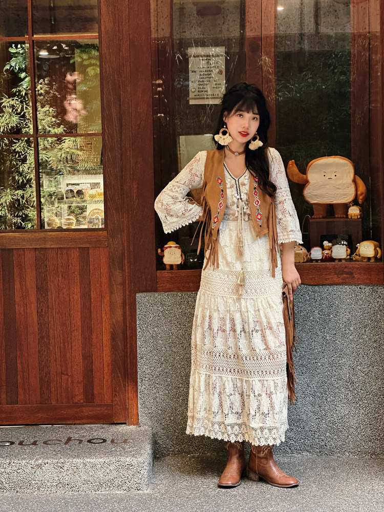 Кружевной жилет, длинная юбка, приталенное платье, с вышивкой, стиль бохо, высокая талия