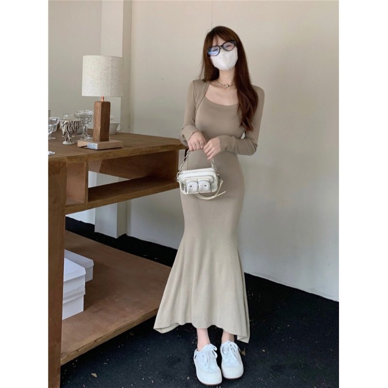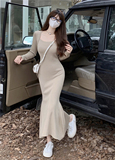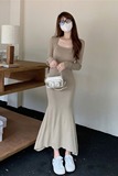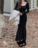 Демисезонный лонгслив, трикотажное платье, приталенный корсет, длинная юбка, французский стиль, квадратный вырез, коллекция 2023, с акцентом на бедрах, крой «рыбий хвост», длина макси
