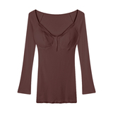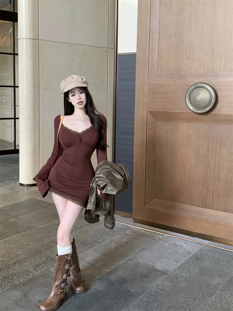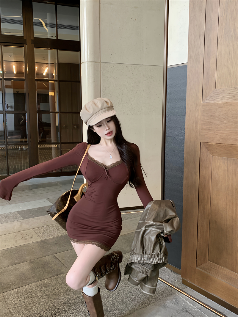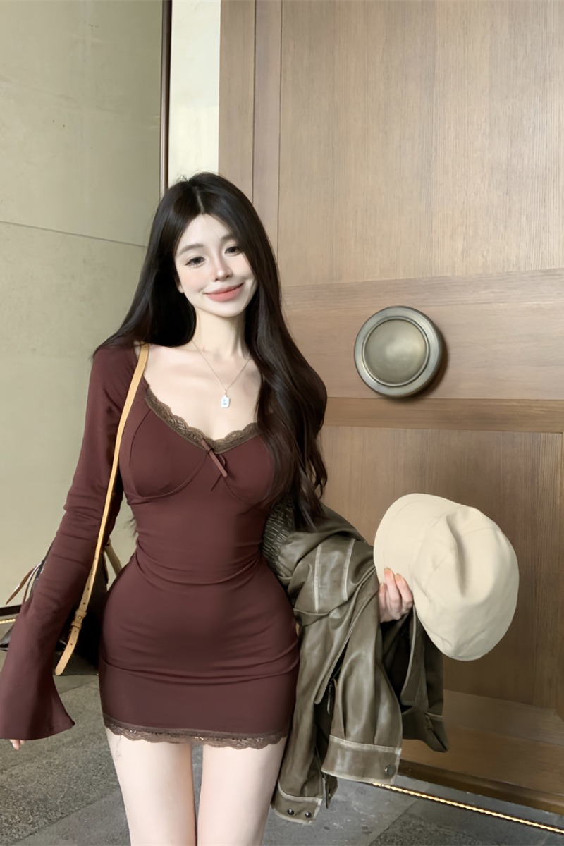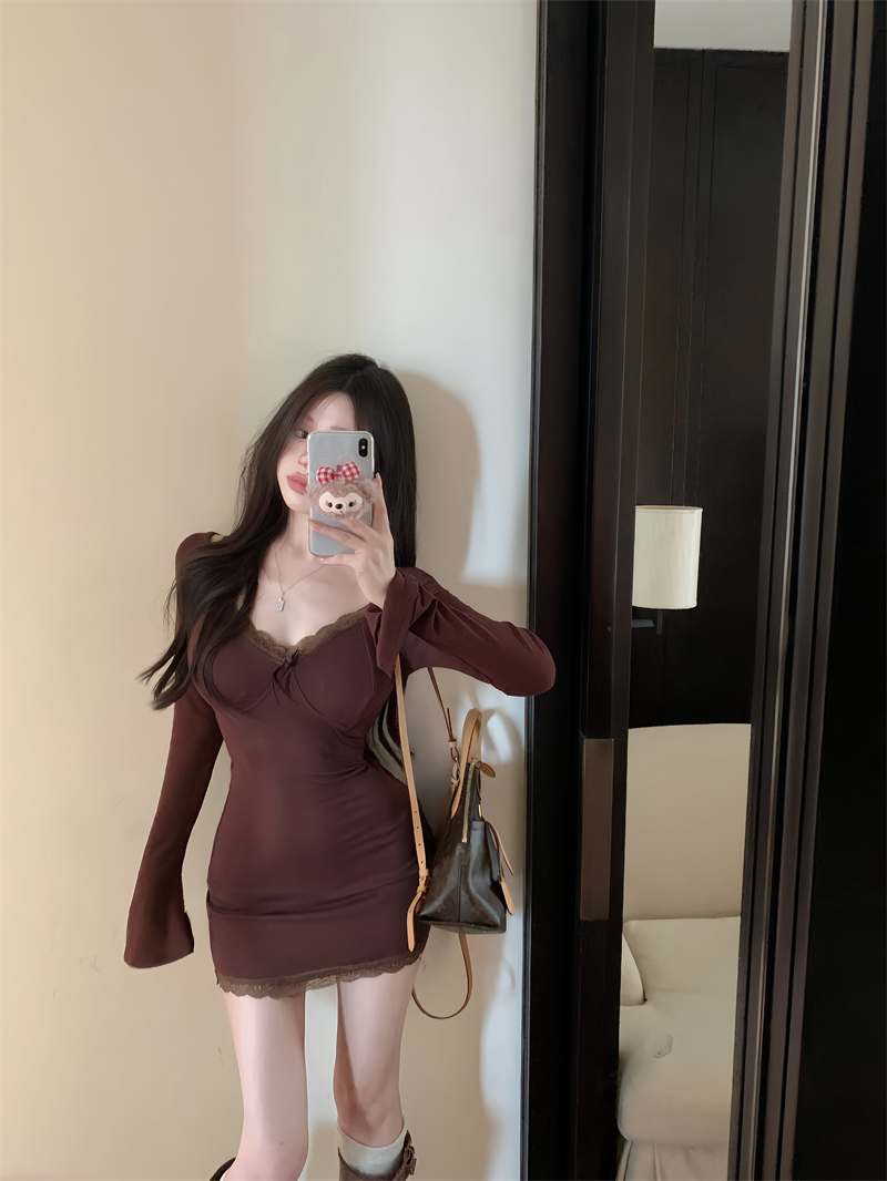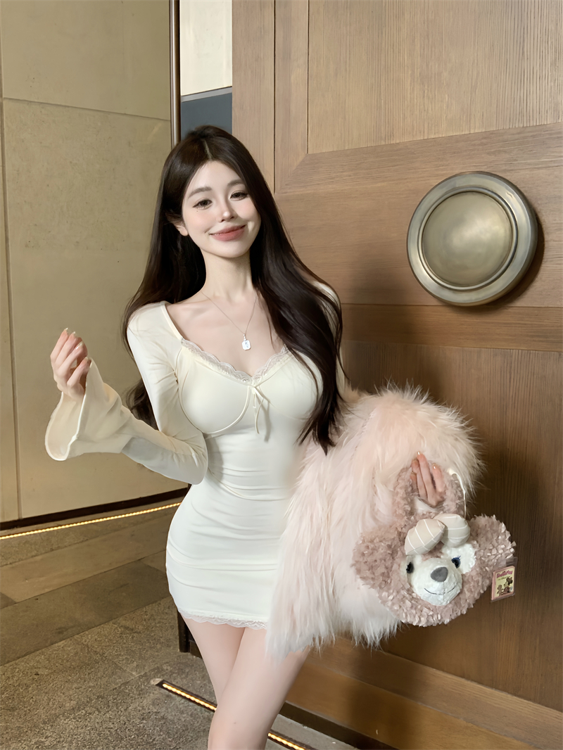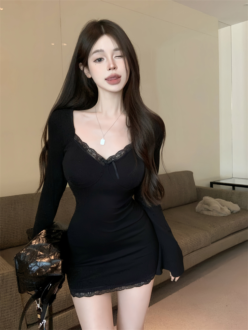 Сексуальное осеннее платье, лонгслив, мини-юбка, корсет, юбка, кружевное платье, V-образный вырез, в обтяжку, с акцентом на бедрах