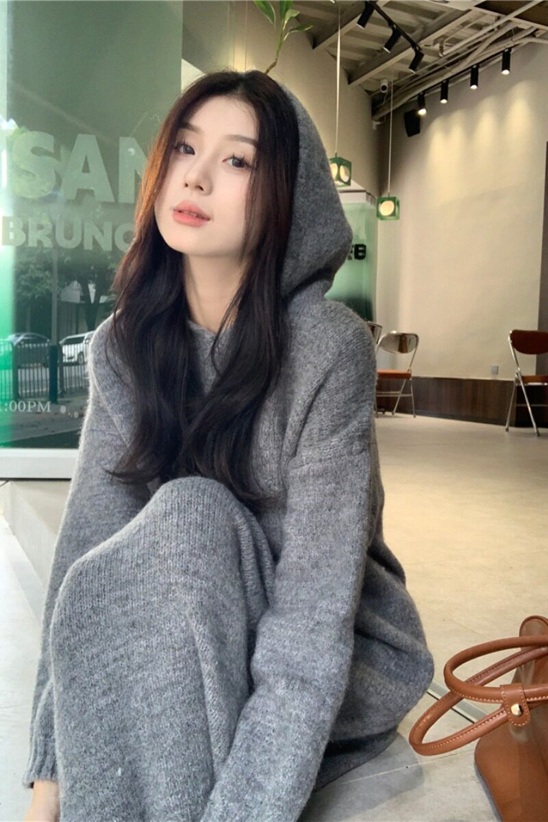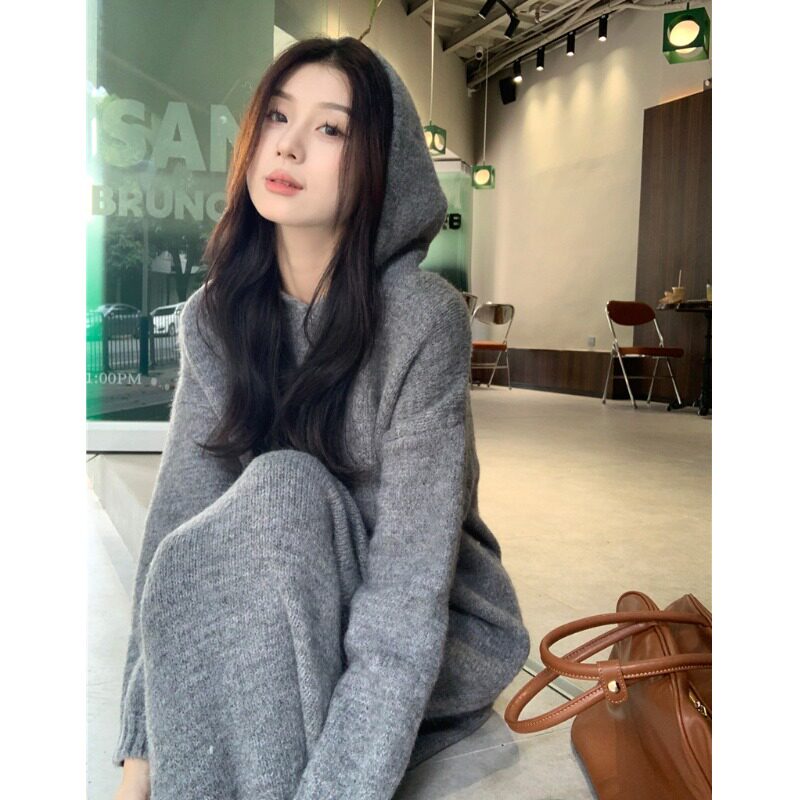 Модное длинное трикотажное шерстяное платье с капюшоном, большой размер, в корейском стиле