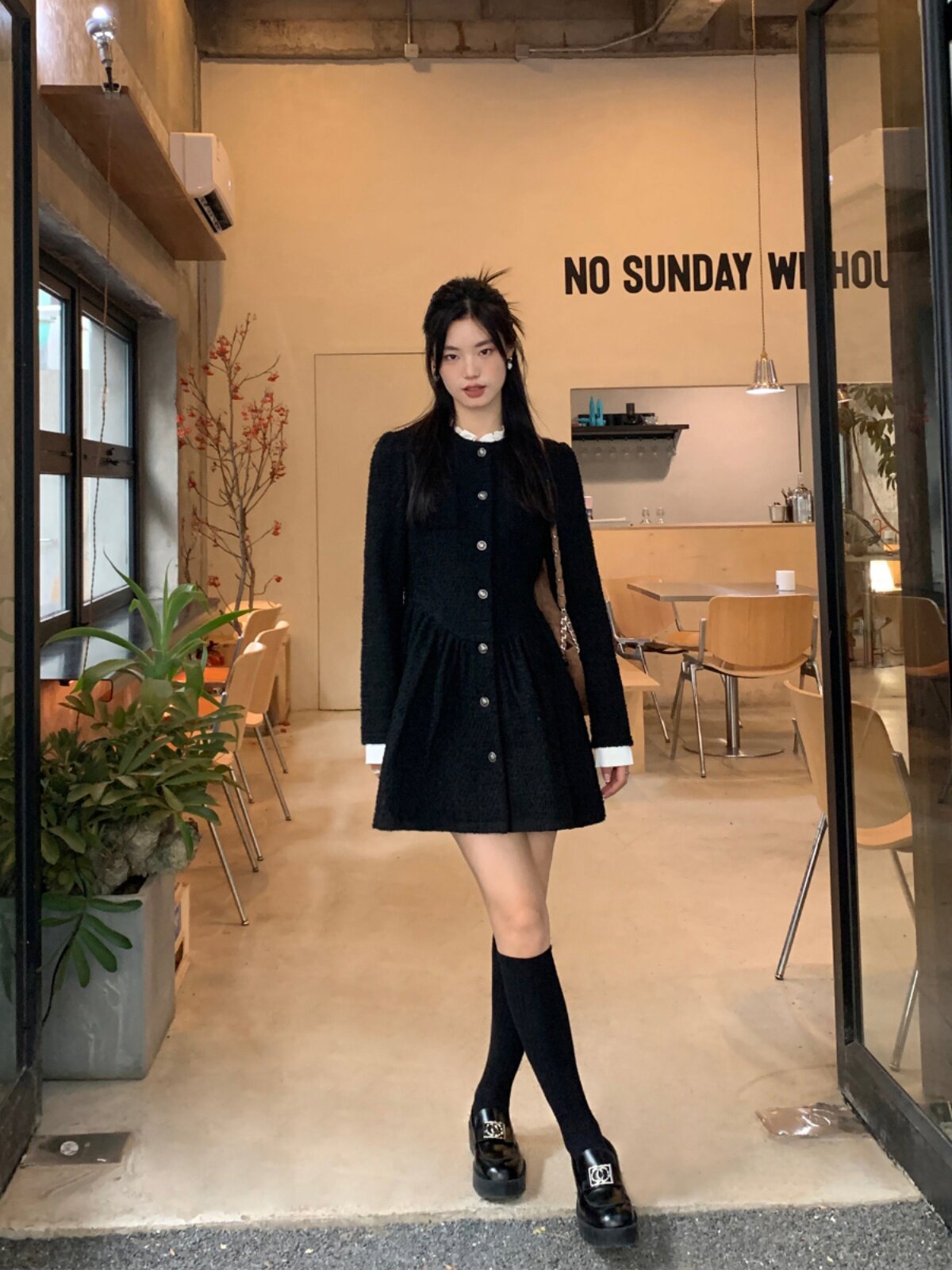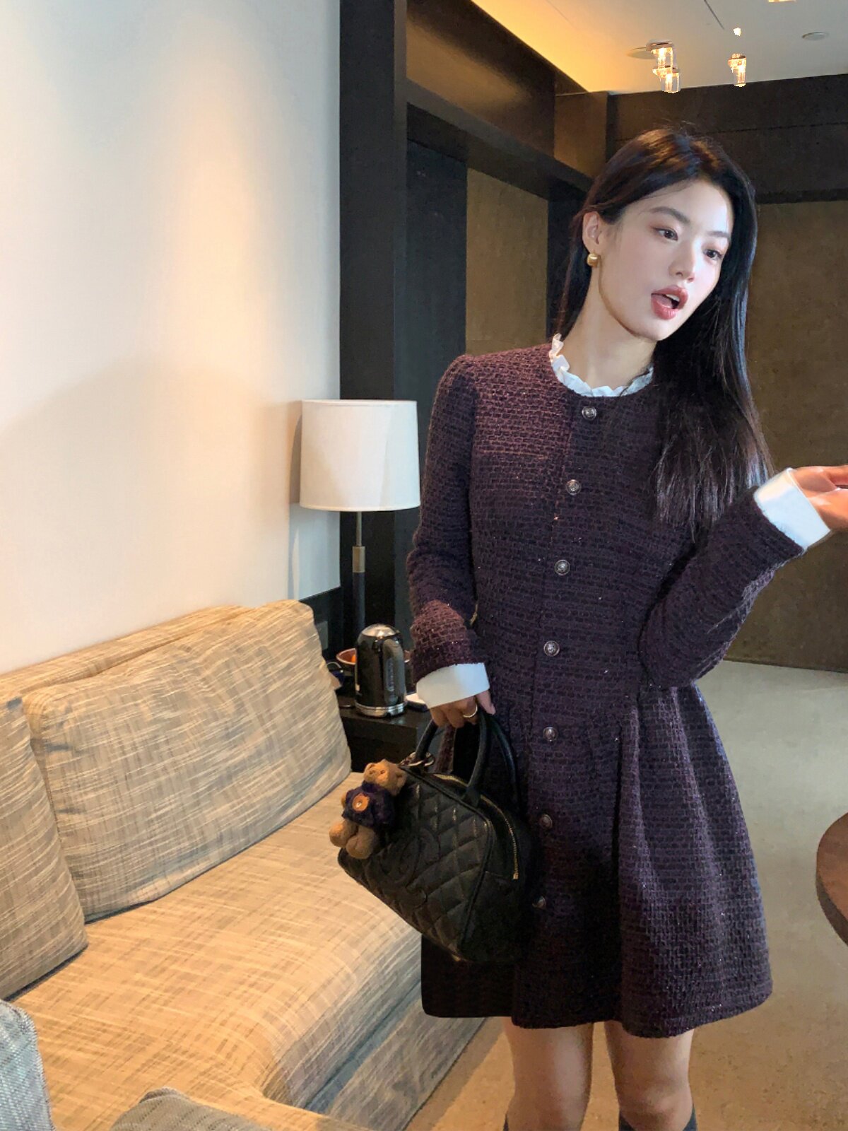 Черный комплект, приталенное платье, зимний корсет, мини-юбка, в стиле Шанель, изысканный стиль, яркий броский стиль