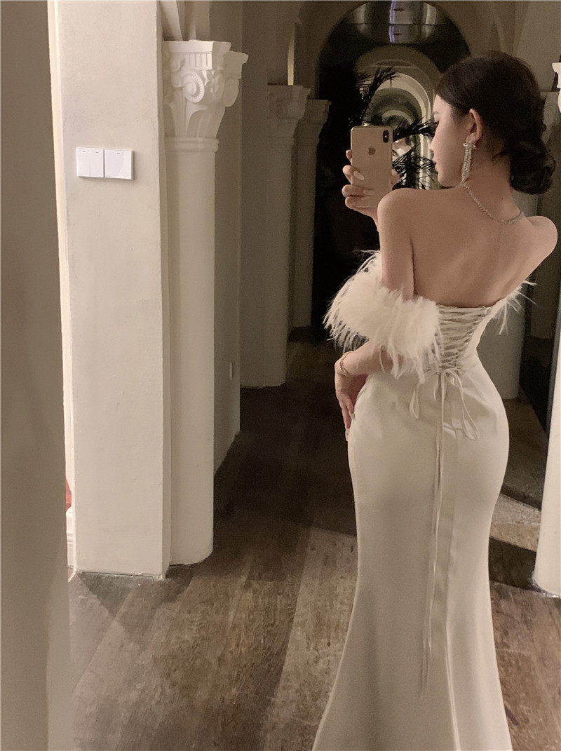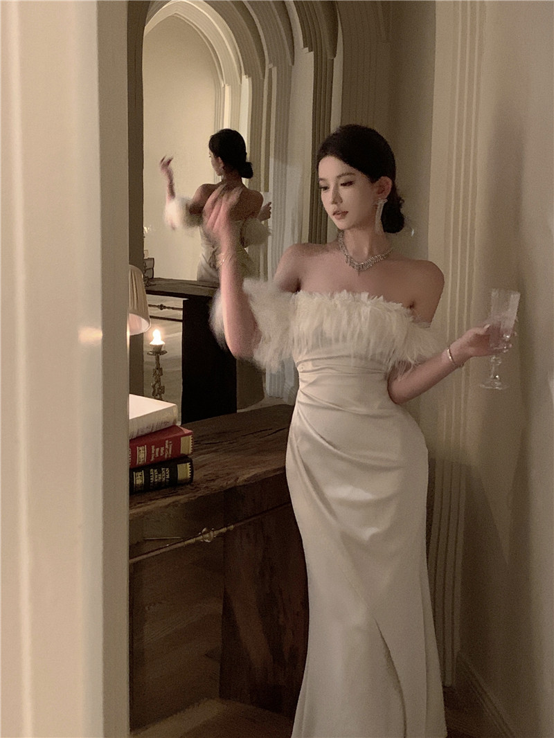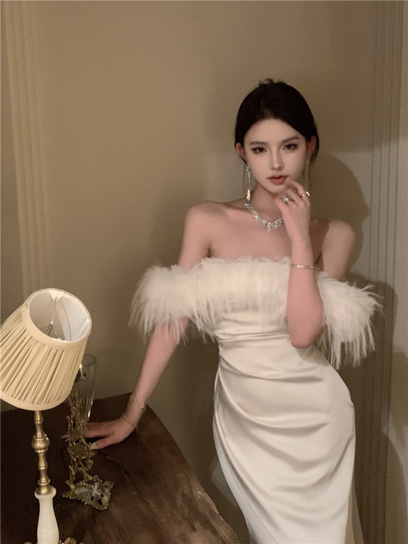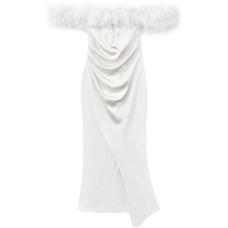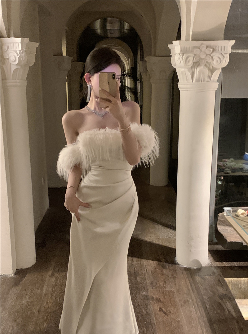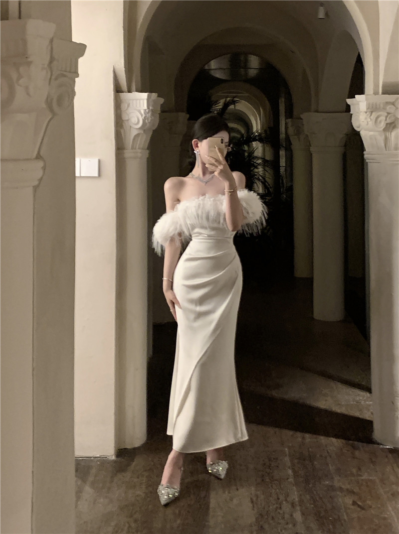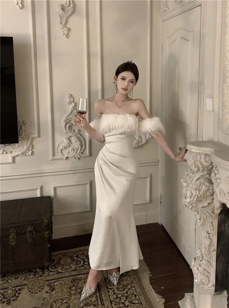 Белое осеннее платье, демисезонная приталенная длинная юбка, открытые плечи, городской стиль, французский стиль