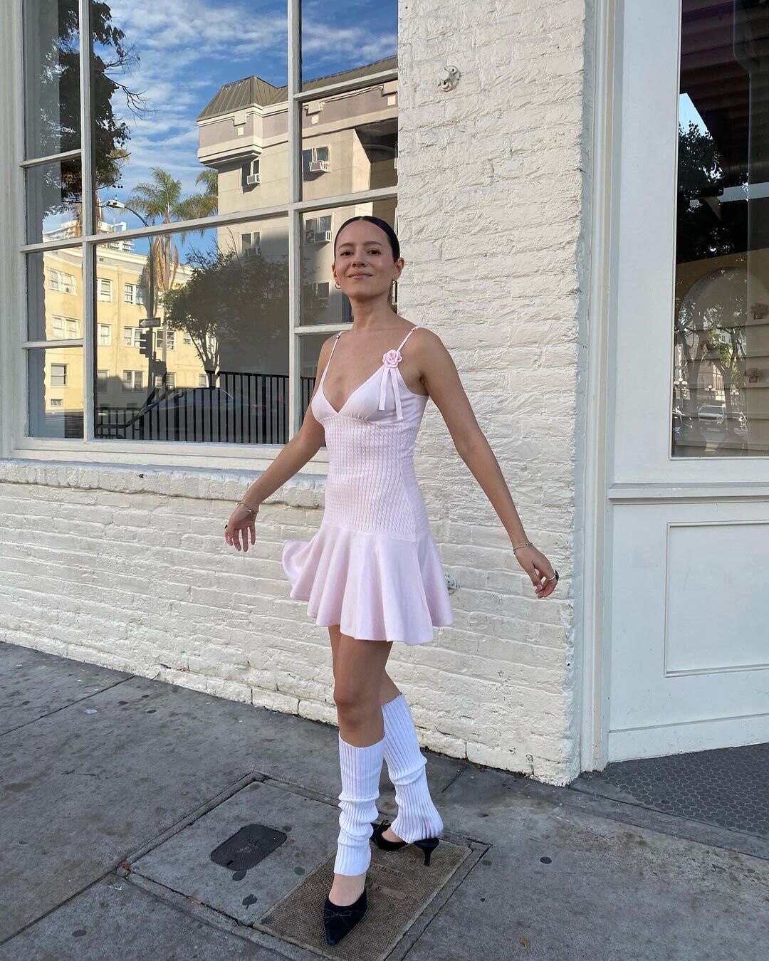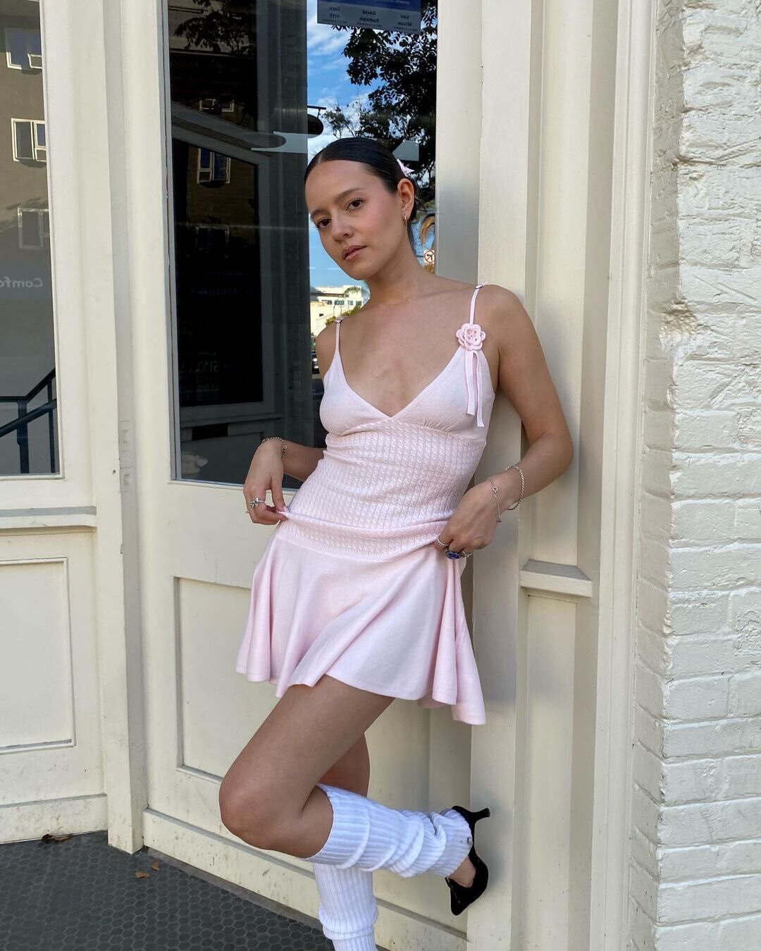 Розовое трикотажное черное платье, в цветочек, эффект подтяжки, V-образный вырез
