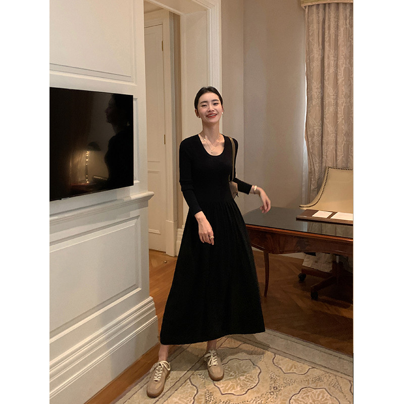 pusumede Черное длинное осеннее трикотажное платье, базовая юбка, корсет