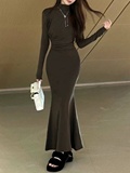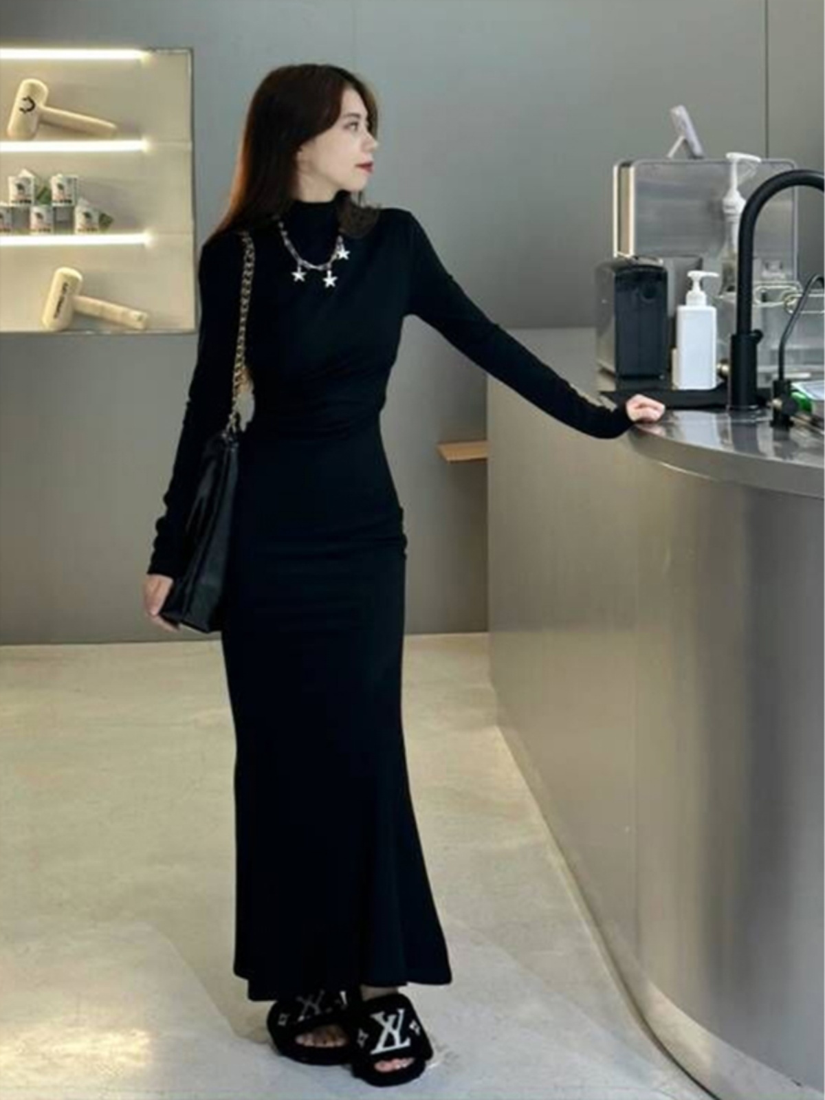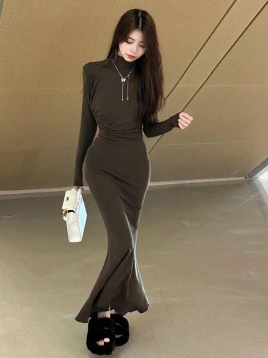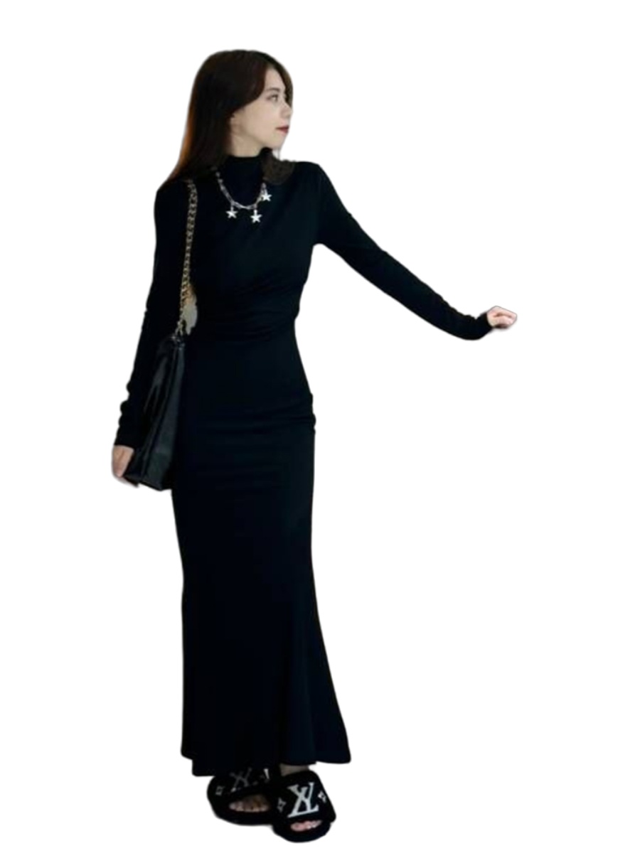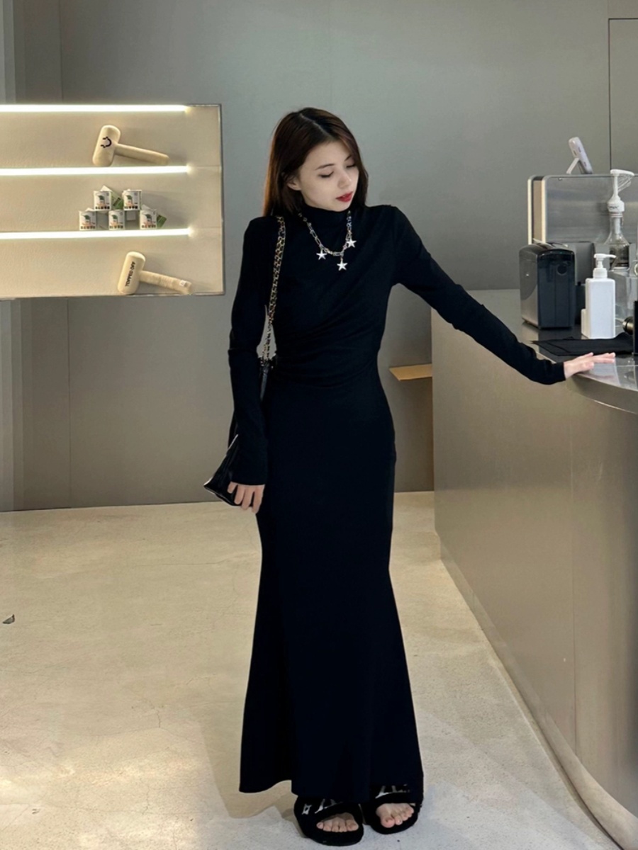 Черное платье, длинная юбка, высокий воротник, осеннее, в обтяжку, с акцентом на бедрах, крой «рыбий хвост»