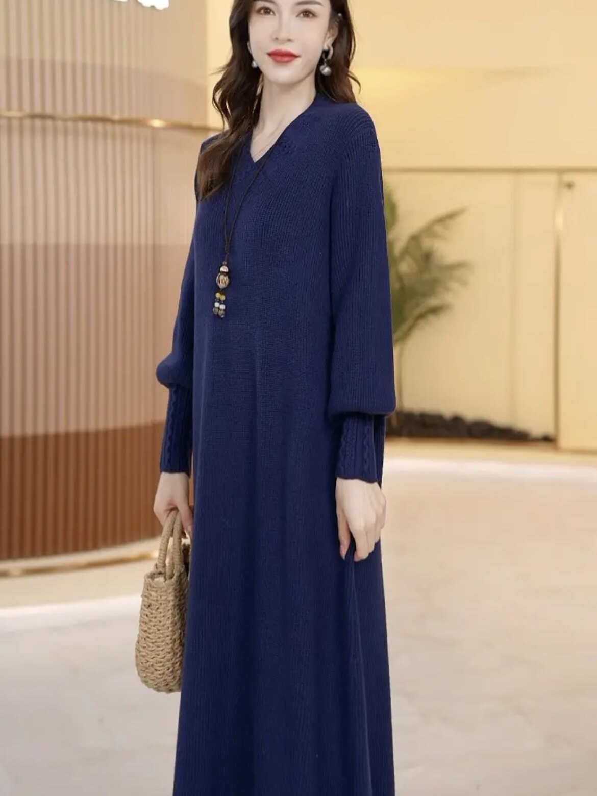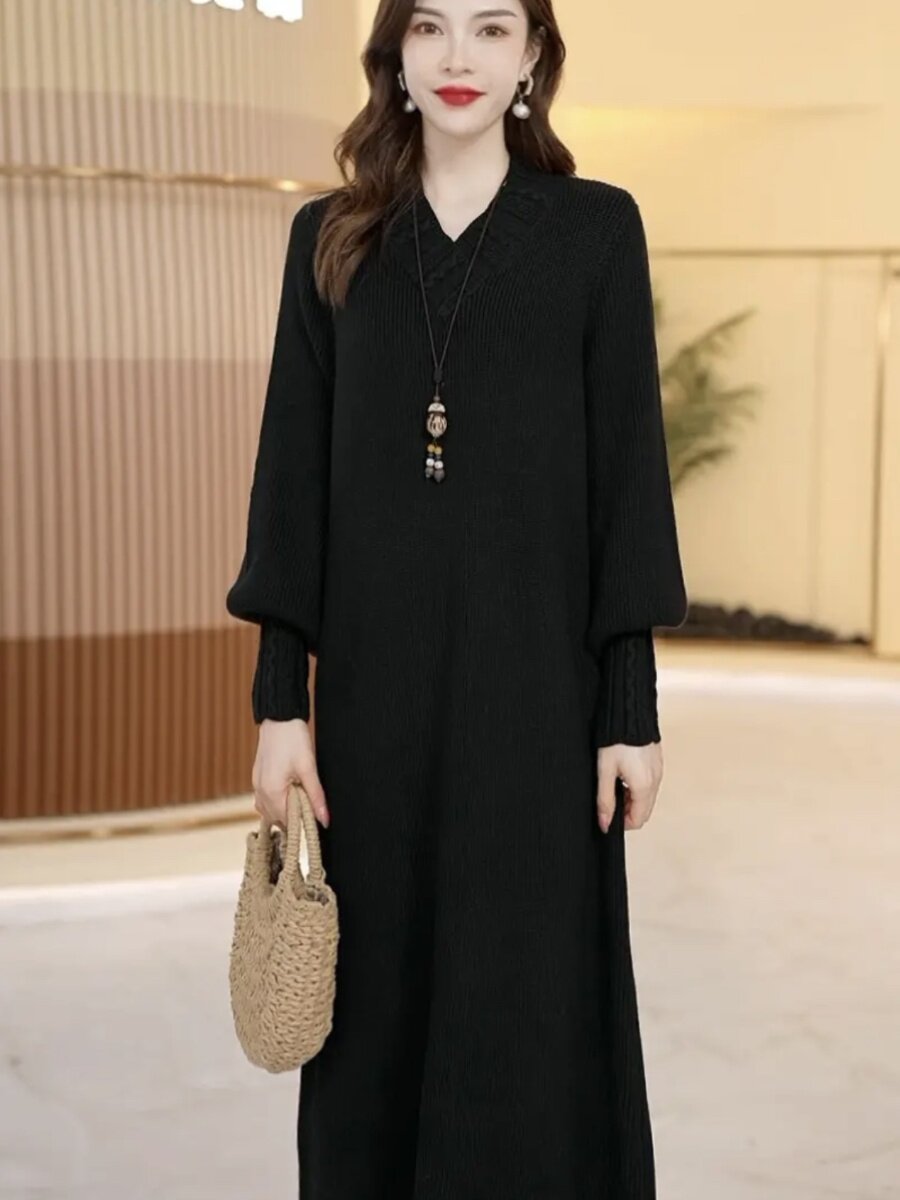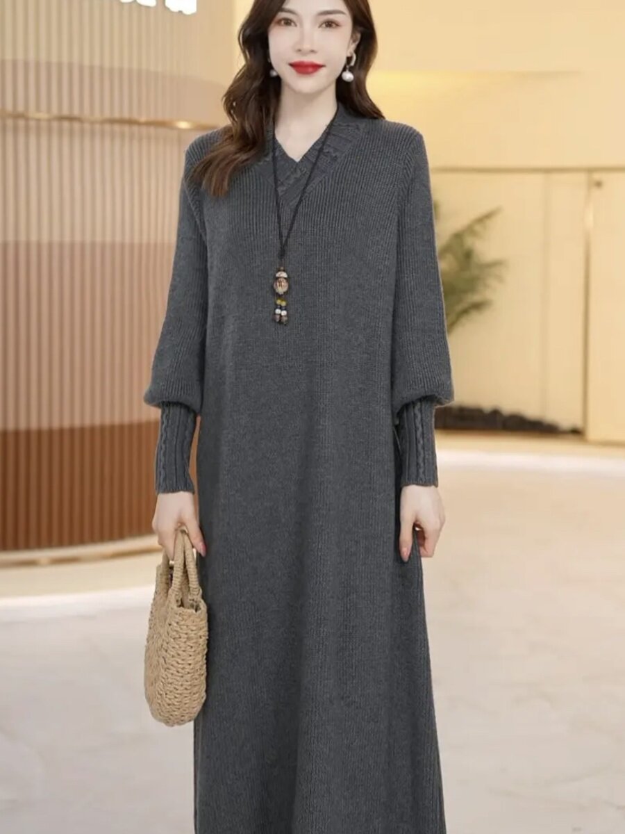 Шерстяное длинное трикотажное платье, свободный крой, средней длины, V-образный вырез, увеличенная толщина