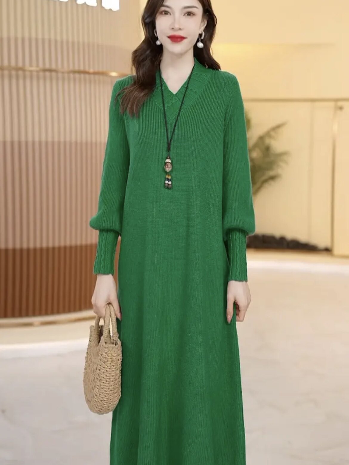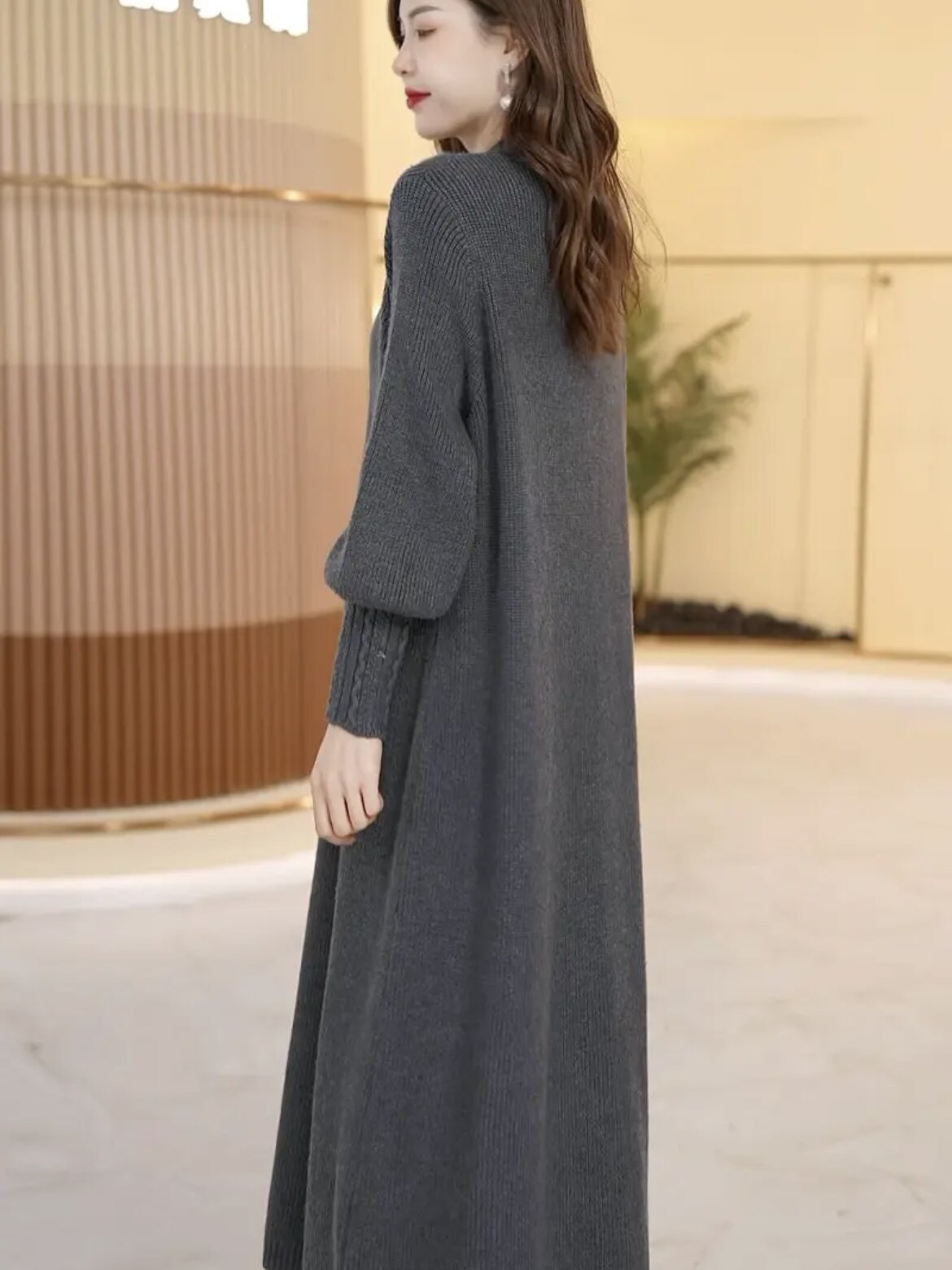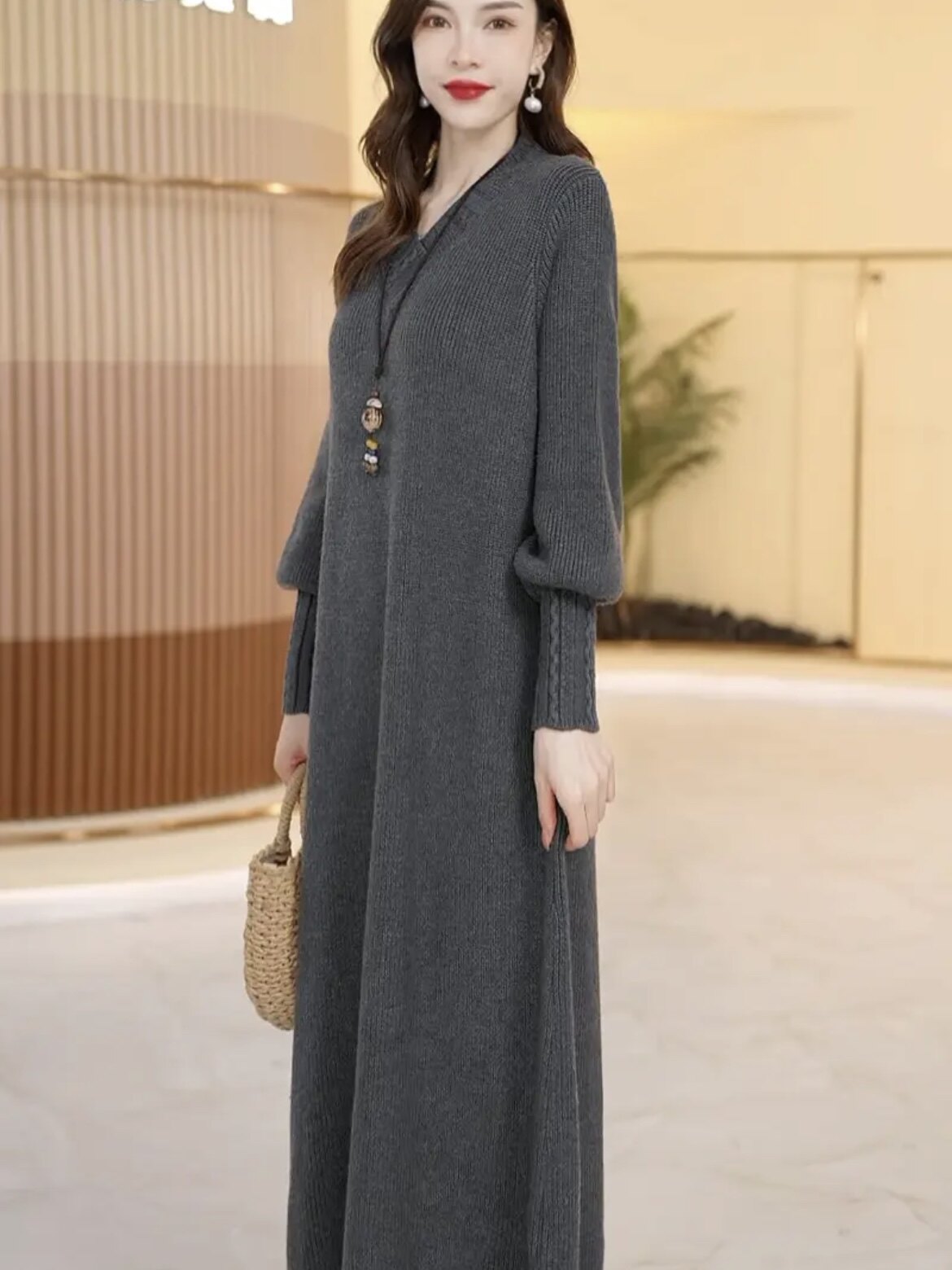 Шерстяное длинное трикотажное платье, свободный крой, средней длины, V-образный вырез, увеличенная толщина
