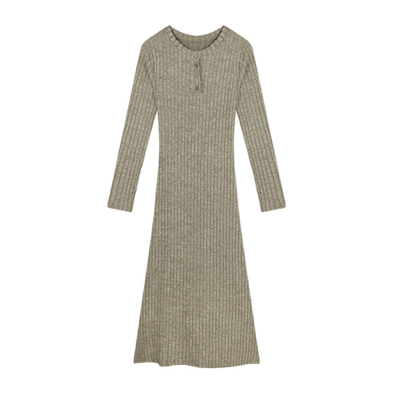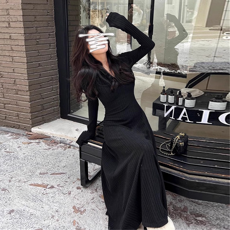 Трикотажное демисезонное платье, базовая длинная юбка, коллекция 2023, французский стиль, с акцентом на бедрах