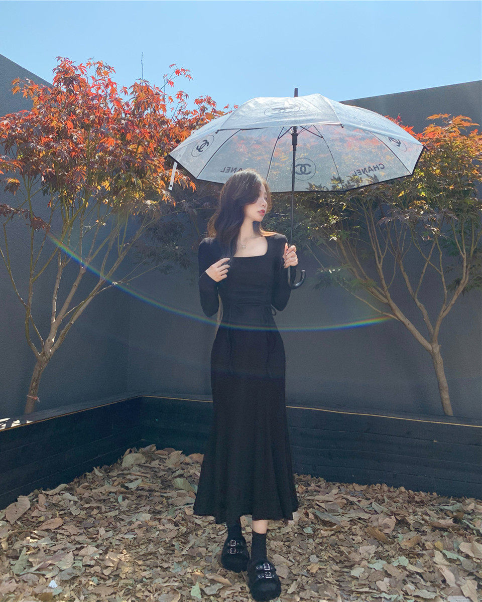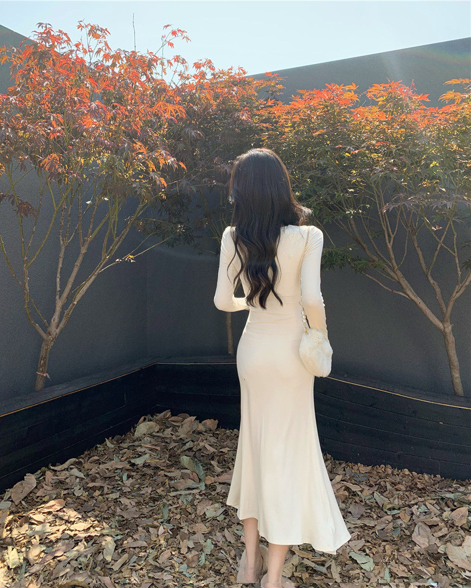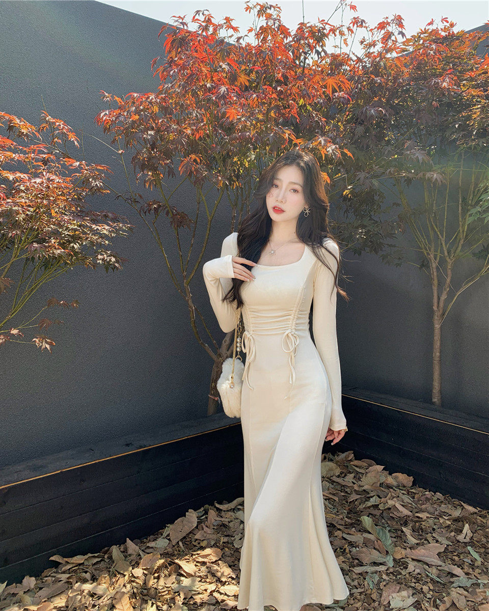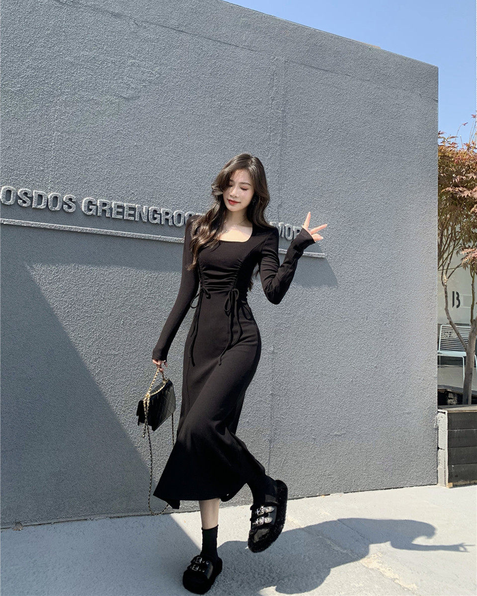 Осеннее демисезонное базовое платье, приталенный корсет, длинная юбка, пальто, квадратный вырез, крой «рыбий хвост», с акцентом на бедрах