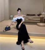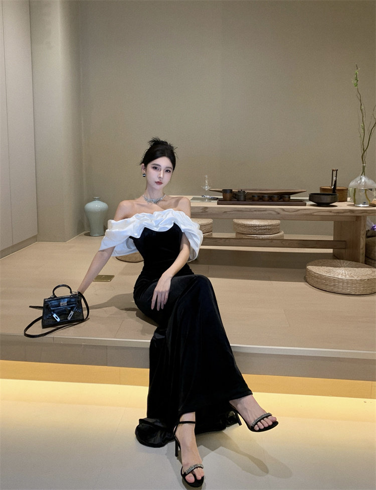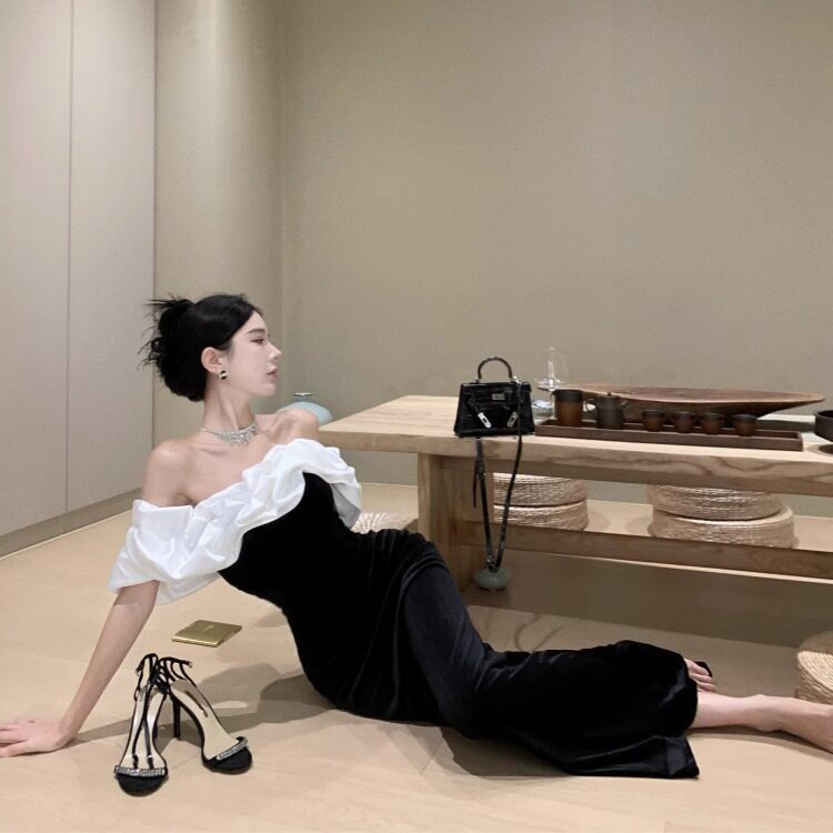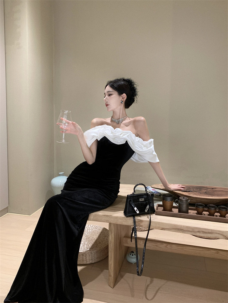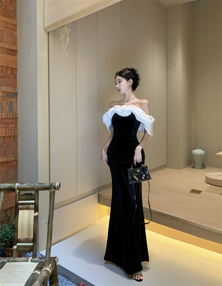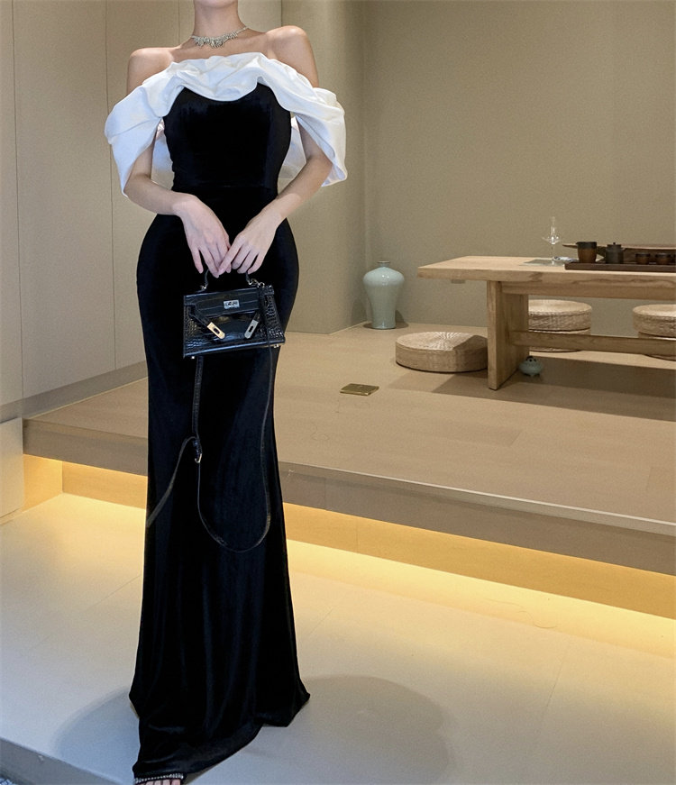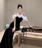Черное элитное вечернее платье, французский стиль, открытые плечи, яркий броский стиль, по фигуре, крой «рыбий хвост»