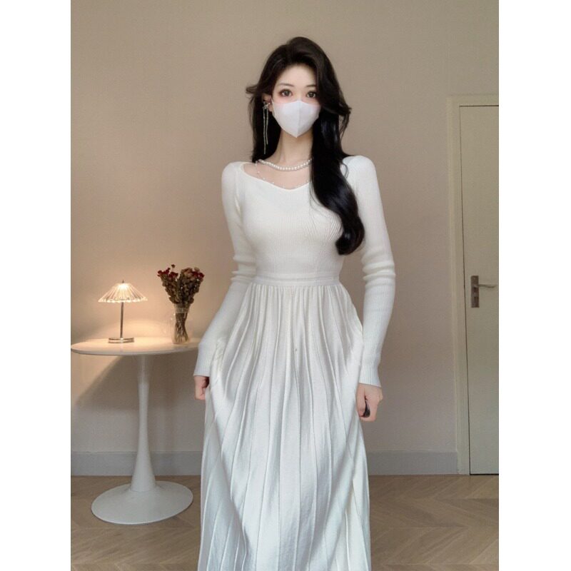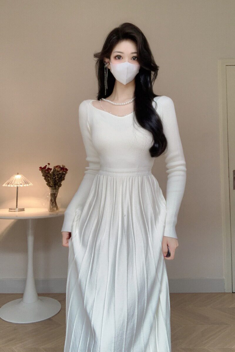 Элегантная игла для бисера, демисезонное трикотажное платье, базовая длинная юбка, французский стиль, V-образный вырез, подходит для подростков