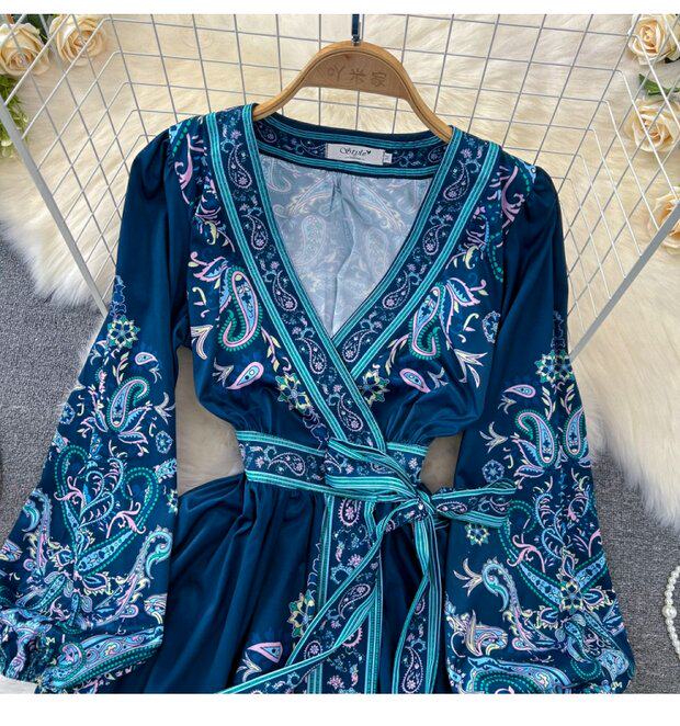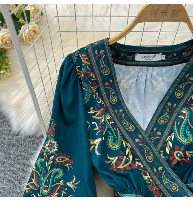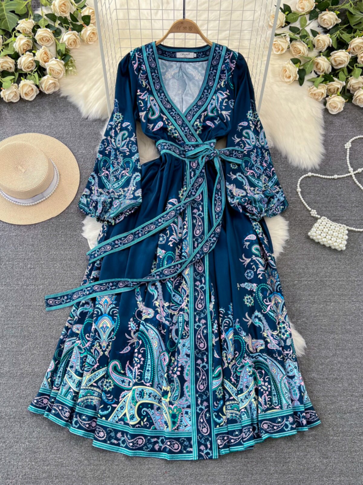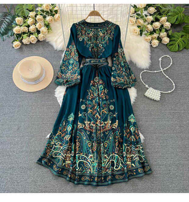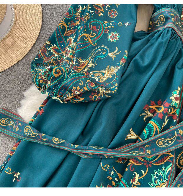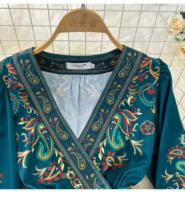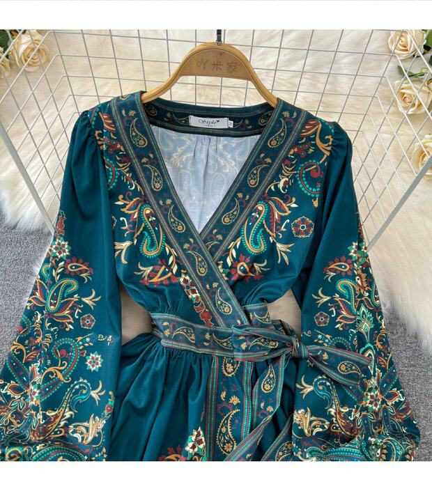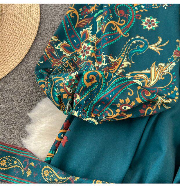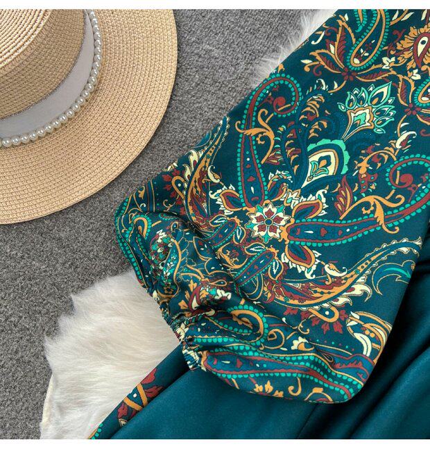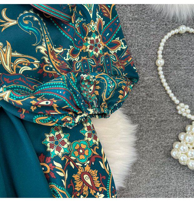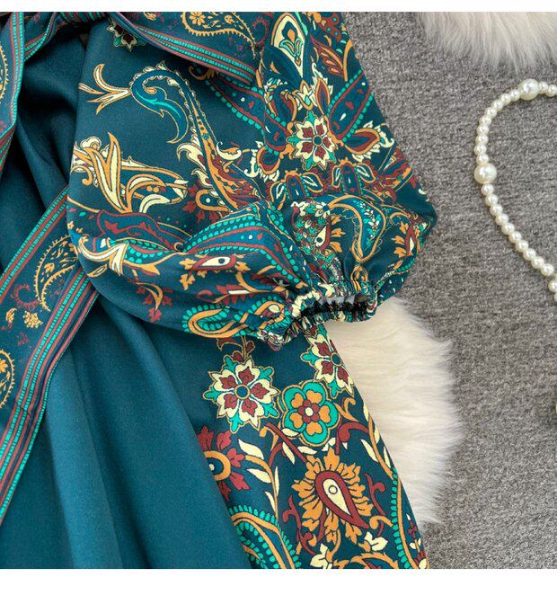 Фонарь, лонгслив, приталенный корсет, элегантное платье, длинная юбка, V-образный вырез, А-силуэт, в цветочек