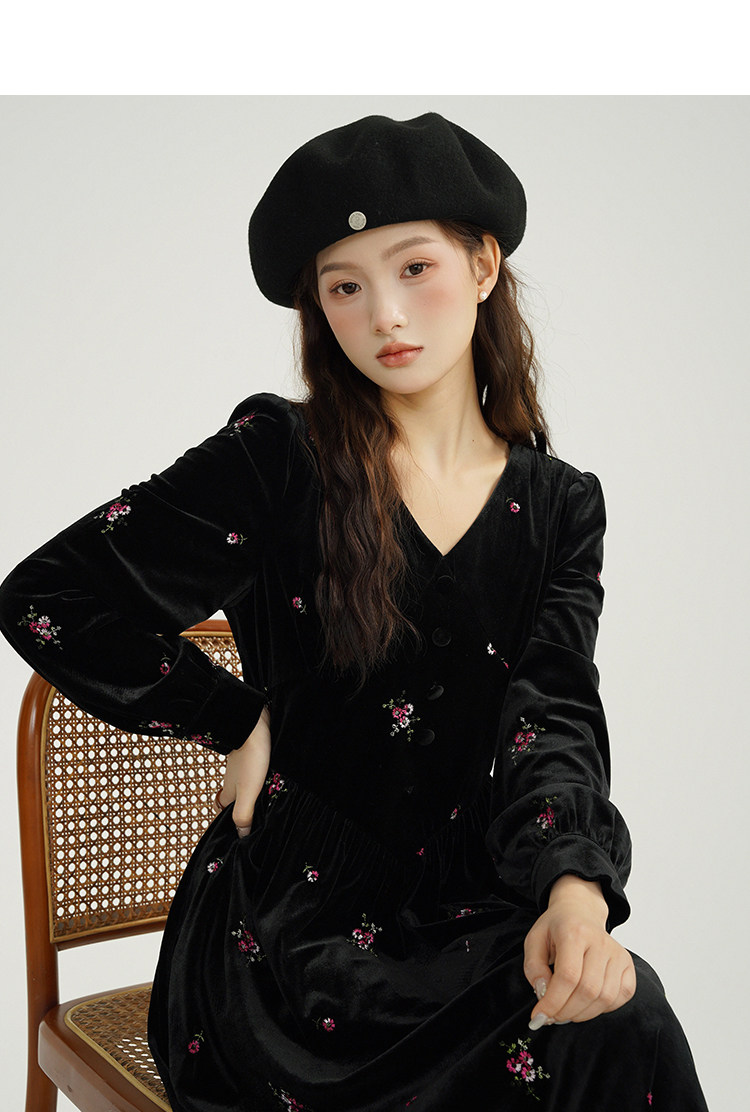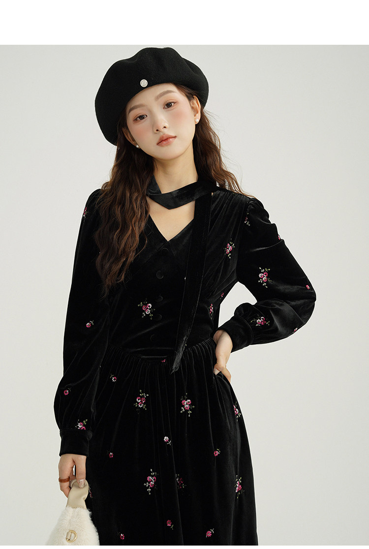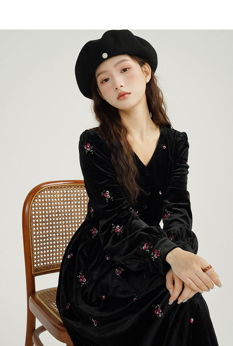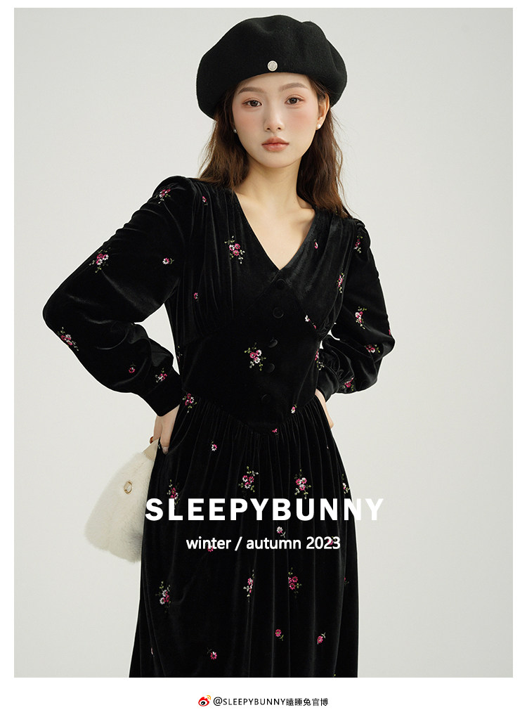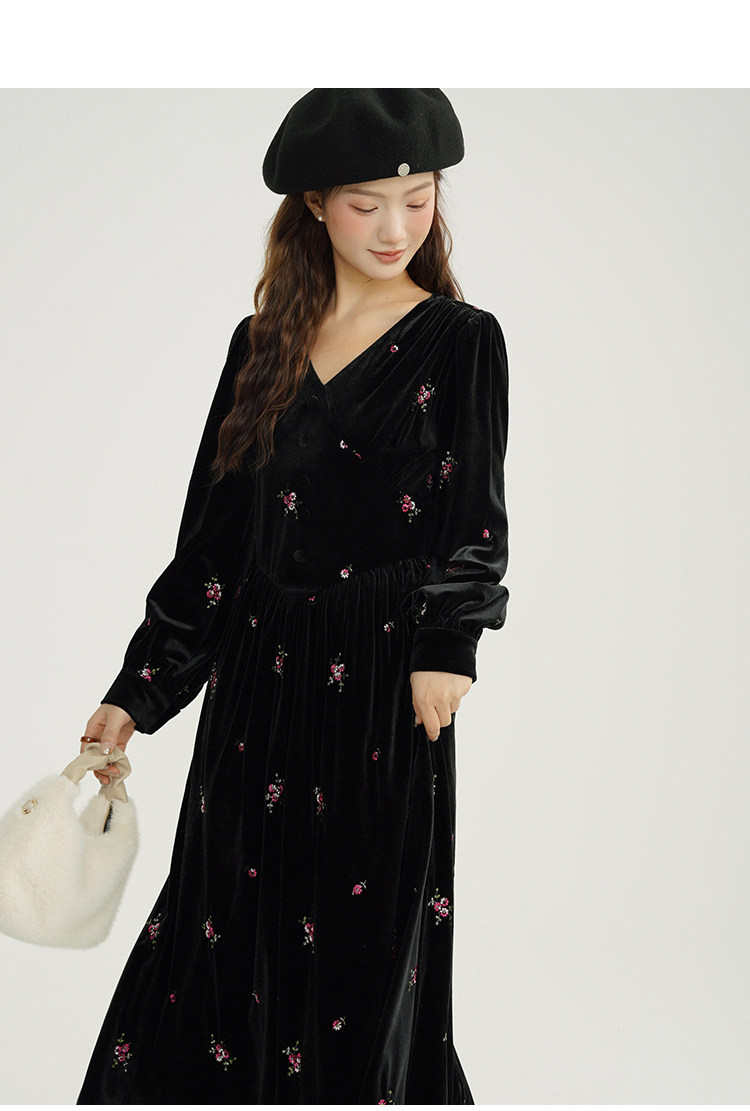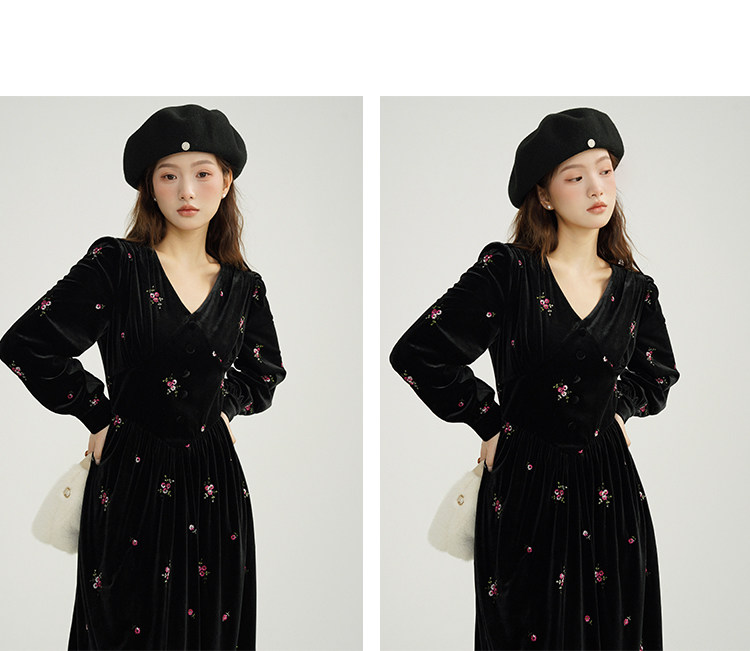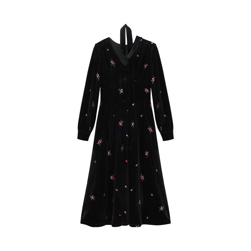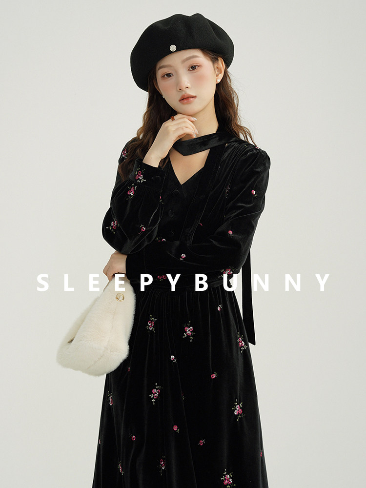 瞌睡兔 Ретро бархатное платье, длинная юбка, V-образный вырез, цветочный принт, с вышивкой, по фигуре