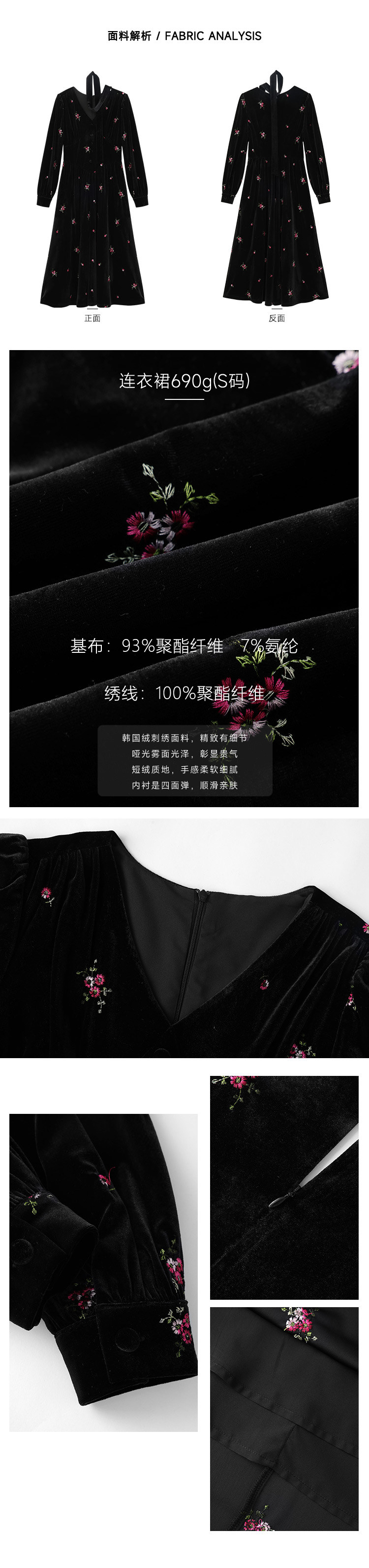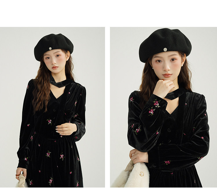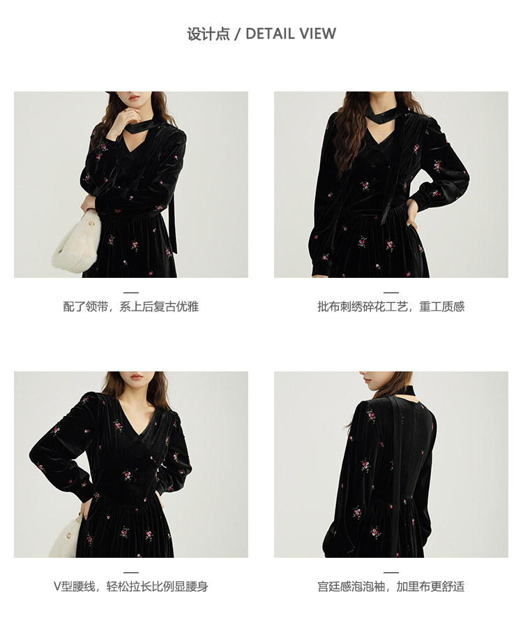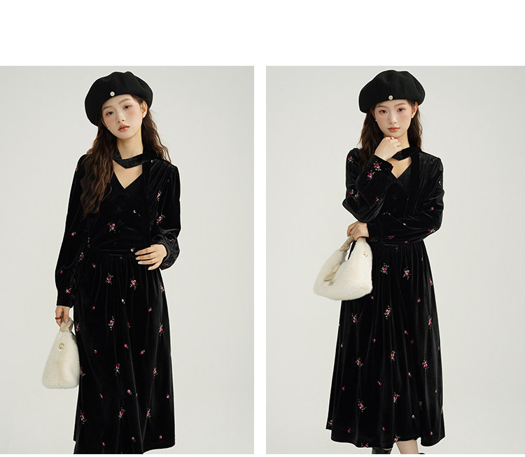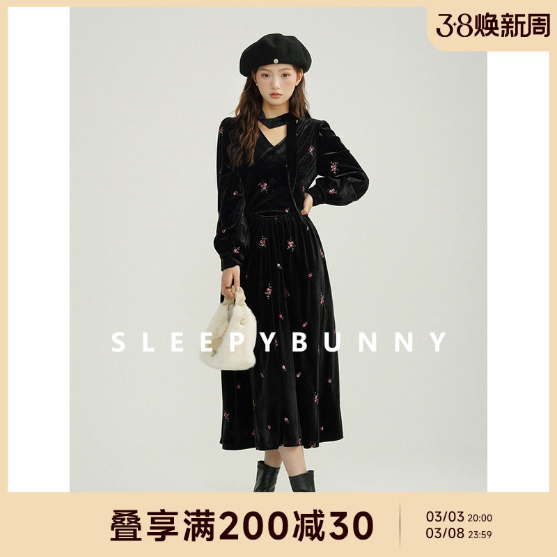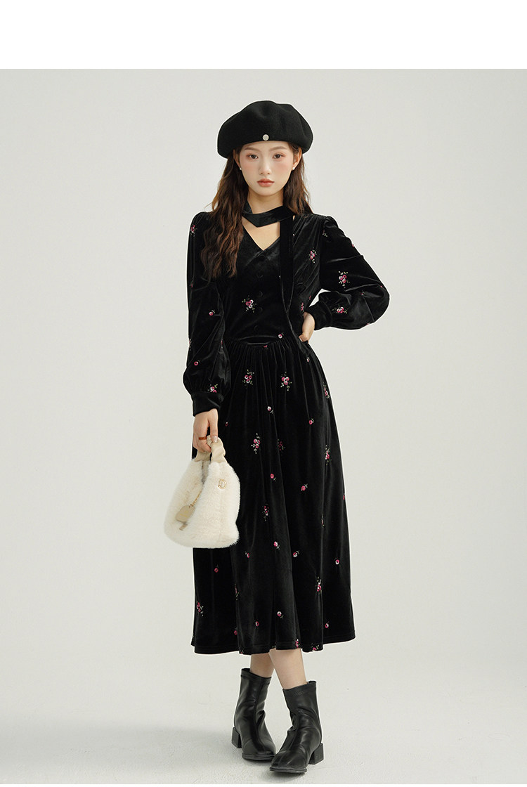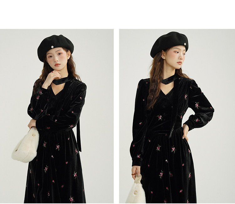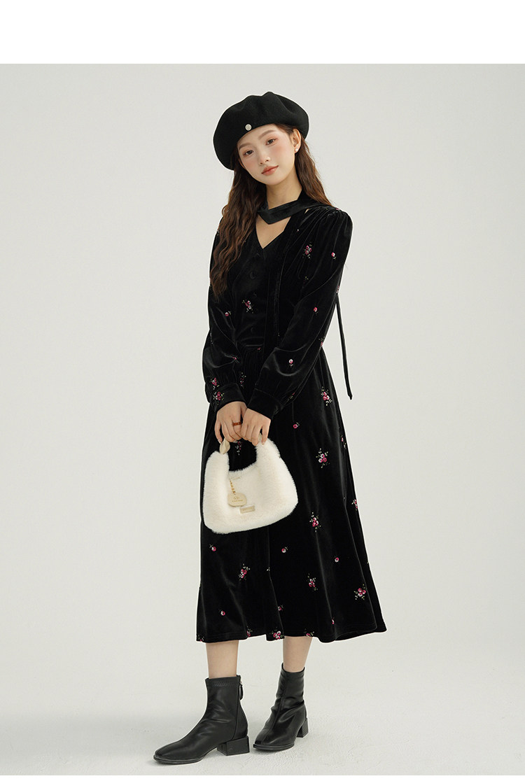 瞌睡兔 Ретро бархатное платье, длинная юбка, V-образный вырез, цветочный принт, с вышивкой, по фигуре