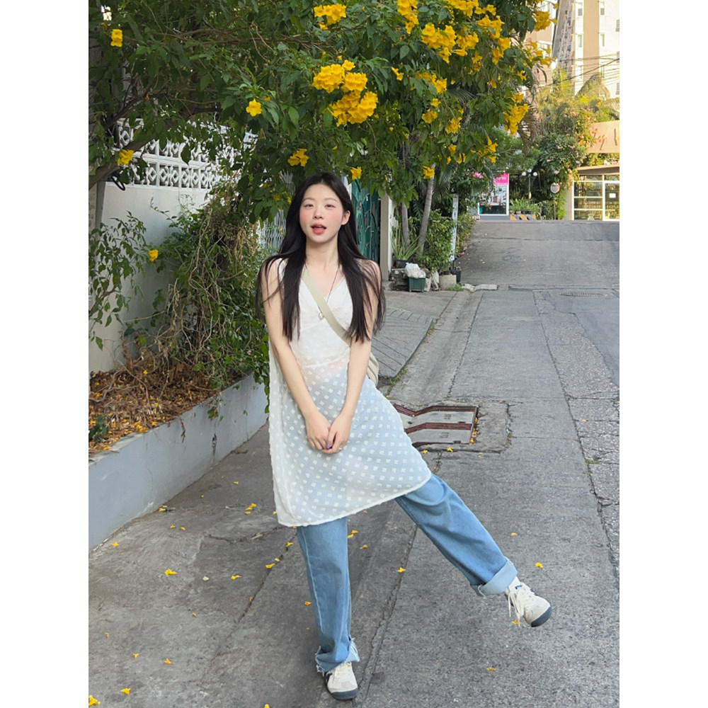 Кружевная белая летняя юбка, платье без рукавов, городской стиль, яркий броский стиль, изысканный стиль, по фигуре, V-образный вырез
