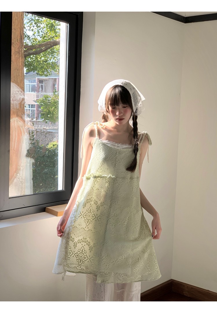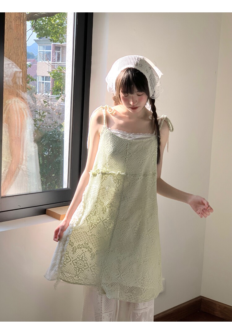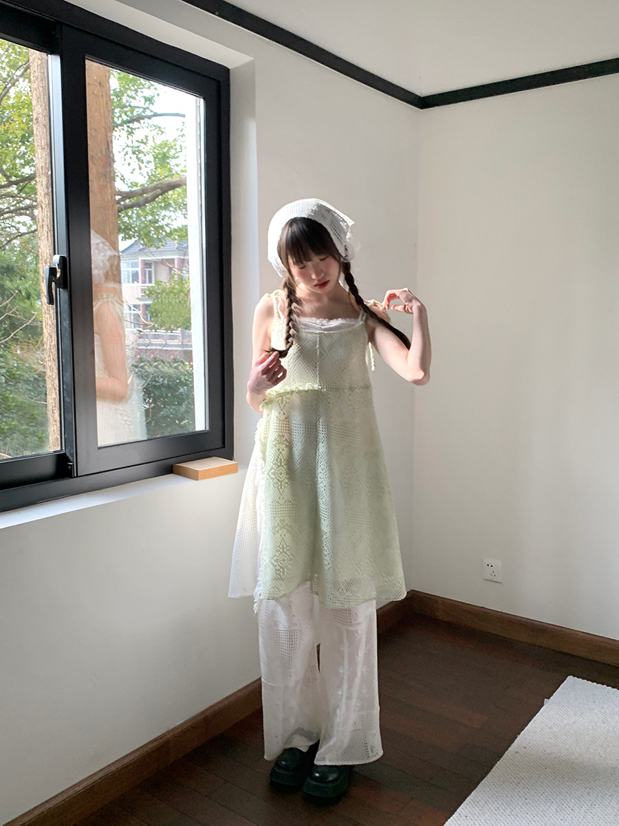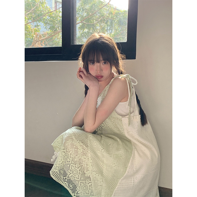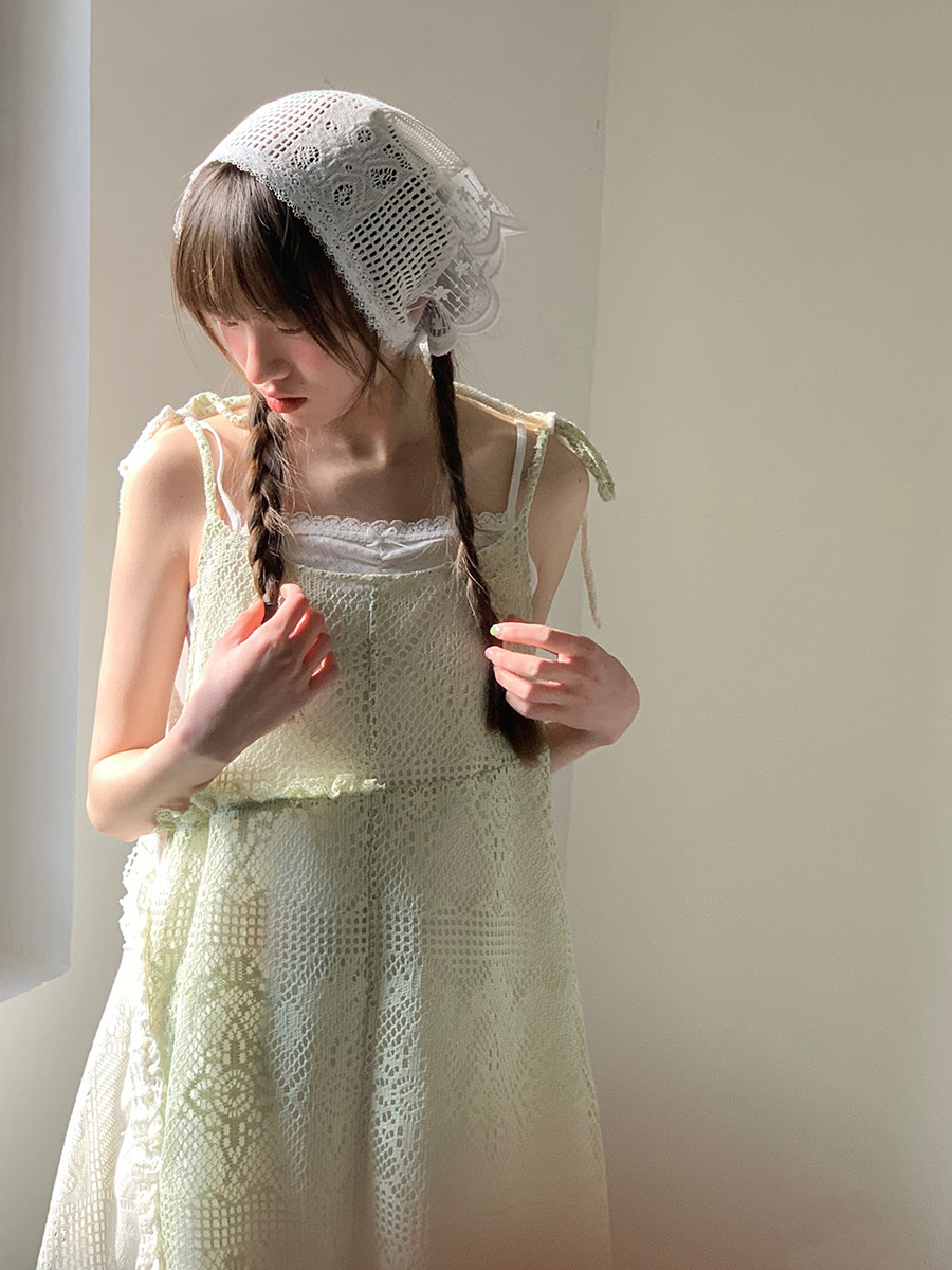 景页页 Оригинальное весенне-летнее платье молочно-зеленого цвета с двусторонним нишевым дизайном в стиле ретро и неправильной формы на подтяжках.