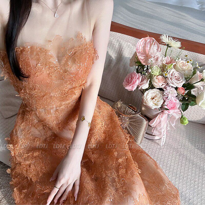 Модное демисезонное платье, трехмерный кружевной топ без лямок, юбка, облегающий крой