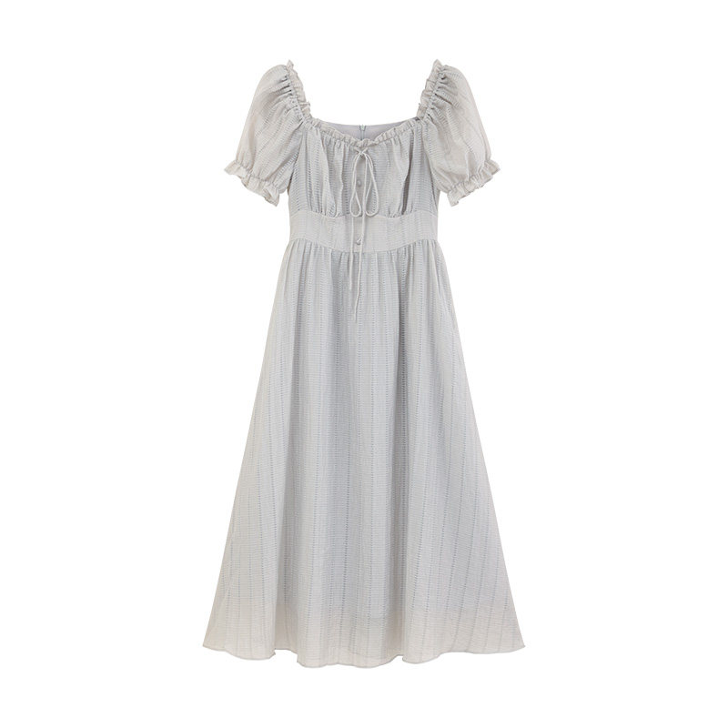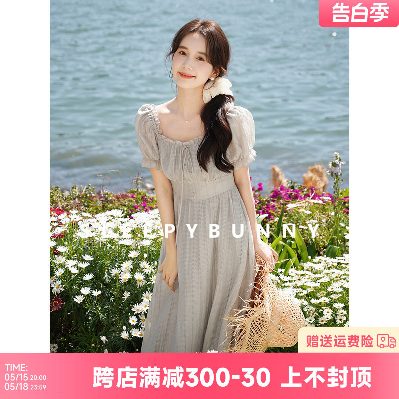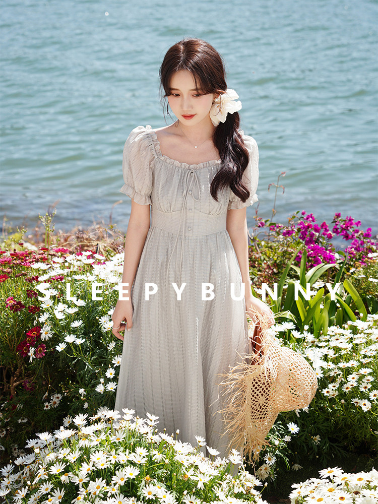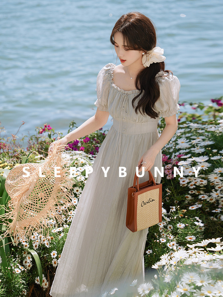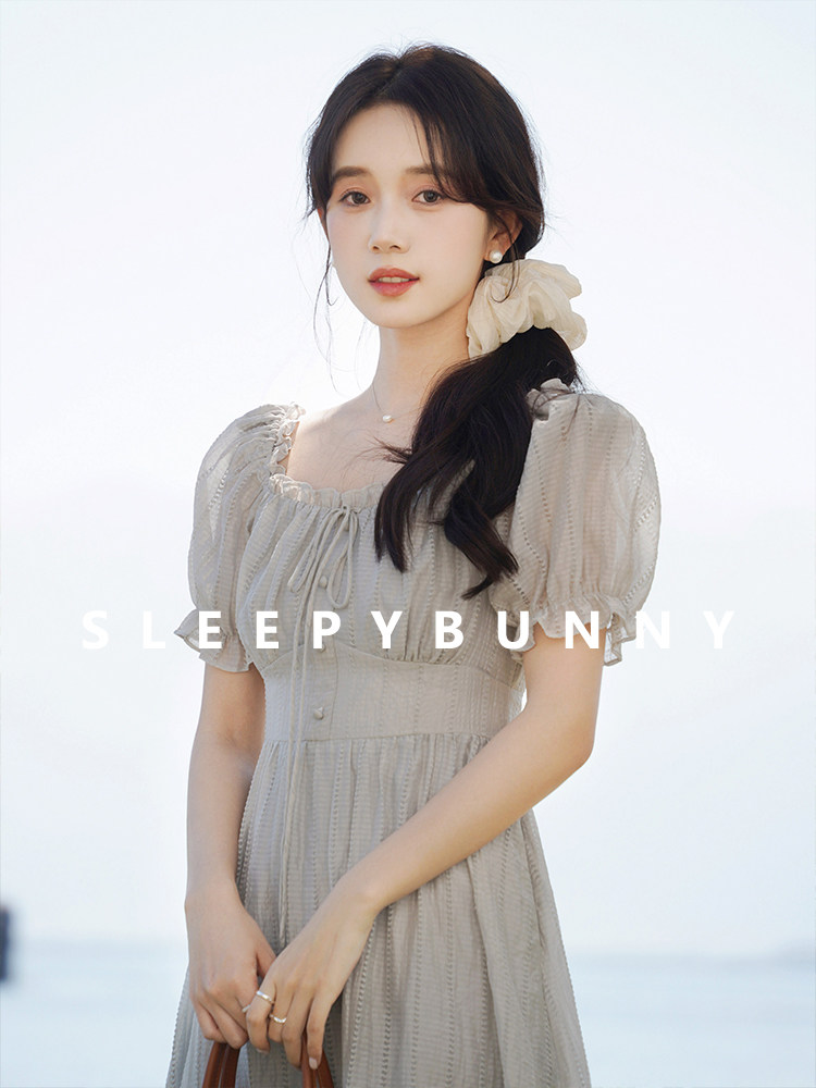 瞌睡兔 Ретро ремень, приталенное платье, длинная юбка, рукава фонарики, квадратный вырез, высокая талия