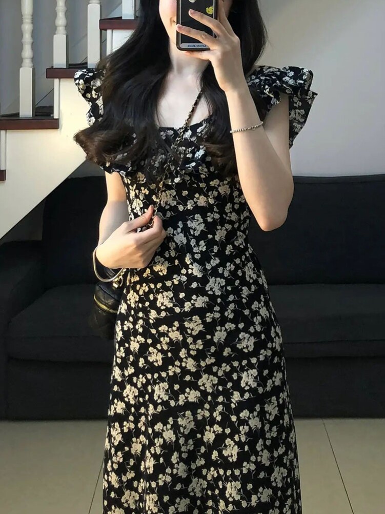 Платье, милый корсет, длинная юбка, французский стиль, квадратный вырез, в цветочек, изысканный стиль