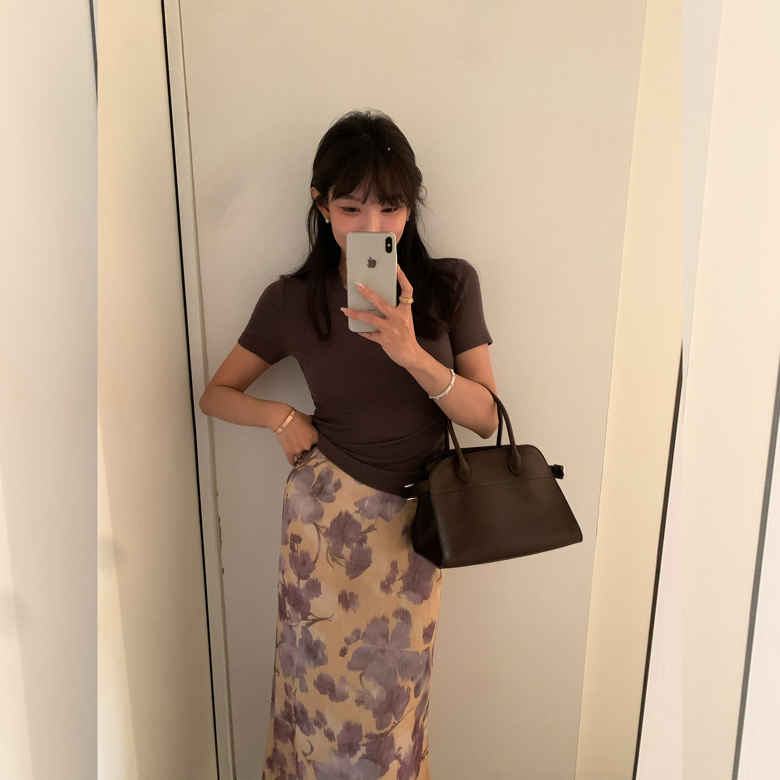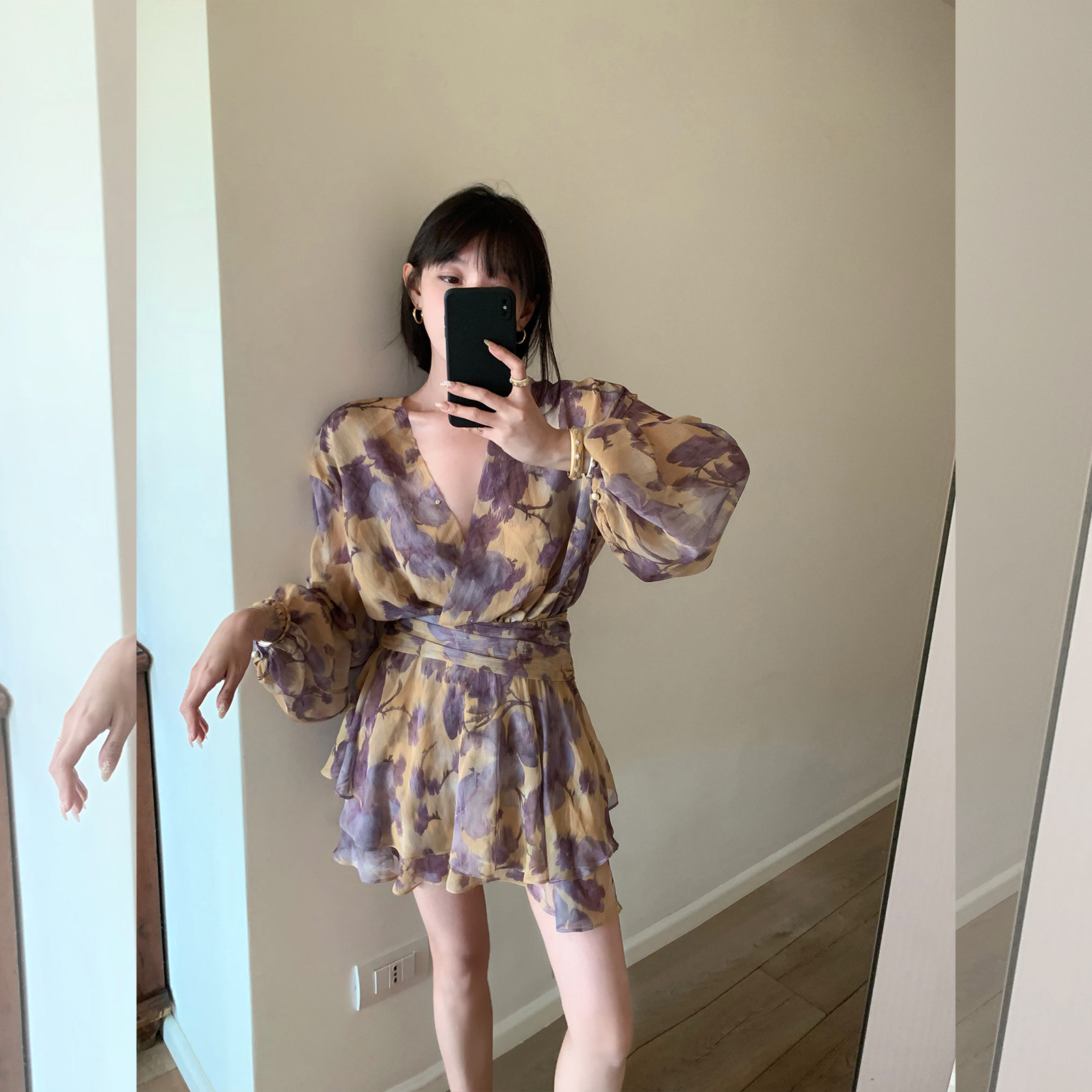Лонгслив, юбка, (в наличии на складе), цветочный принт, V-образный вырез, яркий броский стиль