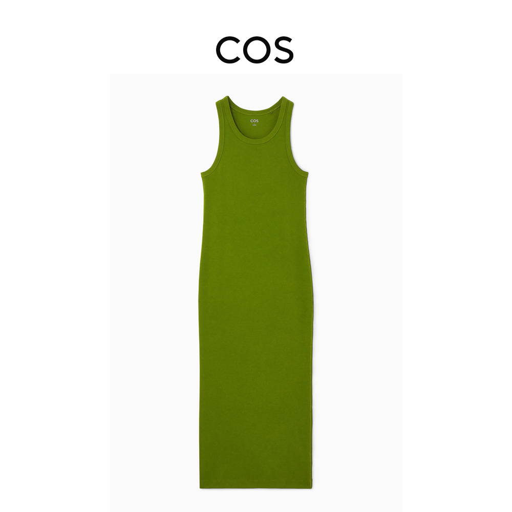 COS Женское облегающее трикотажное платье в рубчик с круглым вырезом, оливково-зеленое, летнее 0995969012