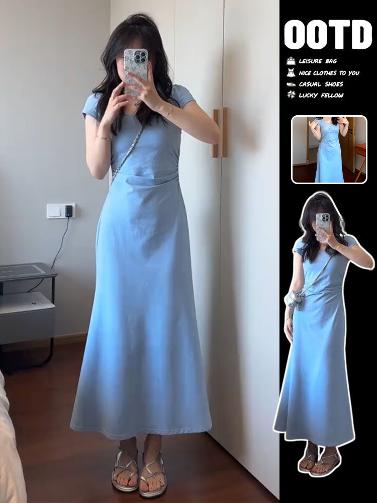 Летняя синяя элегантная длинная юбка, 2025 года, квадратный вырез, рыбий хвост, для формы тела «груша», в обтяжку
