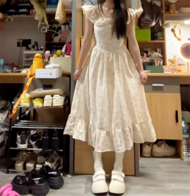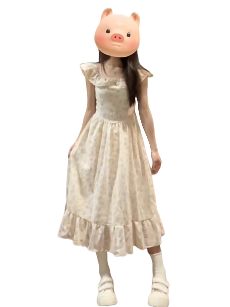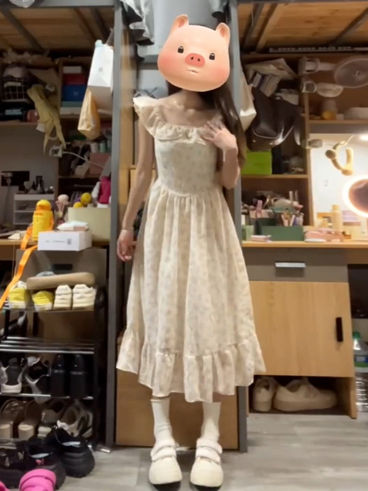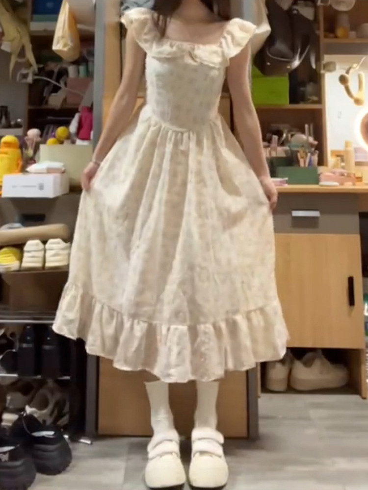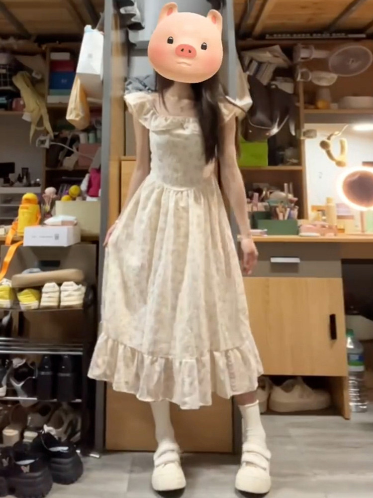 Летнее платье, длинная юбка, эффект подтяжки, французский стиль, подходит для подростков