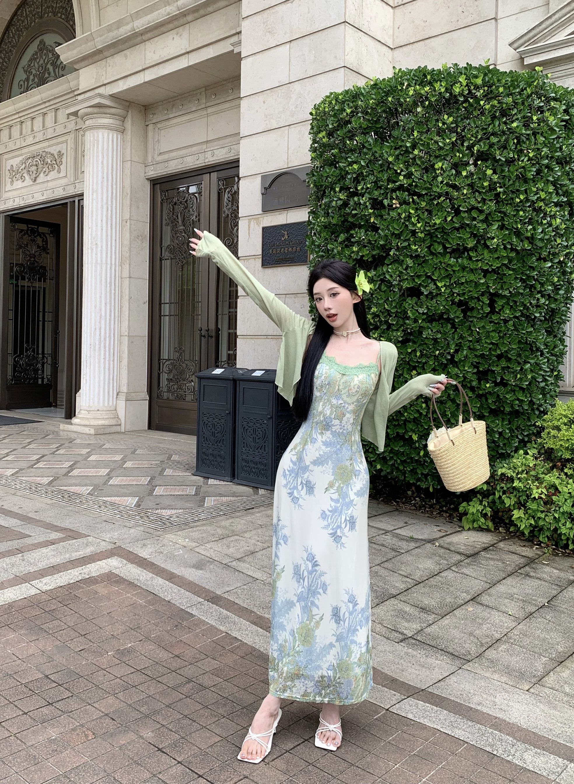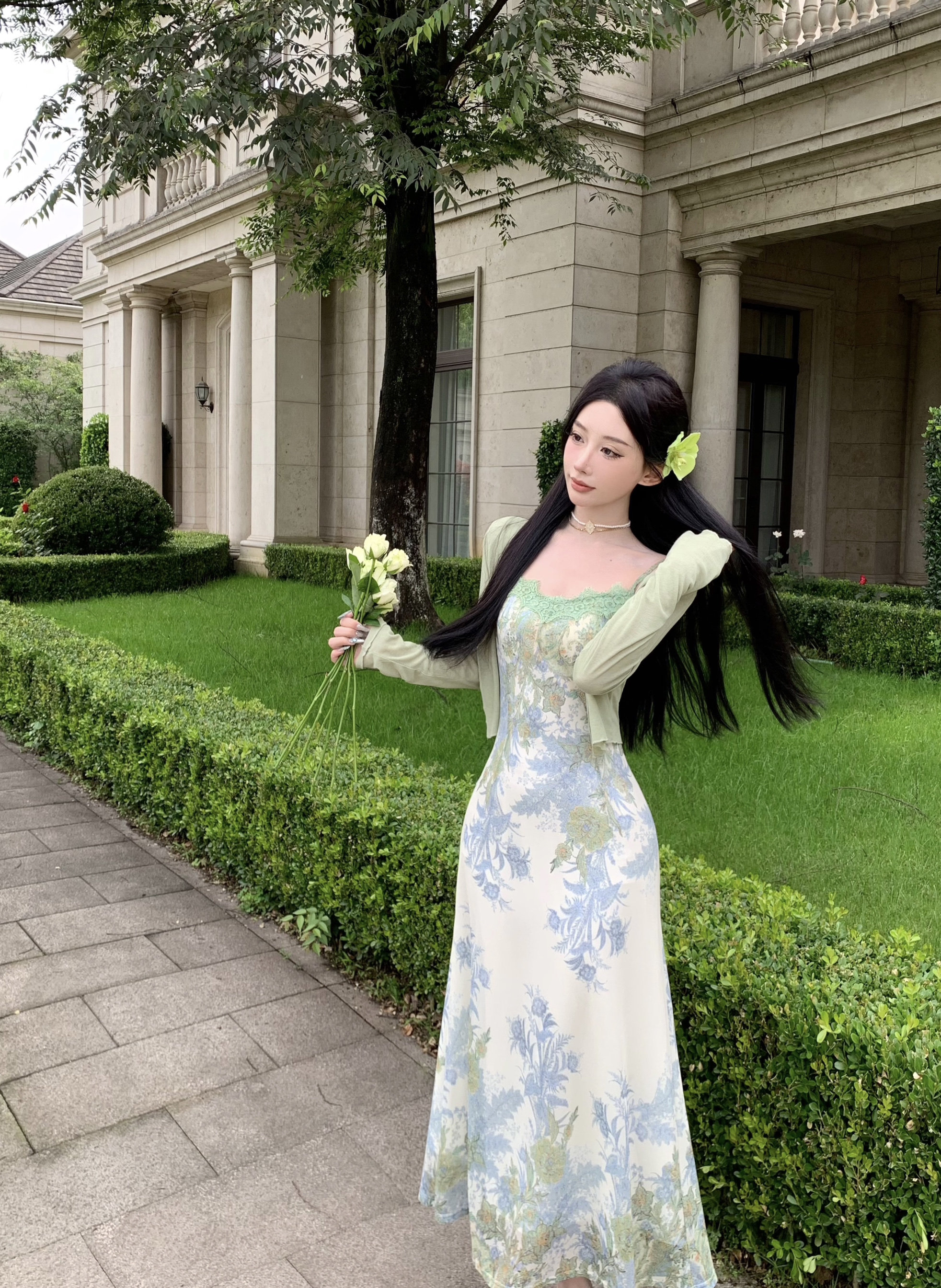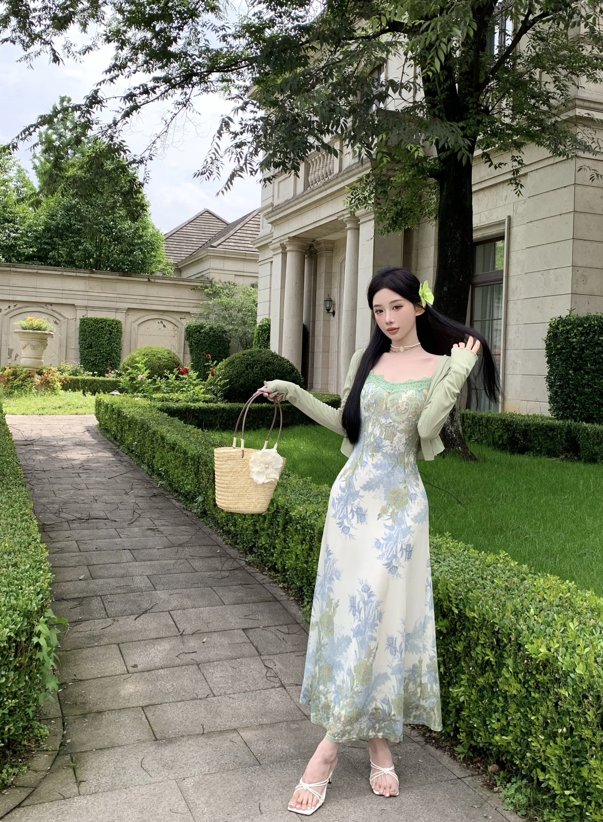 Кружевная длинная юбка, кардиган, комплект, в цветочек, французский стиль