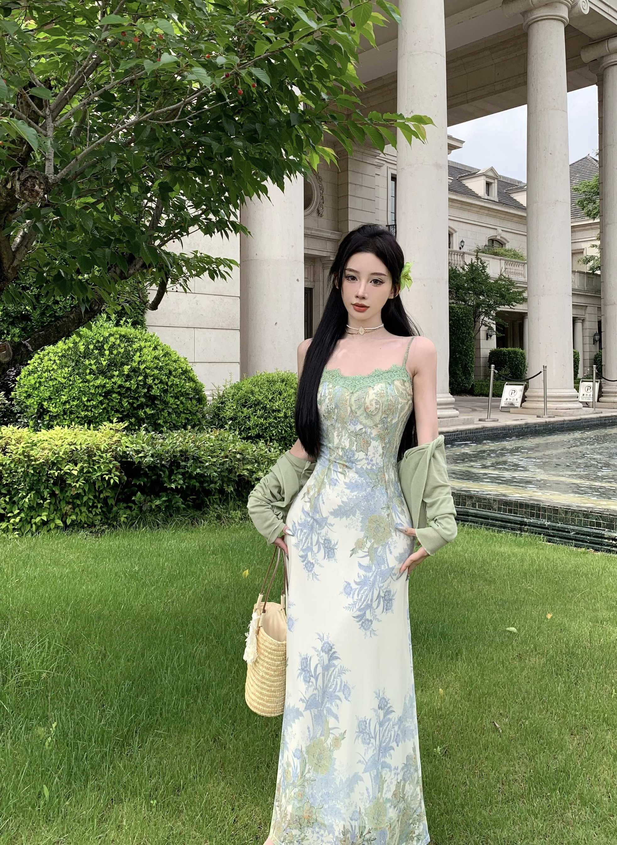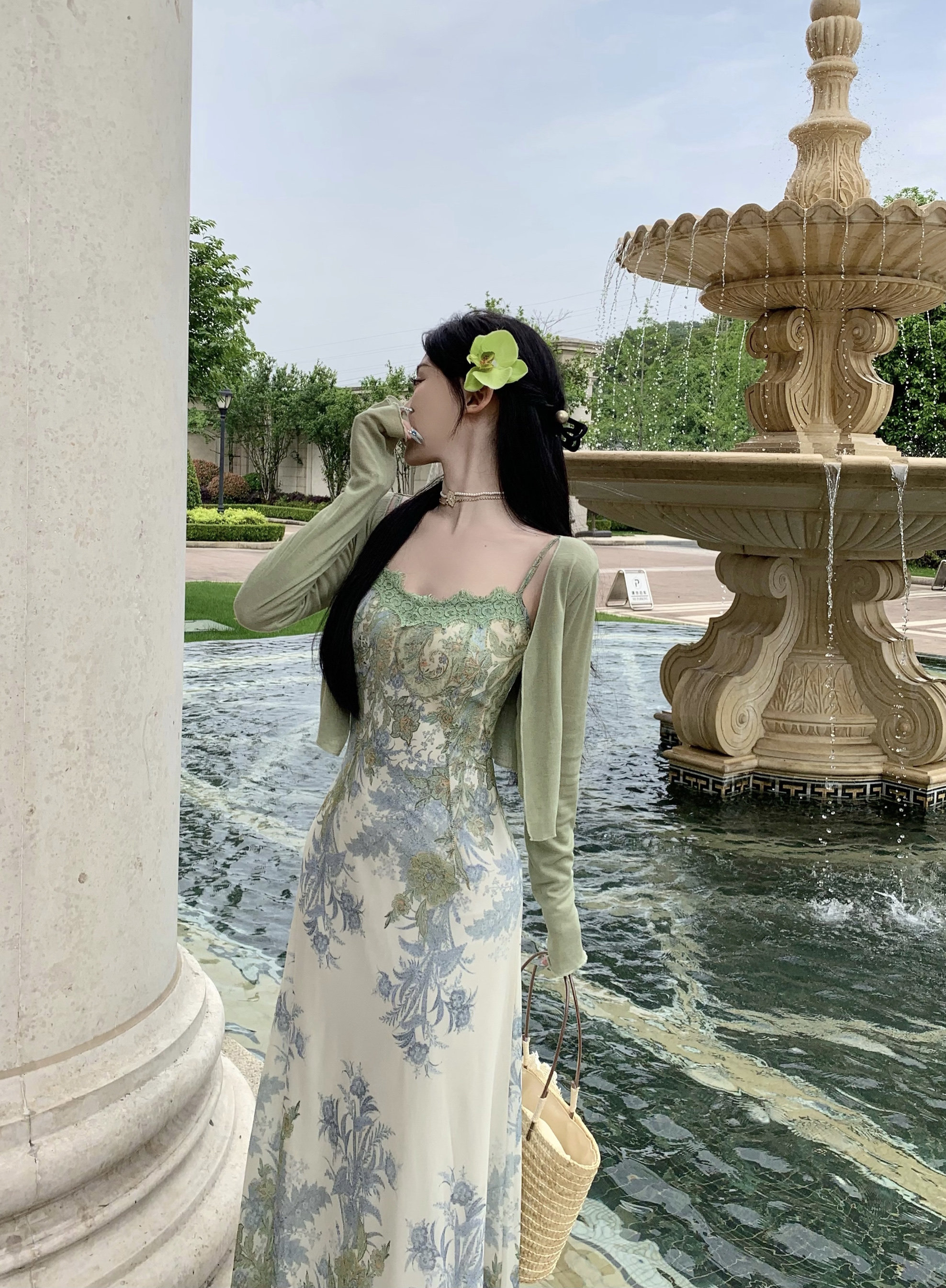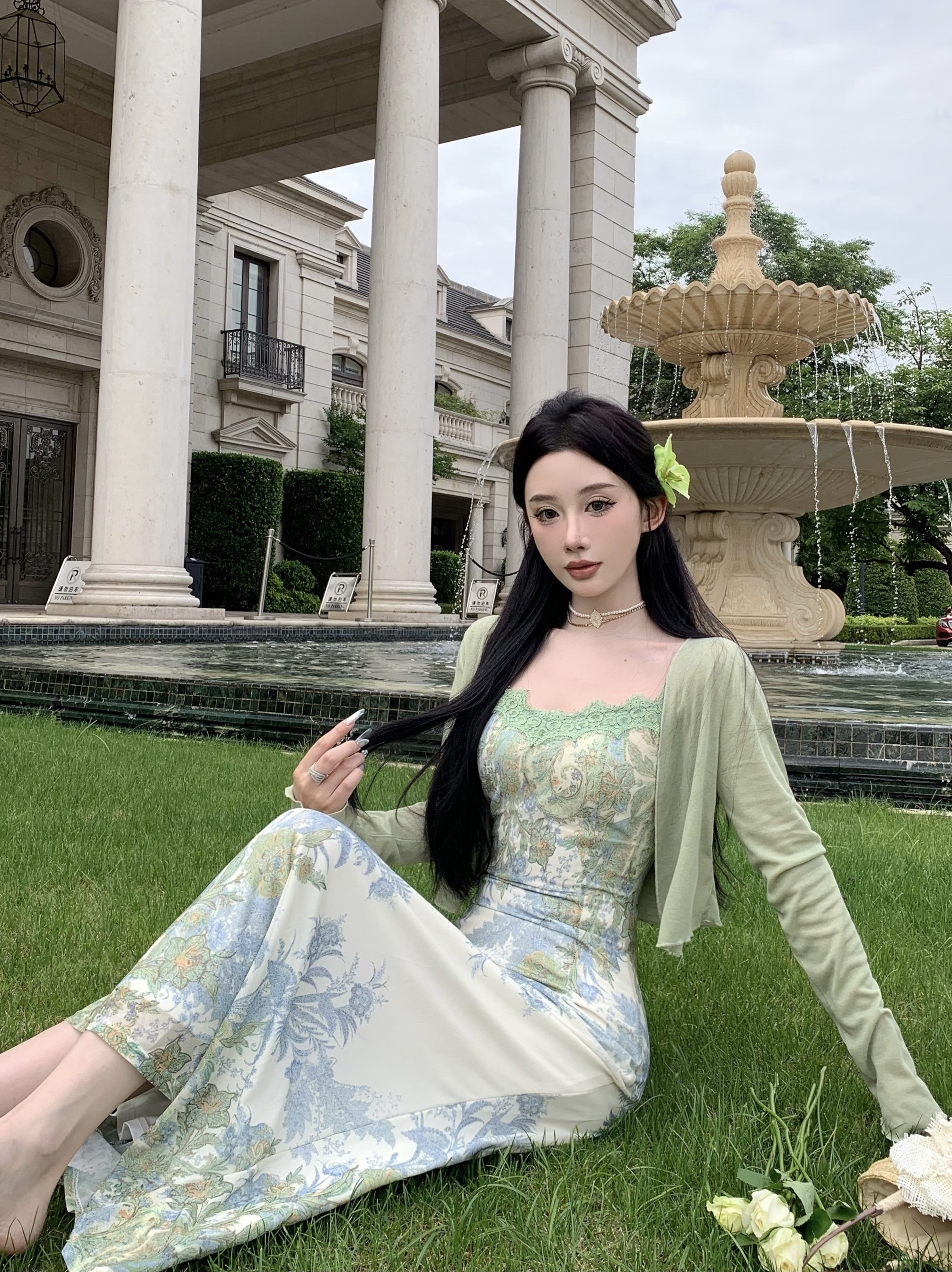 Кружевная длинная юбка, кардиган, комплект, в цветочек, французский стиль