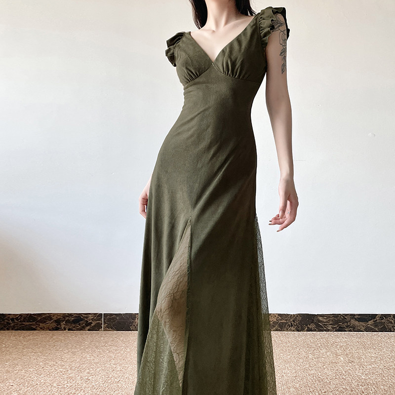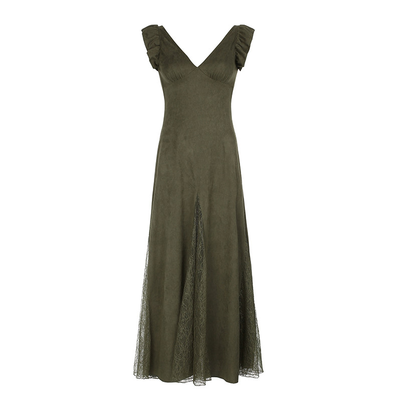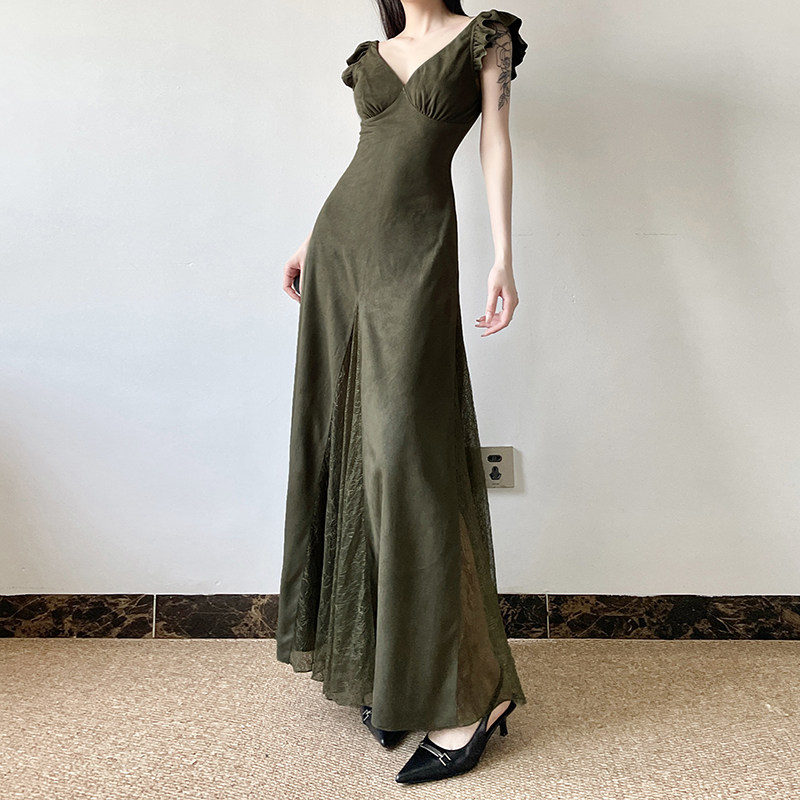 Weekeep [Moss Green Tree] Ретро кружевное сшивание маленького летательного рукава ведическое ремонтное платье универсальная длинная юбка