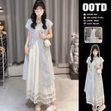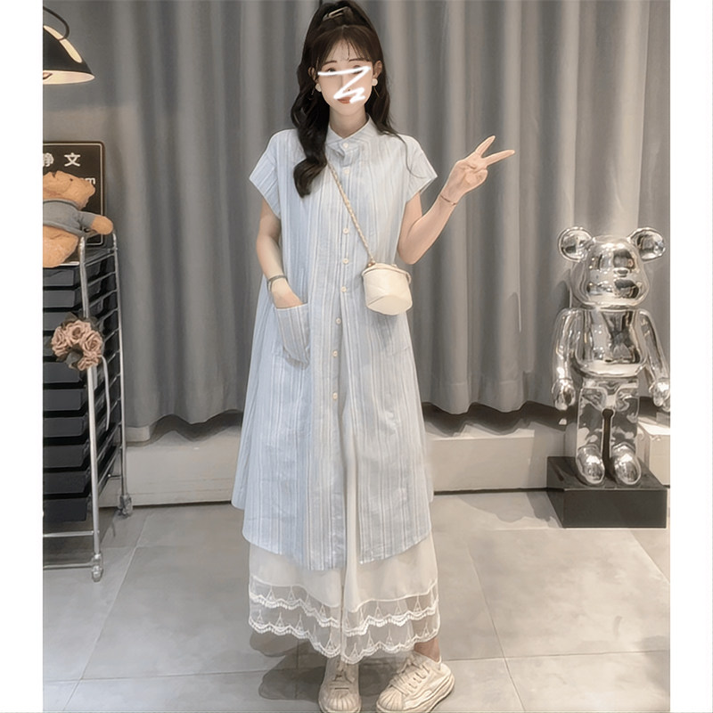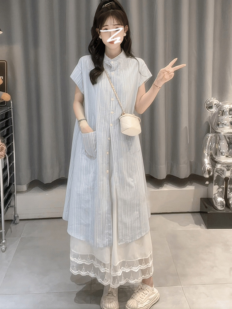 Синяя летняя рубашка, длинная юбка, подходит для подростков, французский стиль