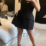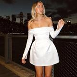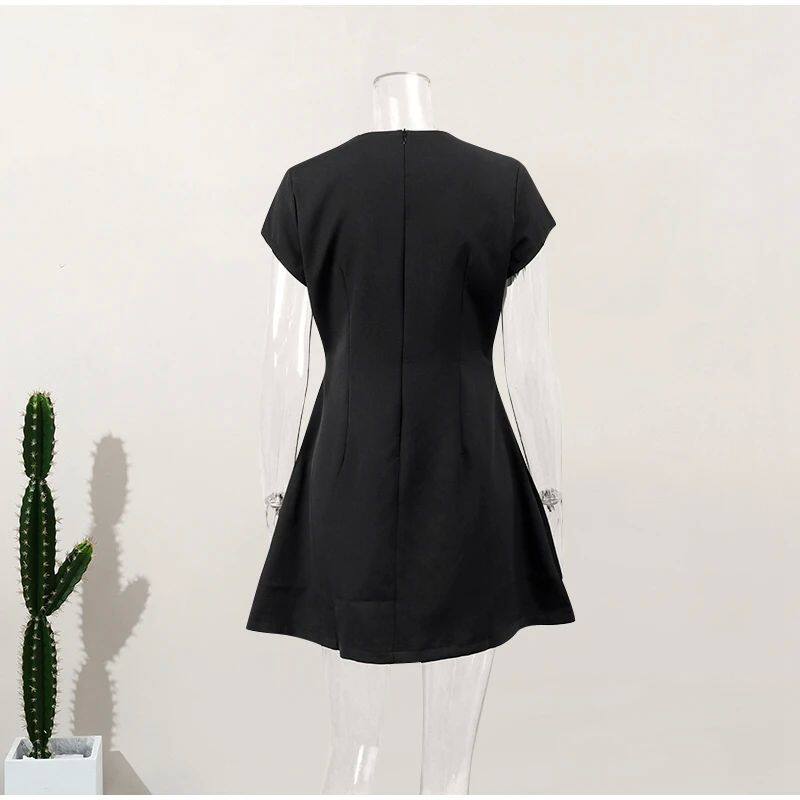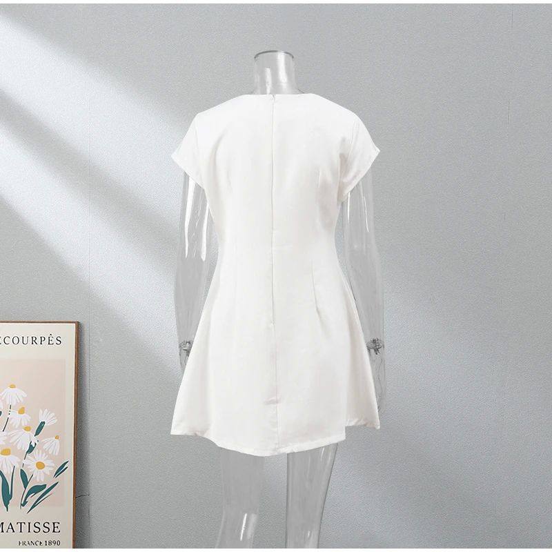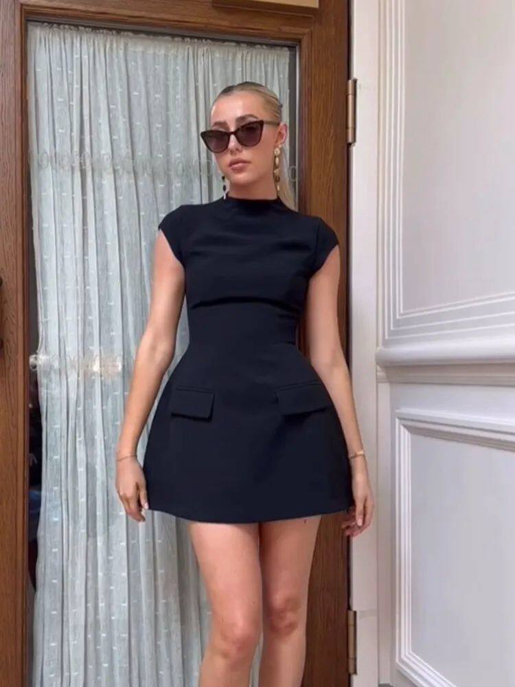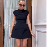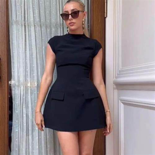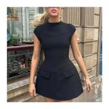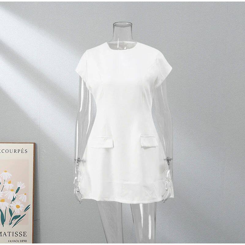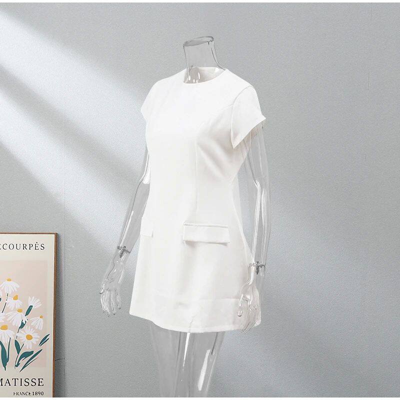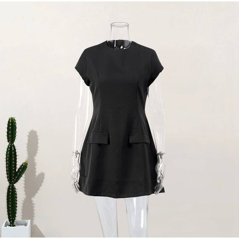 Женщины элегантные твердые карманы Slim Mini Dress Fashion O-образное F f