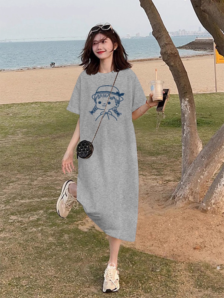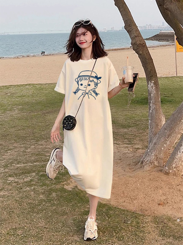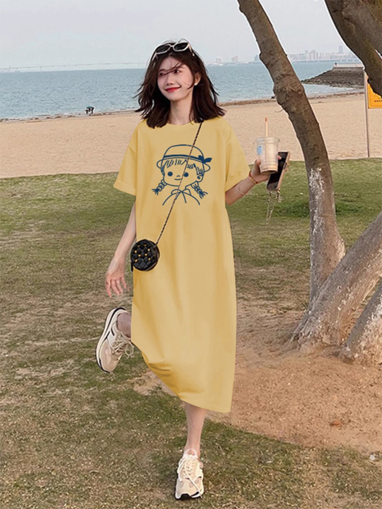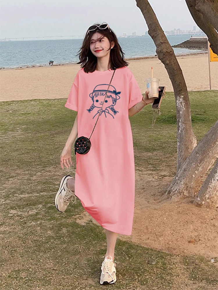 Хлопковая летняя футболка с коротким рукавом для отдыха, длинная юбка, свободный крой, размер, подходит для подростков, средней длины