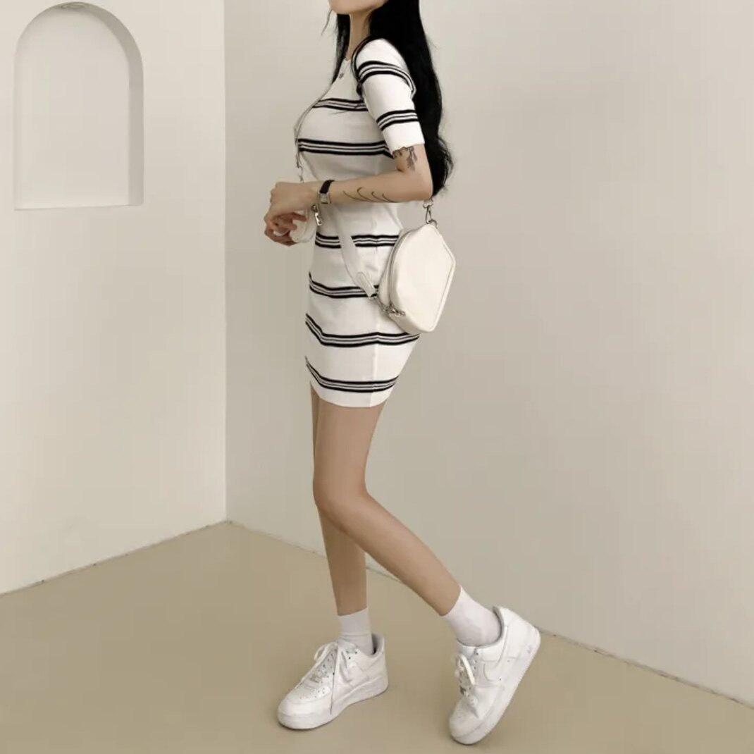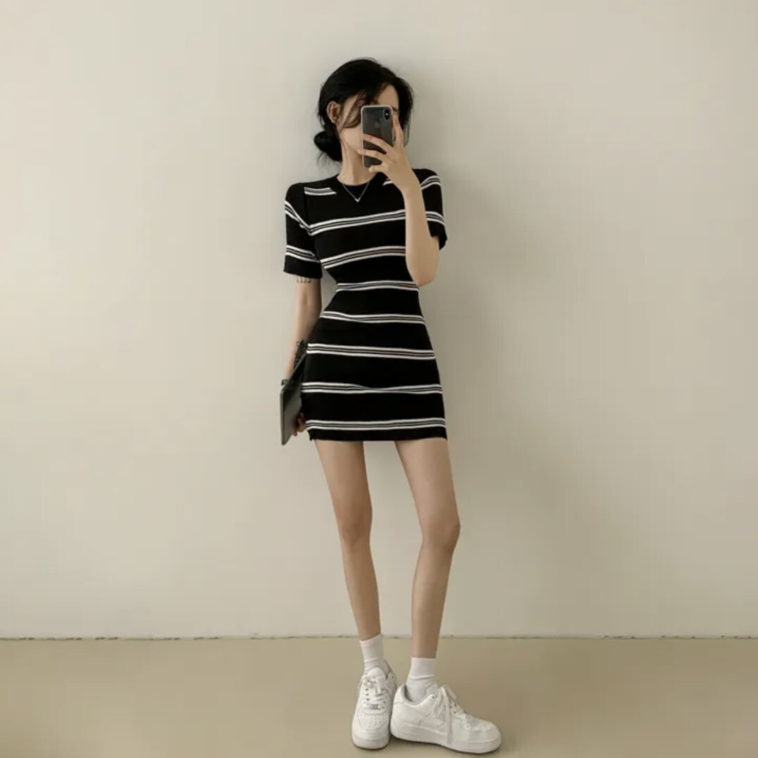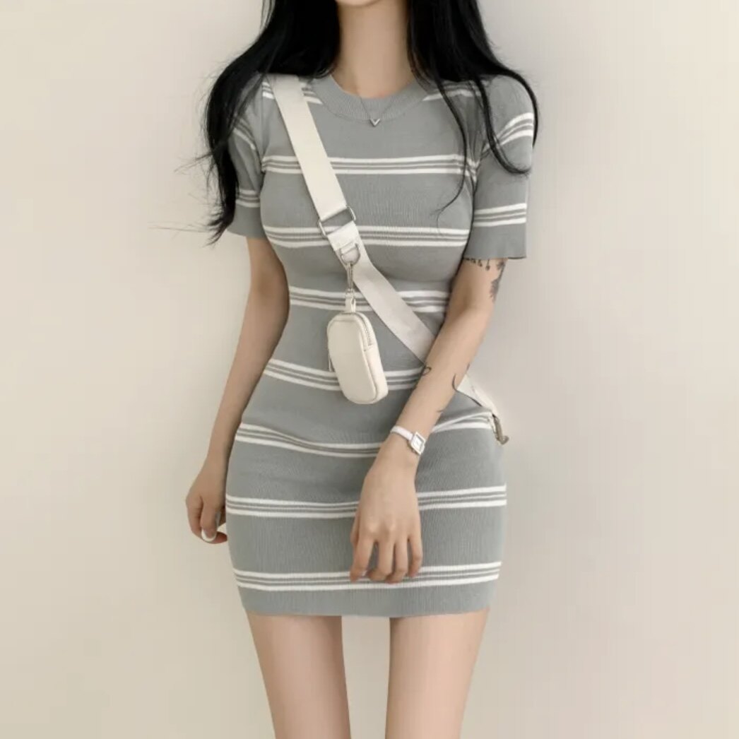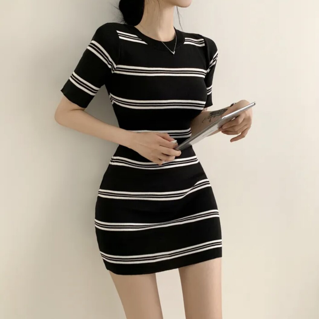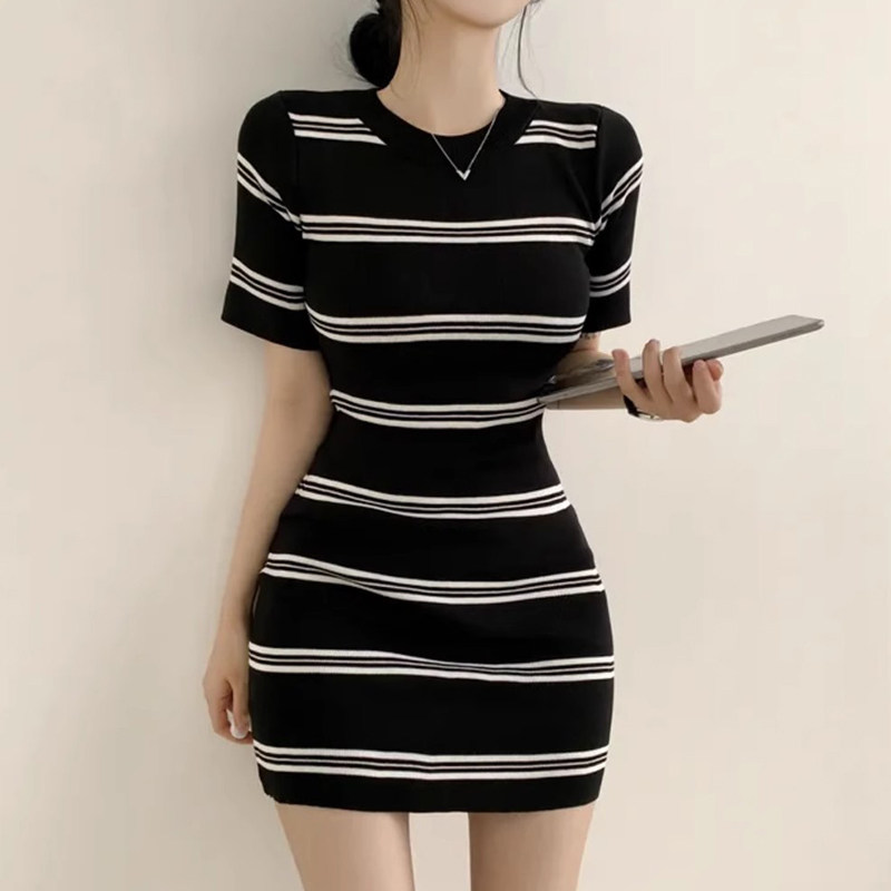 Летнее эластичное приталенное трикотажное платье, в корейском стиле, китайский стиль, с акцентом на бедрах