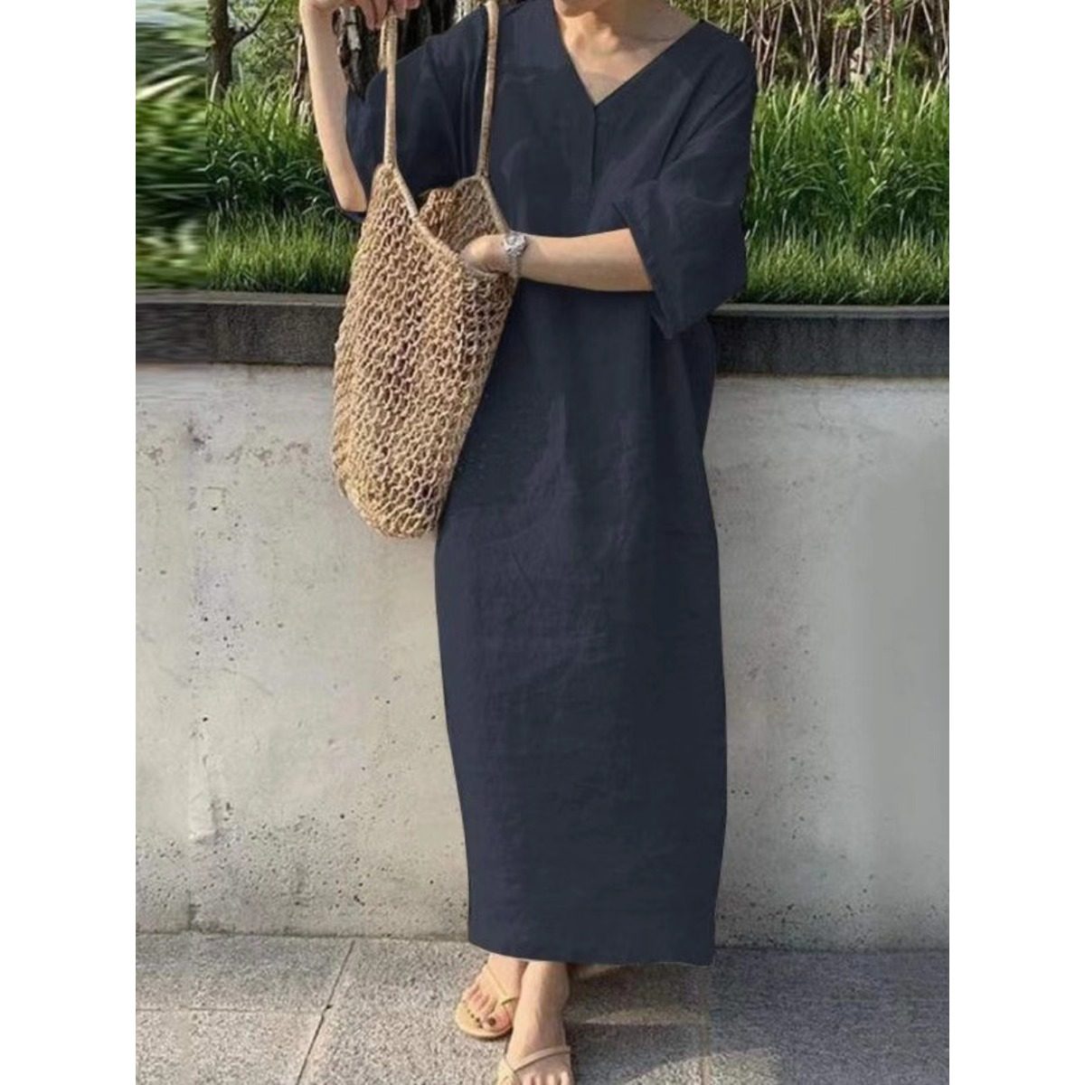 Летнее тонкое японское ретро платье, V-образный вырез, свободный крой, короткий рукав, с рукавом