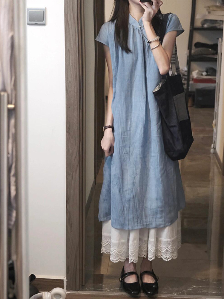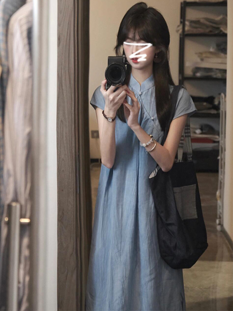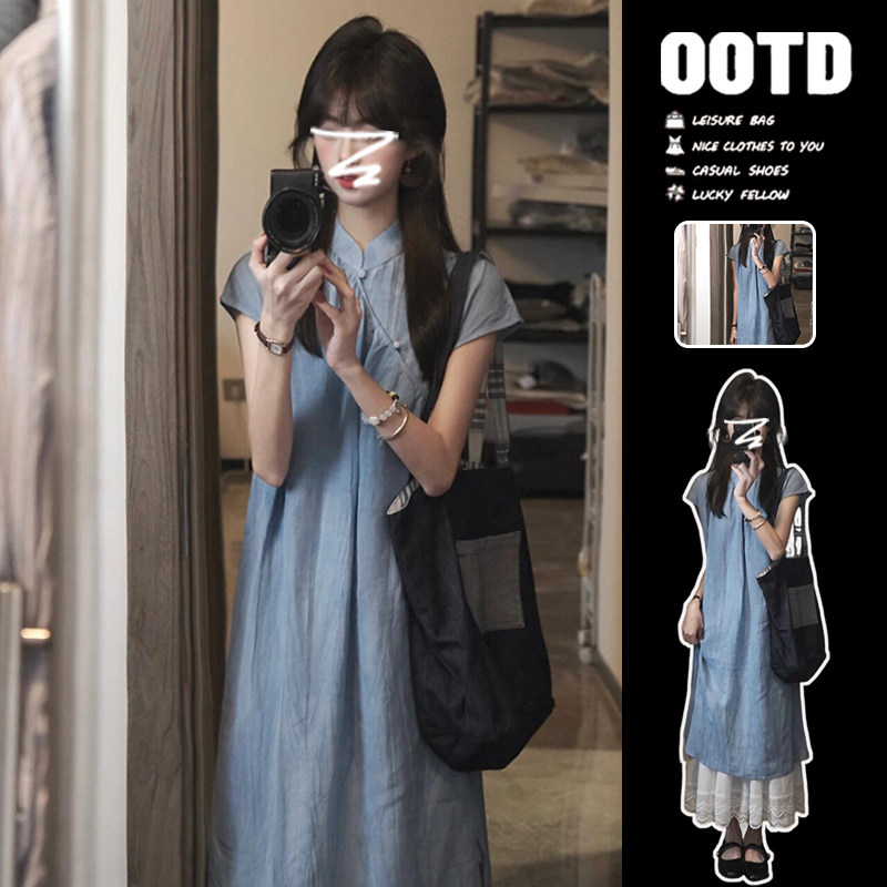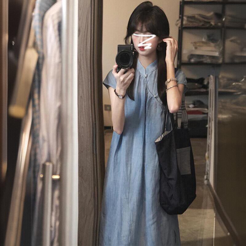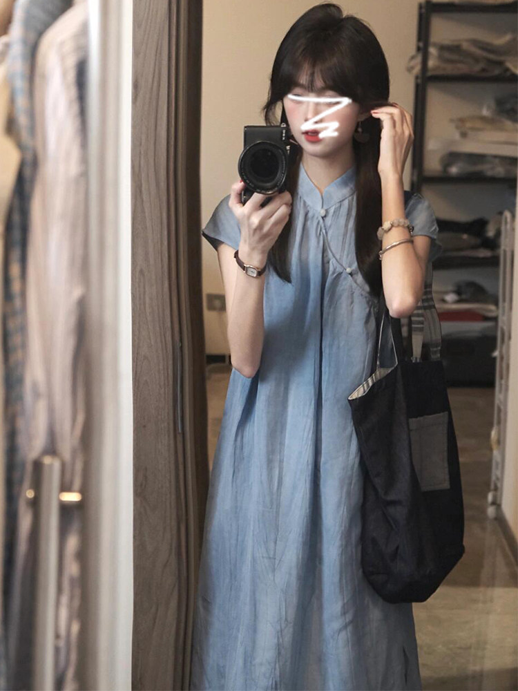 Синее летнее ципао, свадебное платье, комплект, длинная юбка, китайский стиль