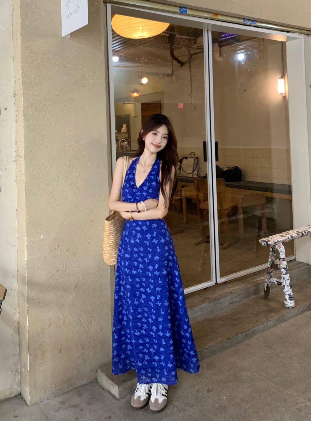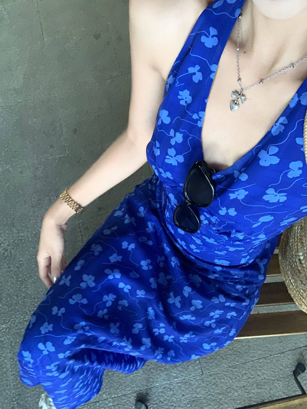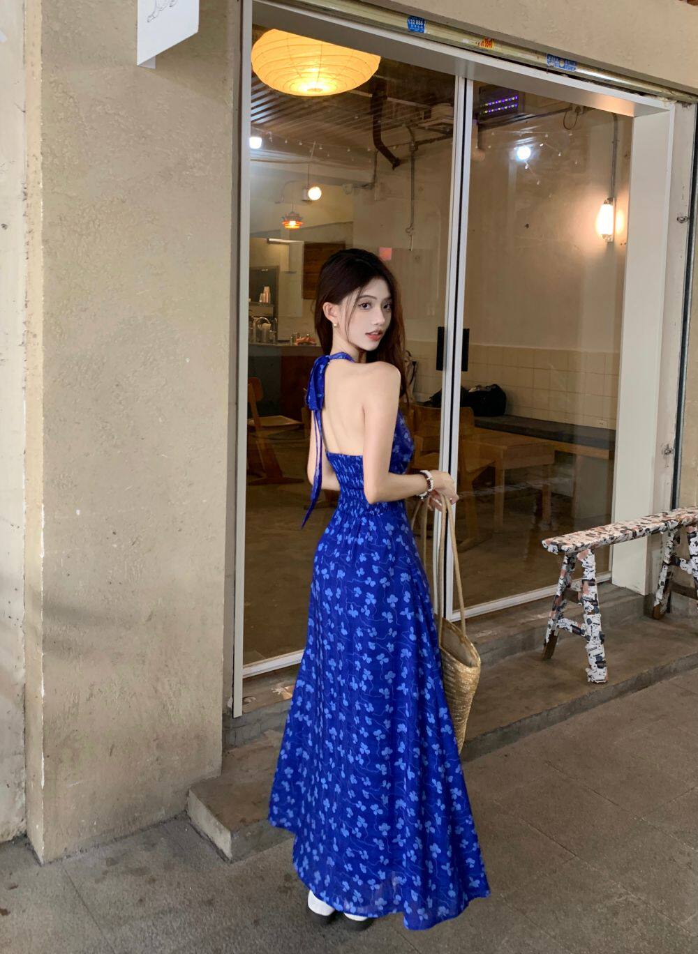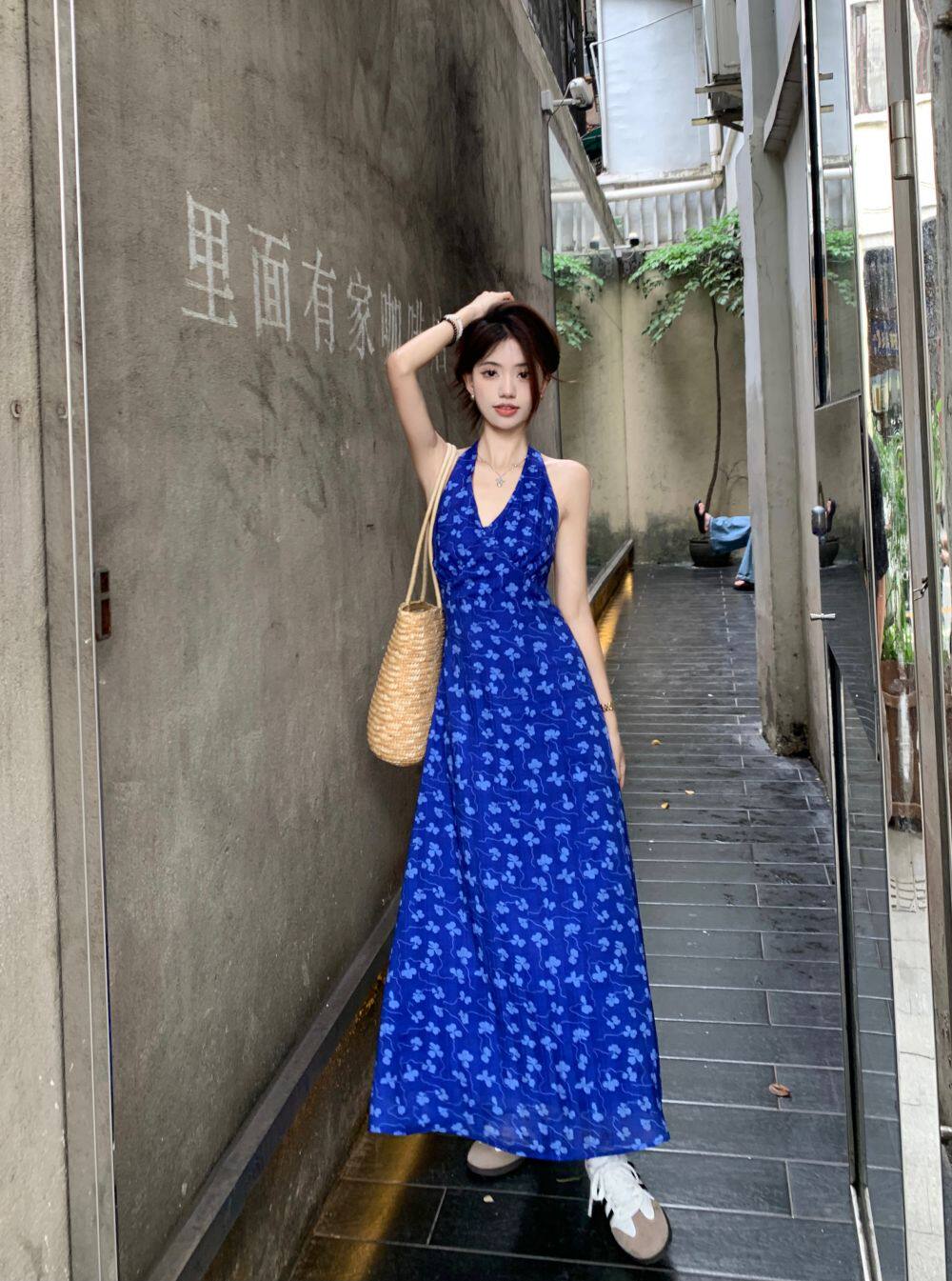 Синее платье, юбка, приталенный корсет, цветочный принт, V-образный вырез, французский стиль, с открытой спиной