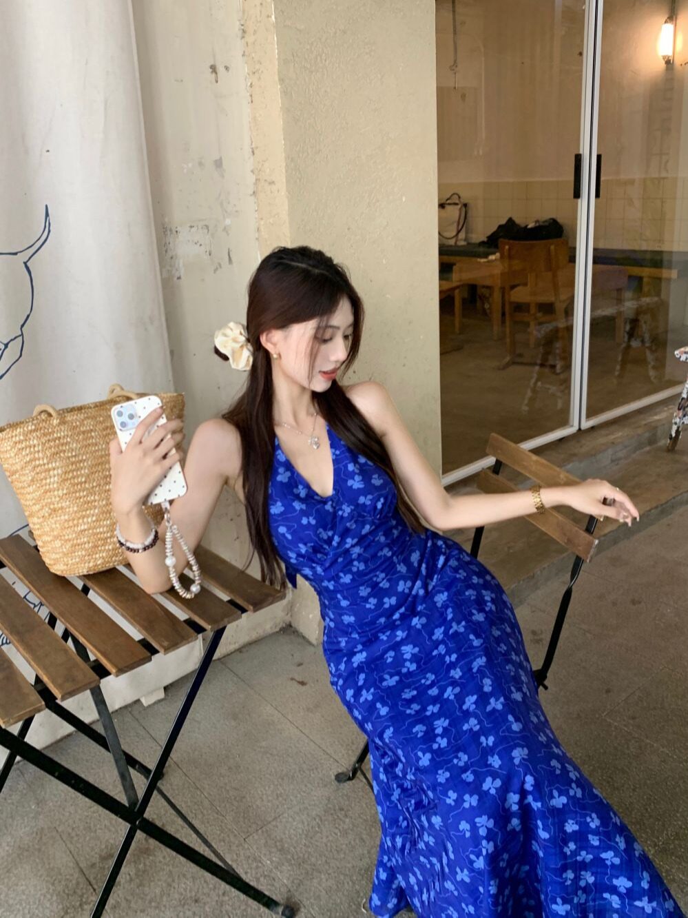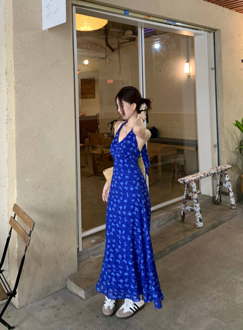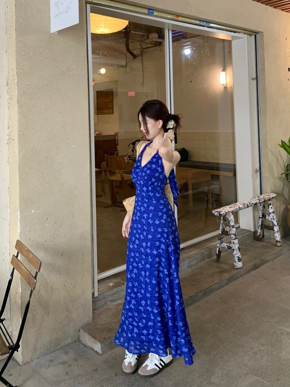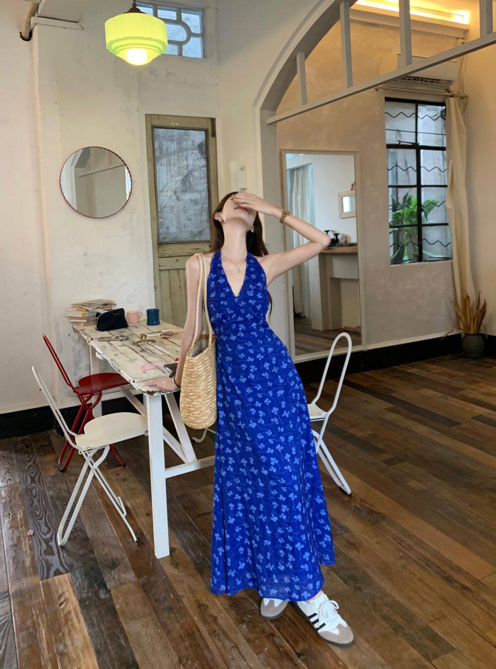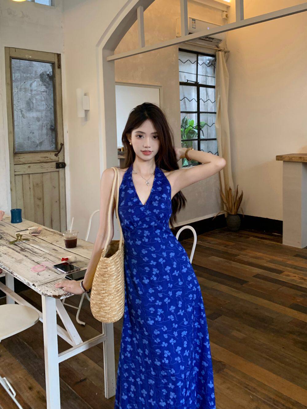 Синее платье, юбка, приталенный корсет, цветочный принт, V-образный вырез, французский стиль, с открытой спиной