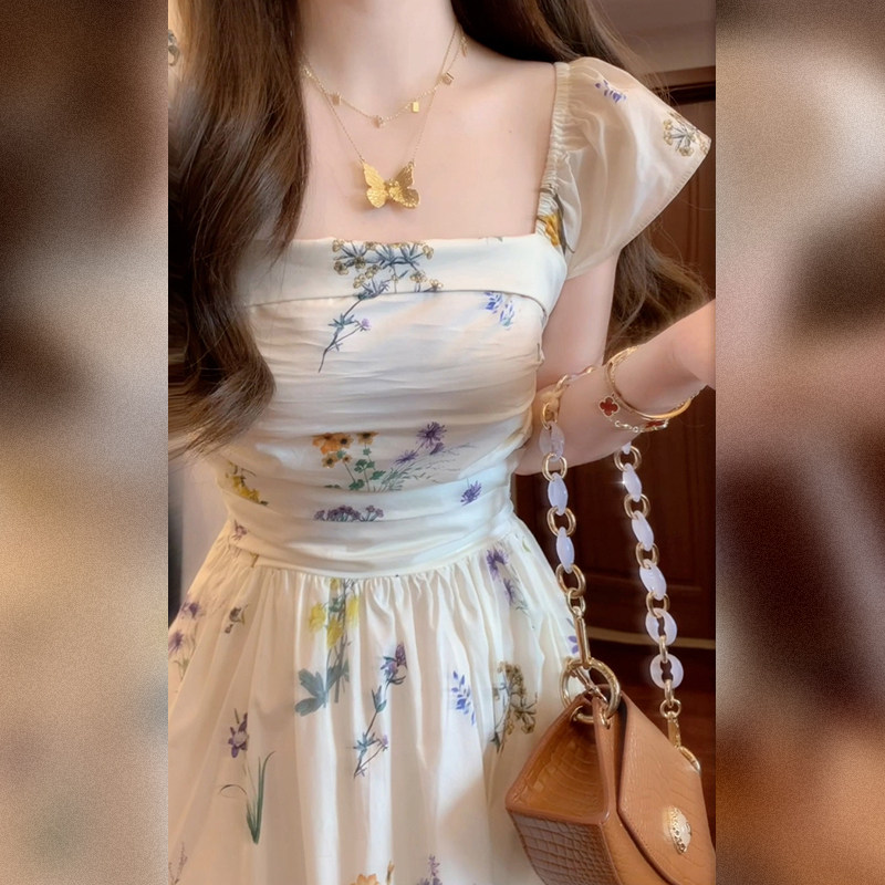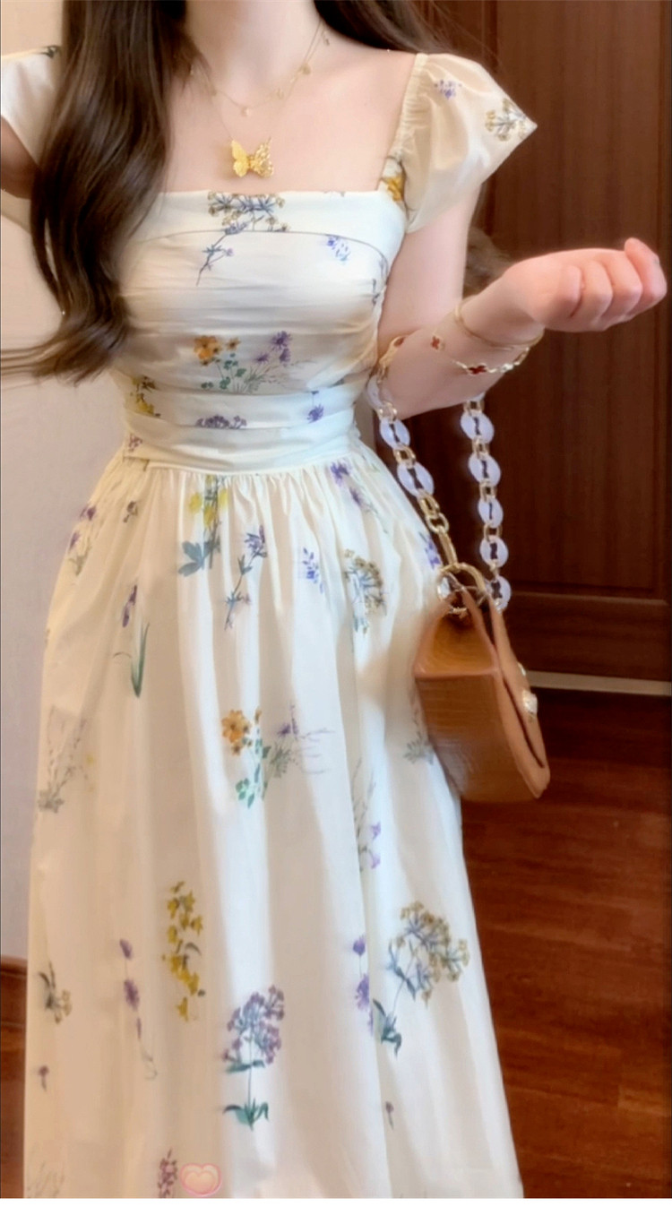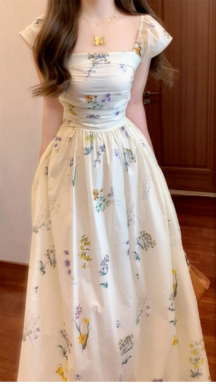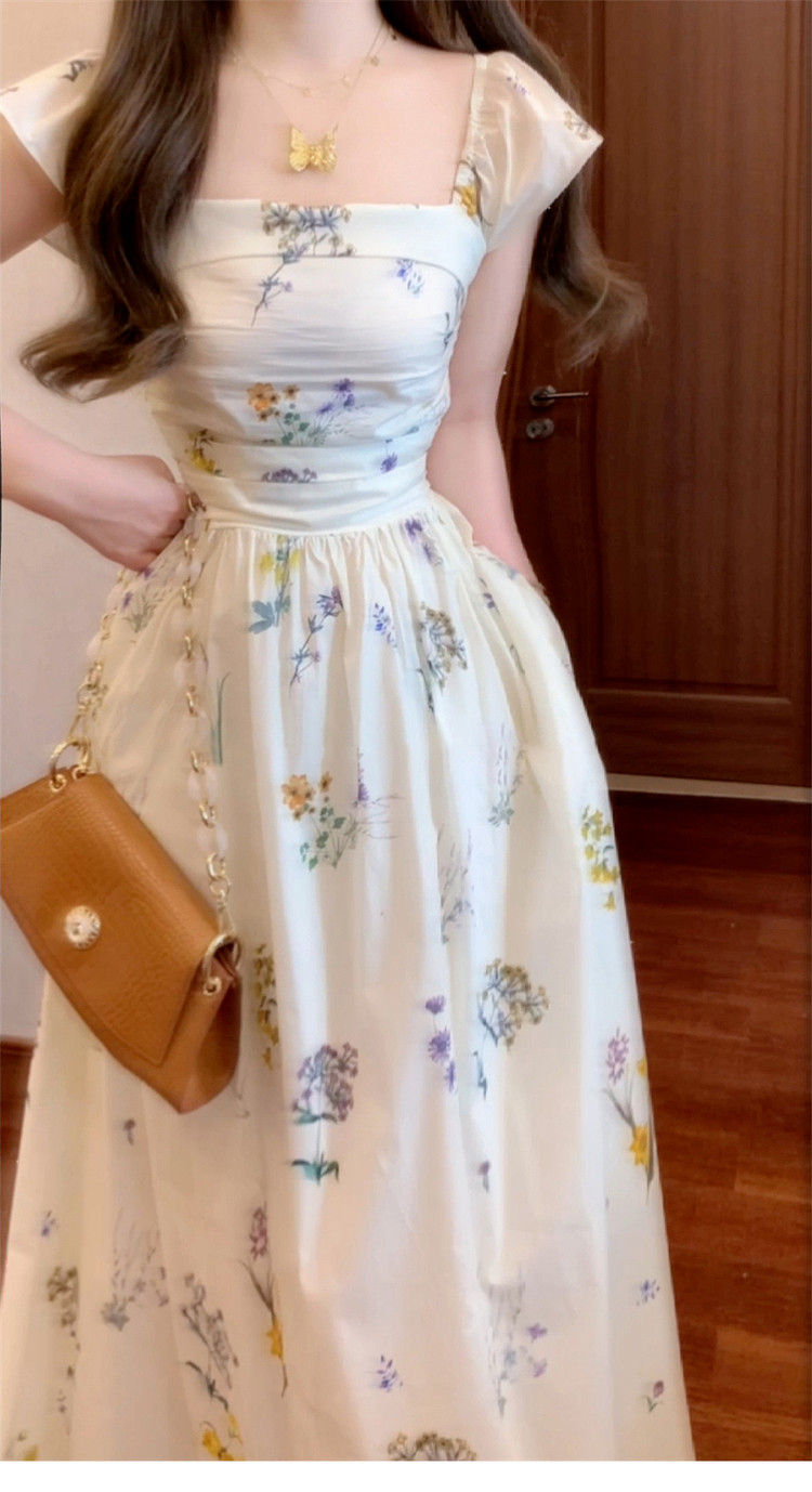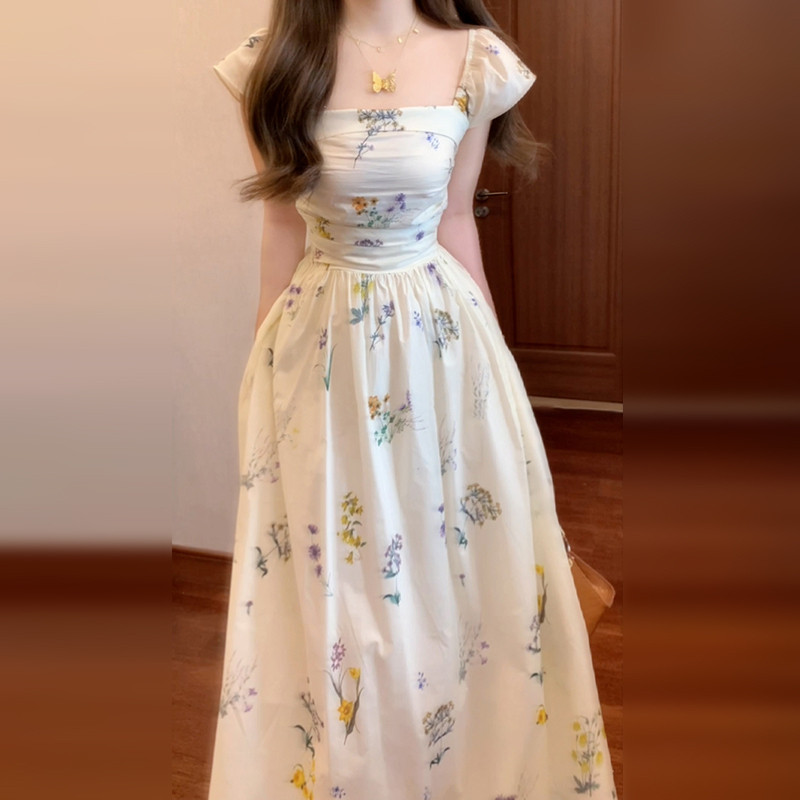 Летняя длинная юбка, белое платье, французский стиль, А-силуэт, квадратный вырез, цветочный принт