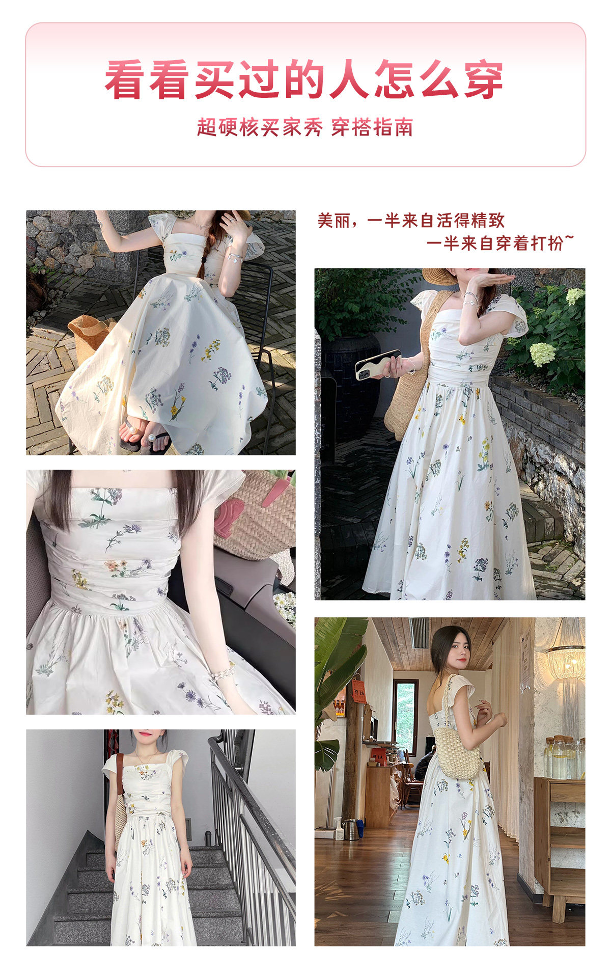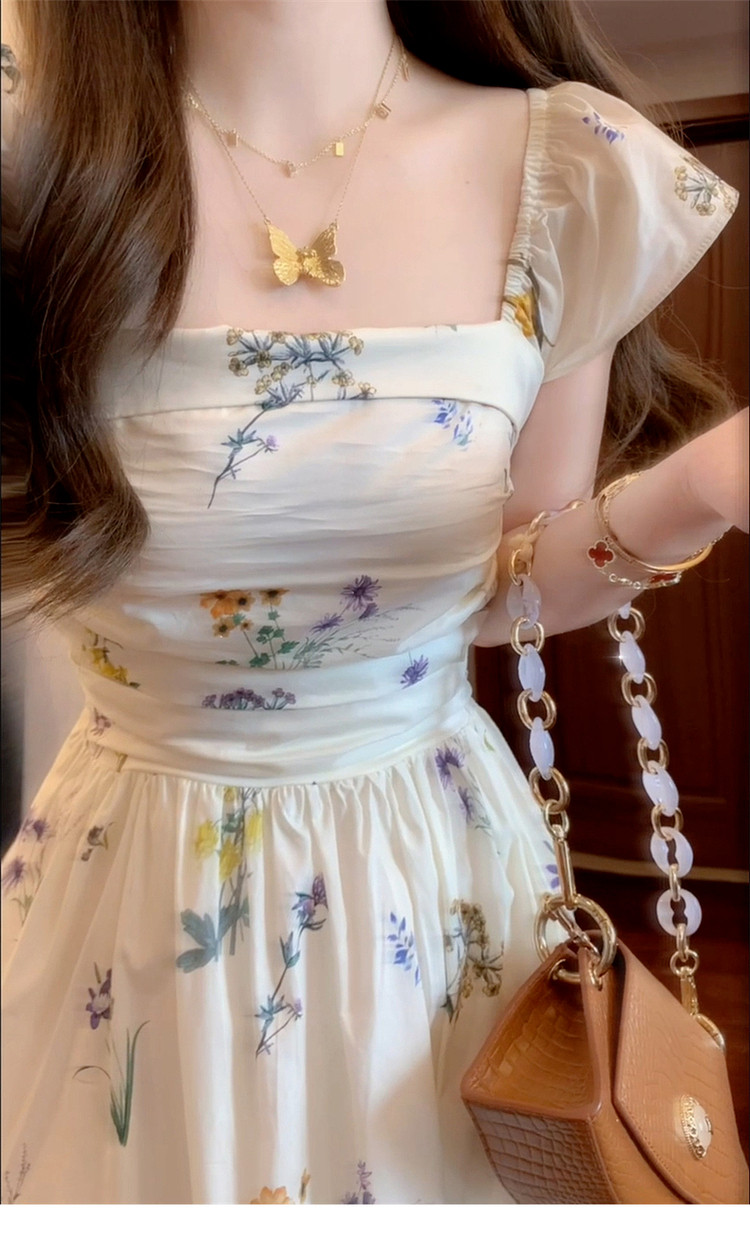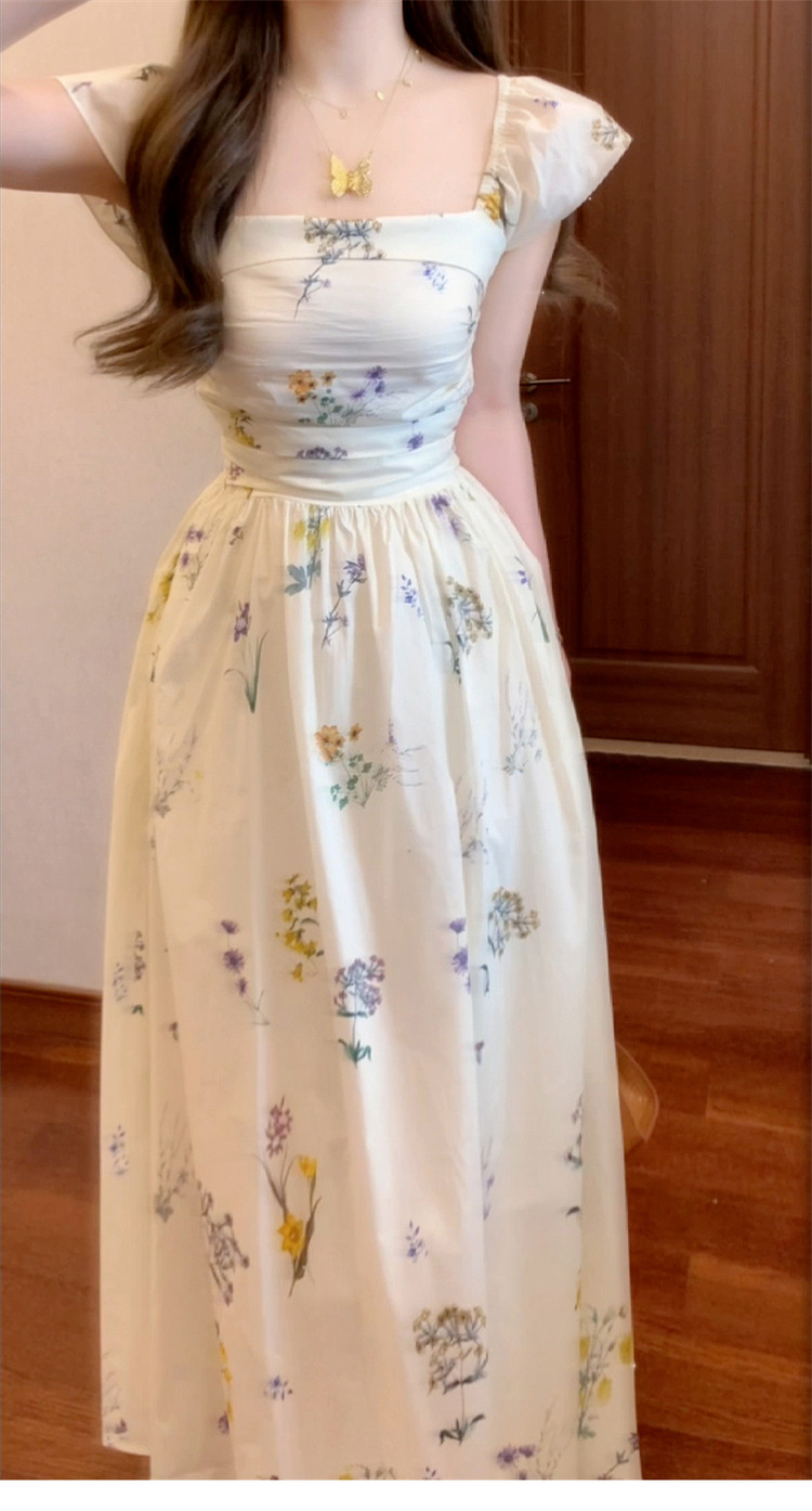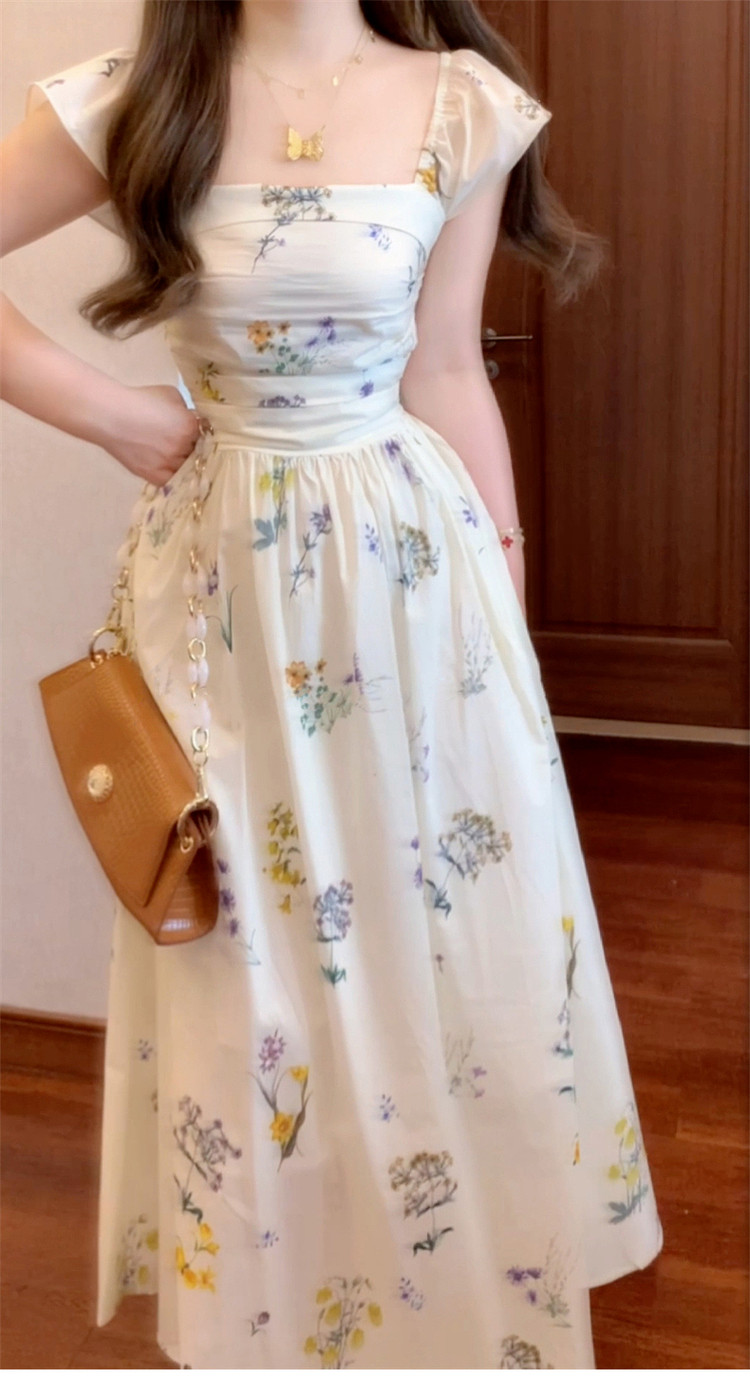 Летняя длинная юбка, белое платье, французский стиль, А-силуэт, квадратный вырез, цветочный принт