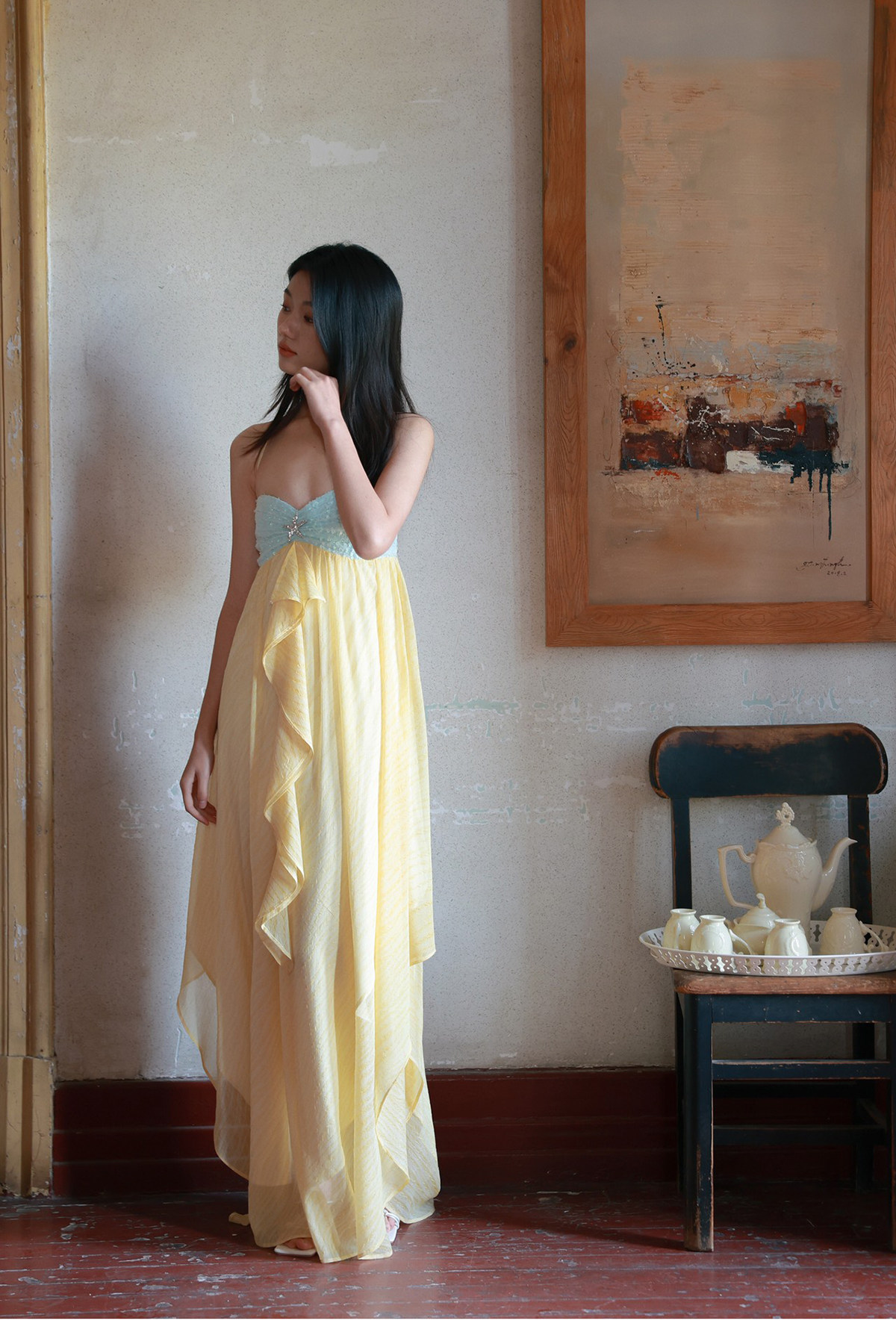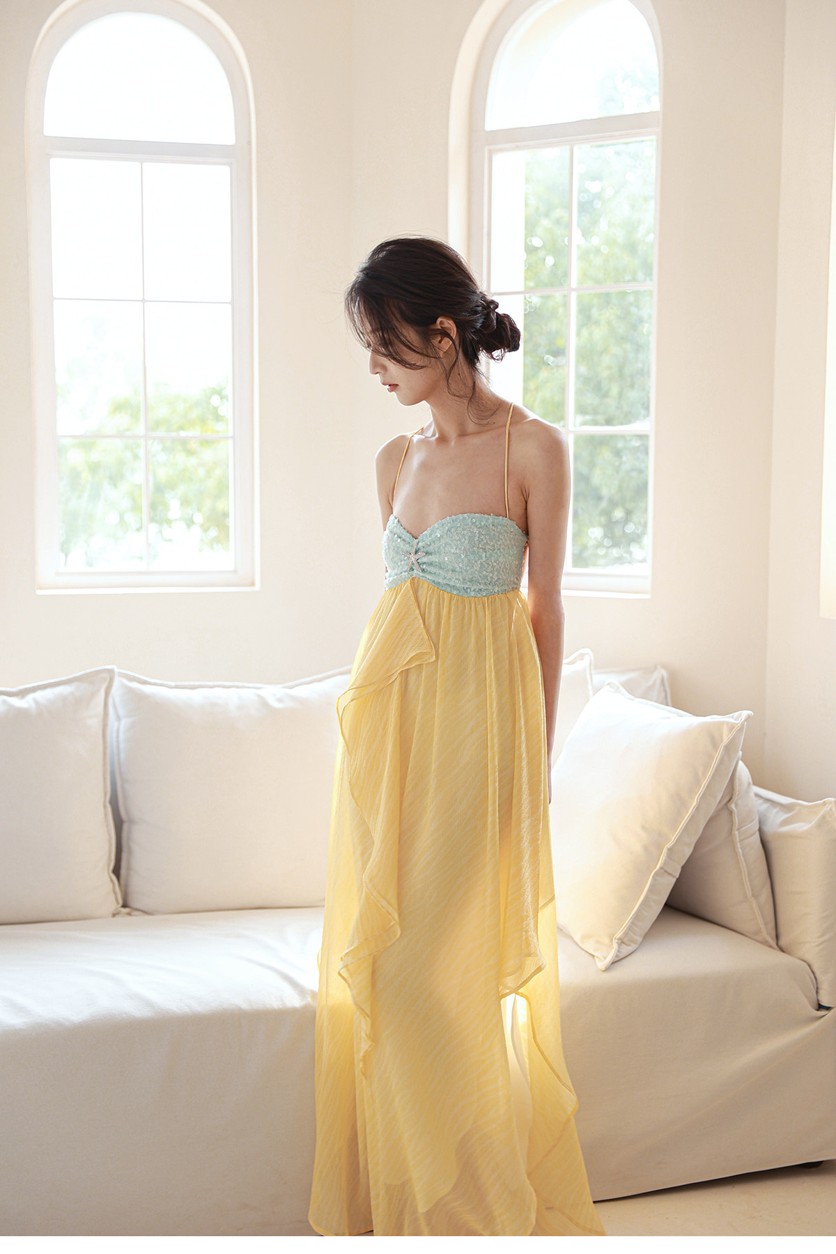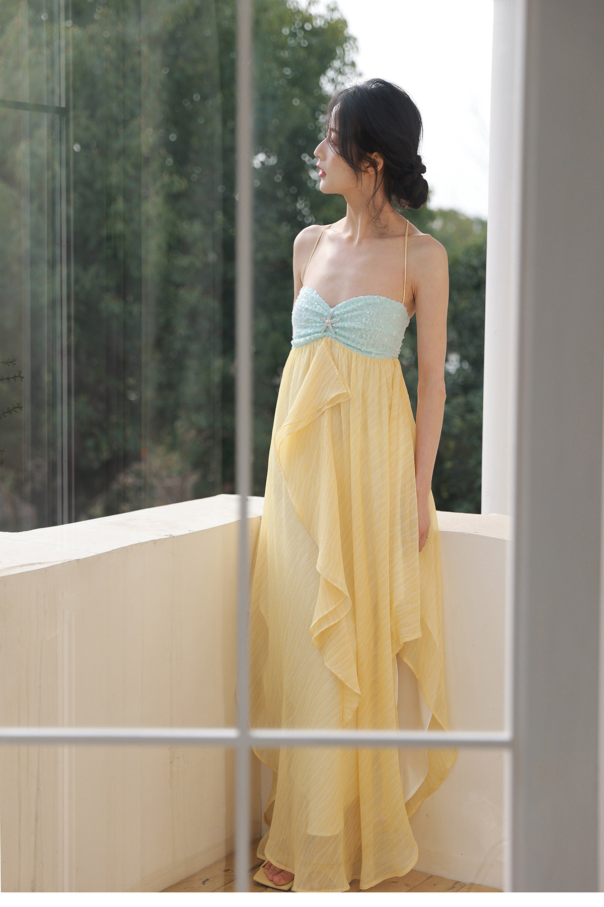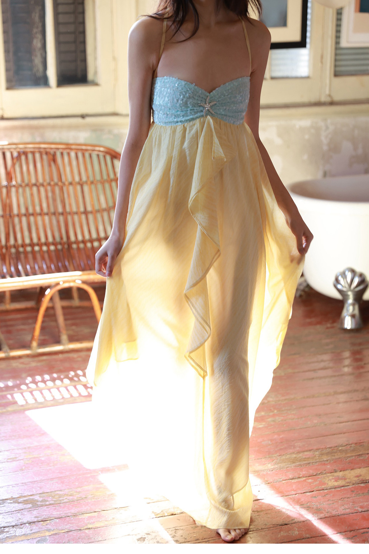 Moodxmiura Платье желтое шифоновое звездочное бриллиант с юбкой без спинки 2025 Spring New Missl Buyer Store